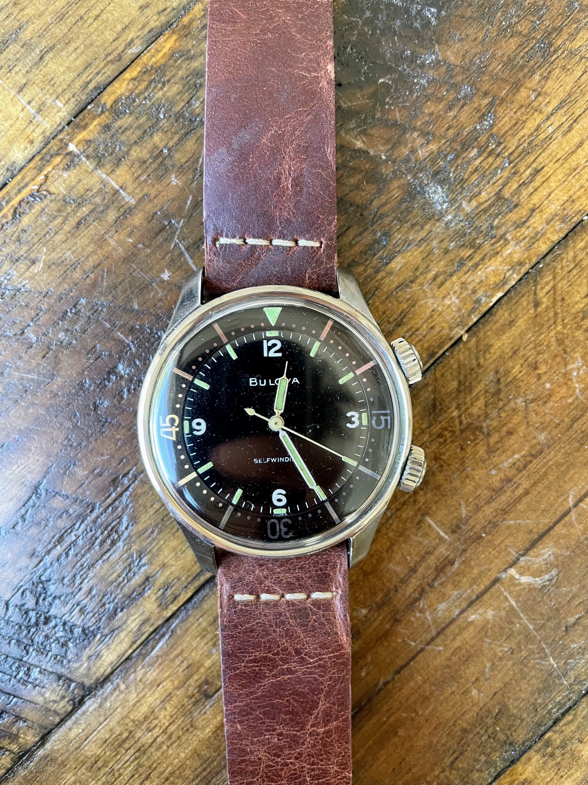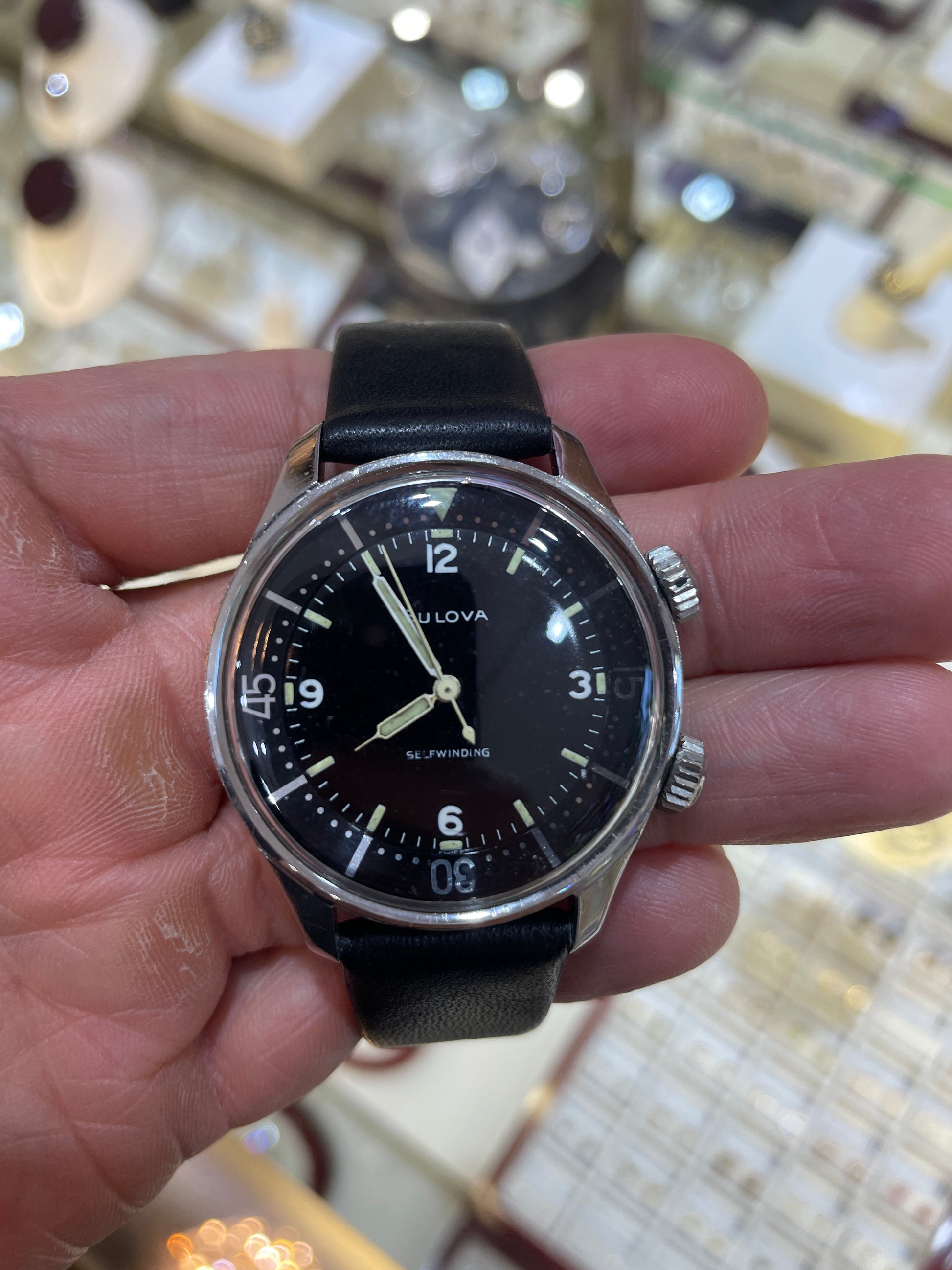 Case: The 36mm case shows wear commensurate with age; however it appears to not have been polished. Most wear can be observed on the caseback with superficial scratching throughout but nothing too deep. Both crowns are signed with bulova and are believed to be original.