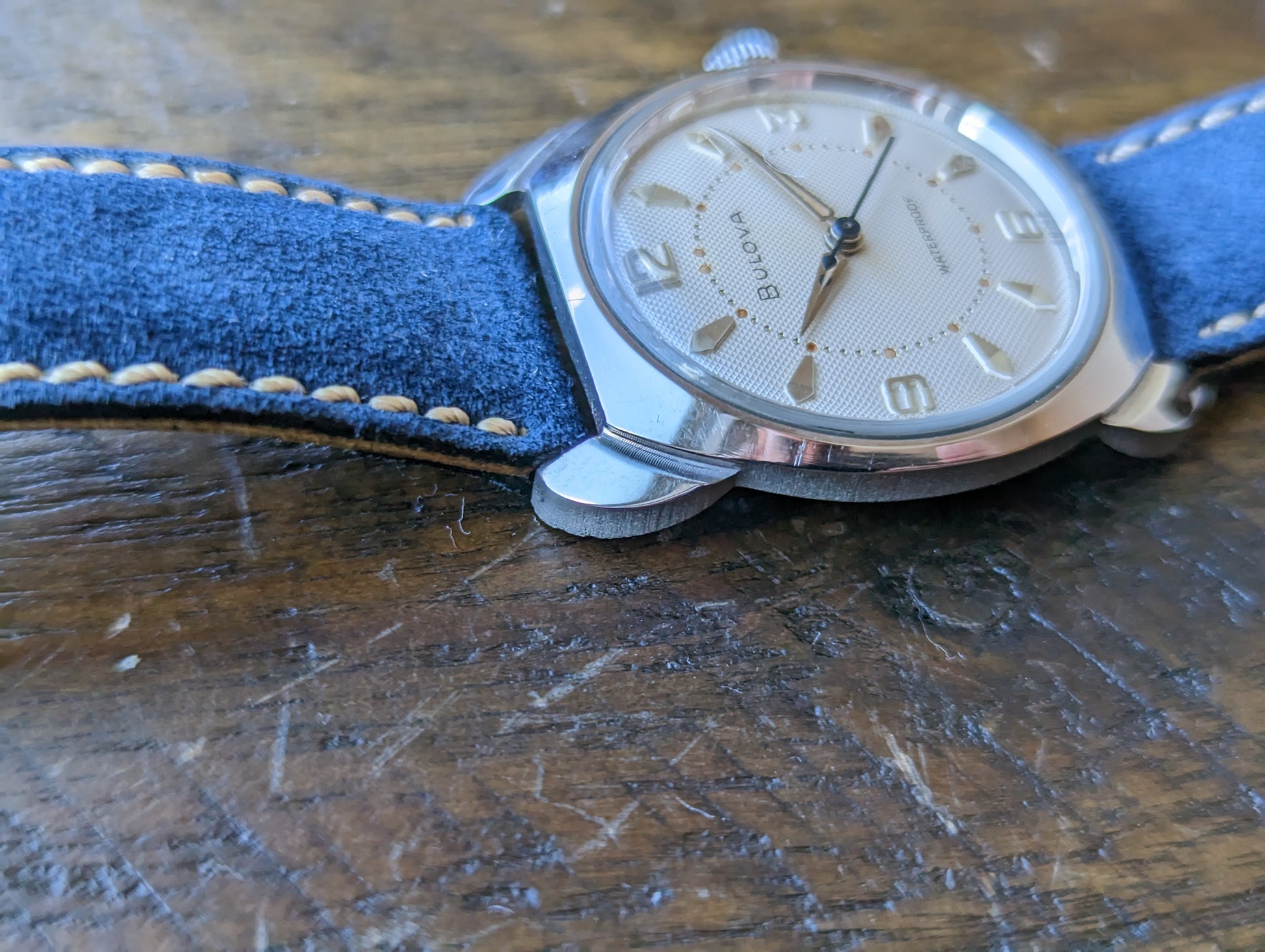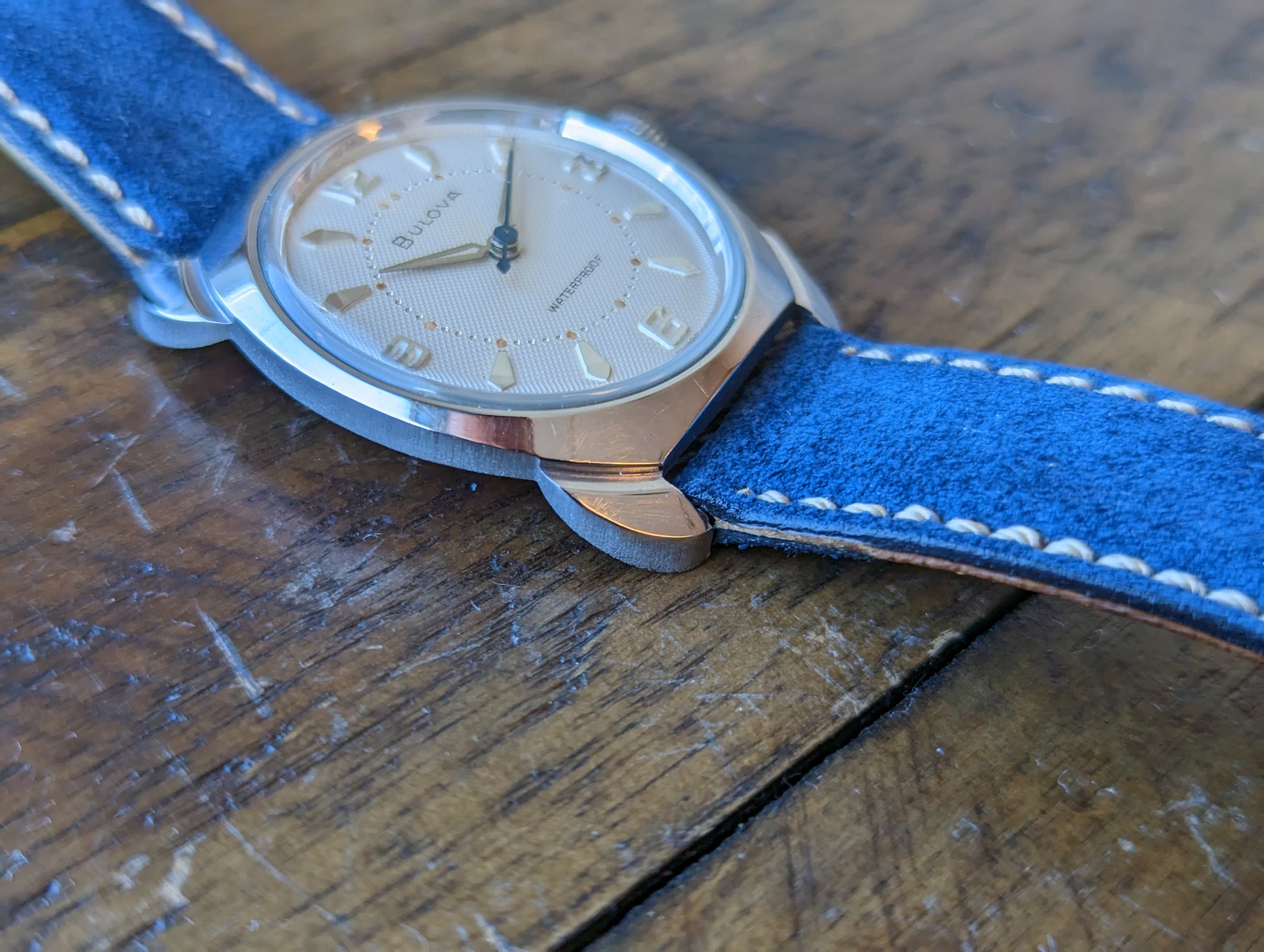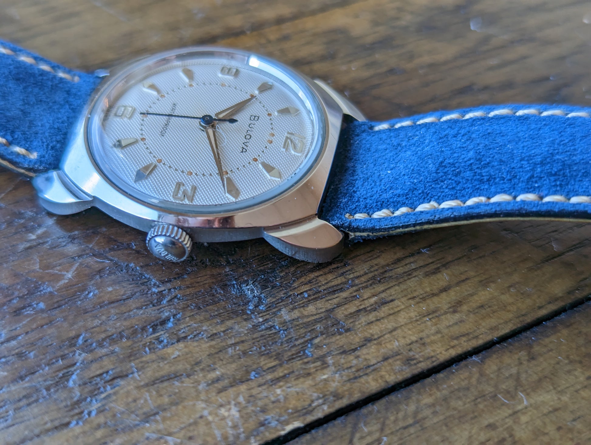 BRACELET: Blue suede Watch Gecko strap with cream stitching- this straps picks the blued second hand and cream dial- we just had to pair this strap with this watch