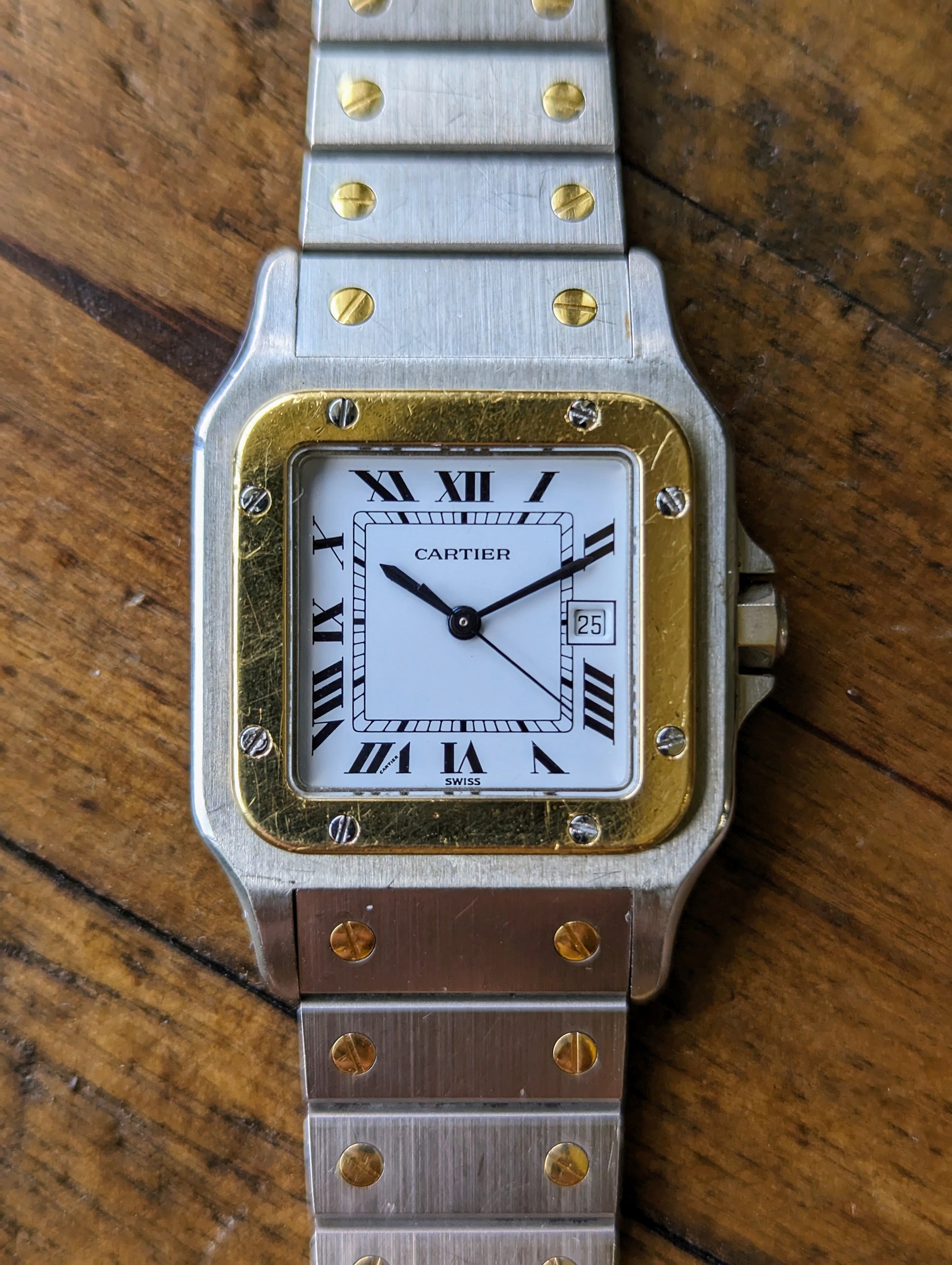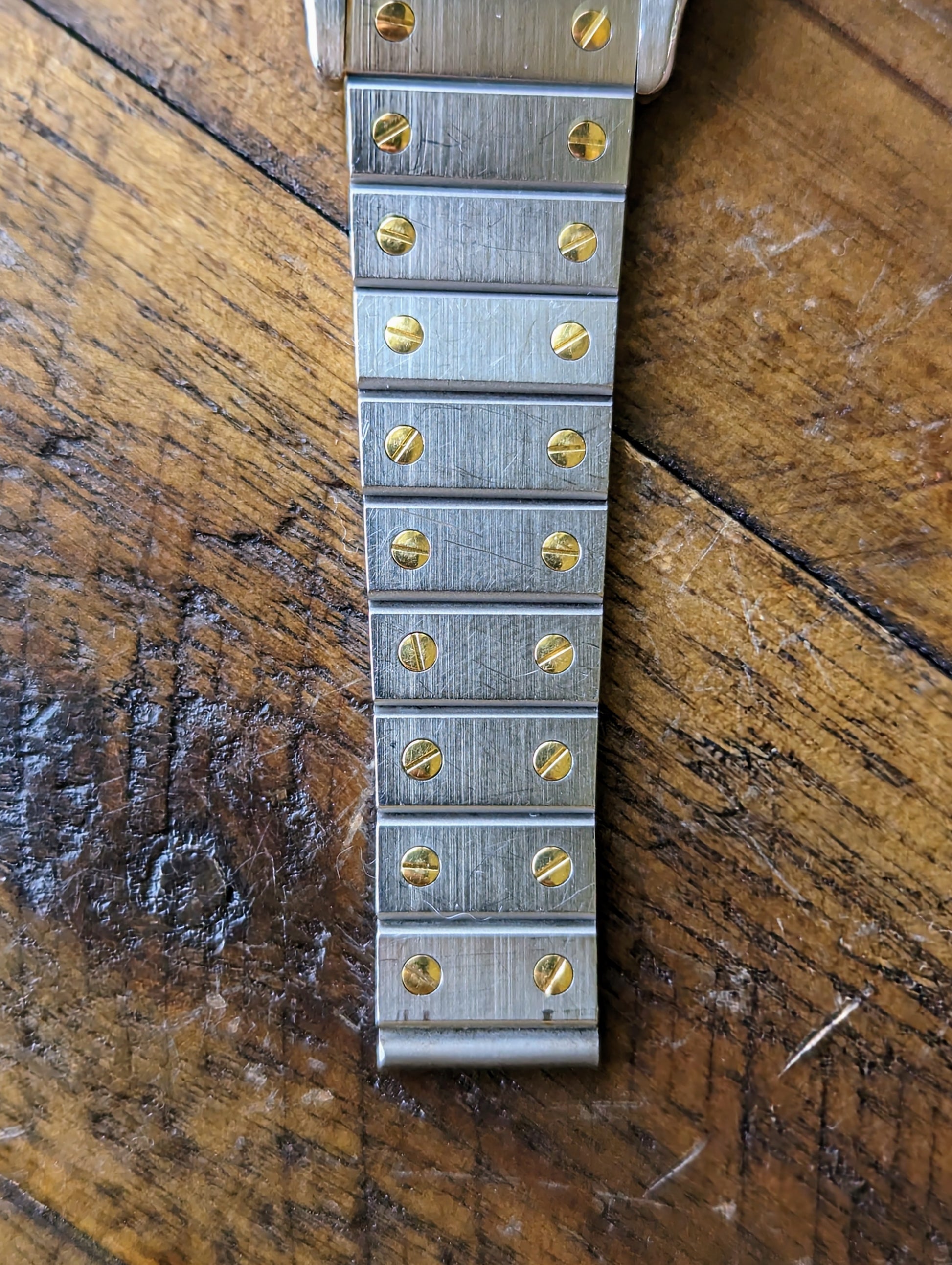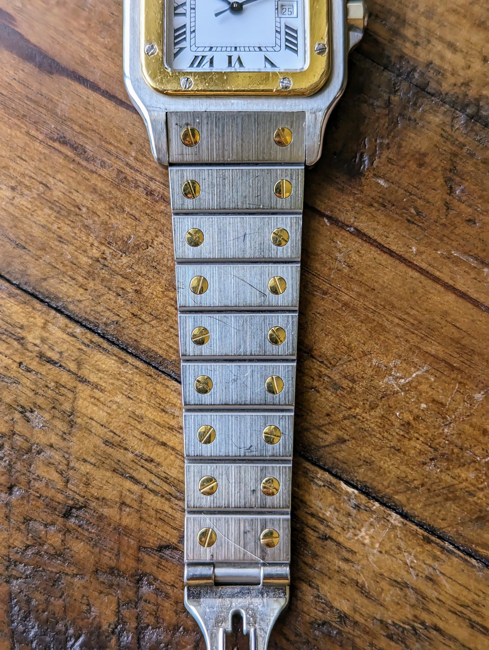 BRACELET: The original, two tone yellow gold and stainless steel bracelet was previously polished in the past. It still features a heavier grain finish on the links. It illustrates wear equal to that of the case. The bracelet fits a wrist up to a 6.25in wrist. More links can be sourced at cost. Just inquire!