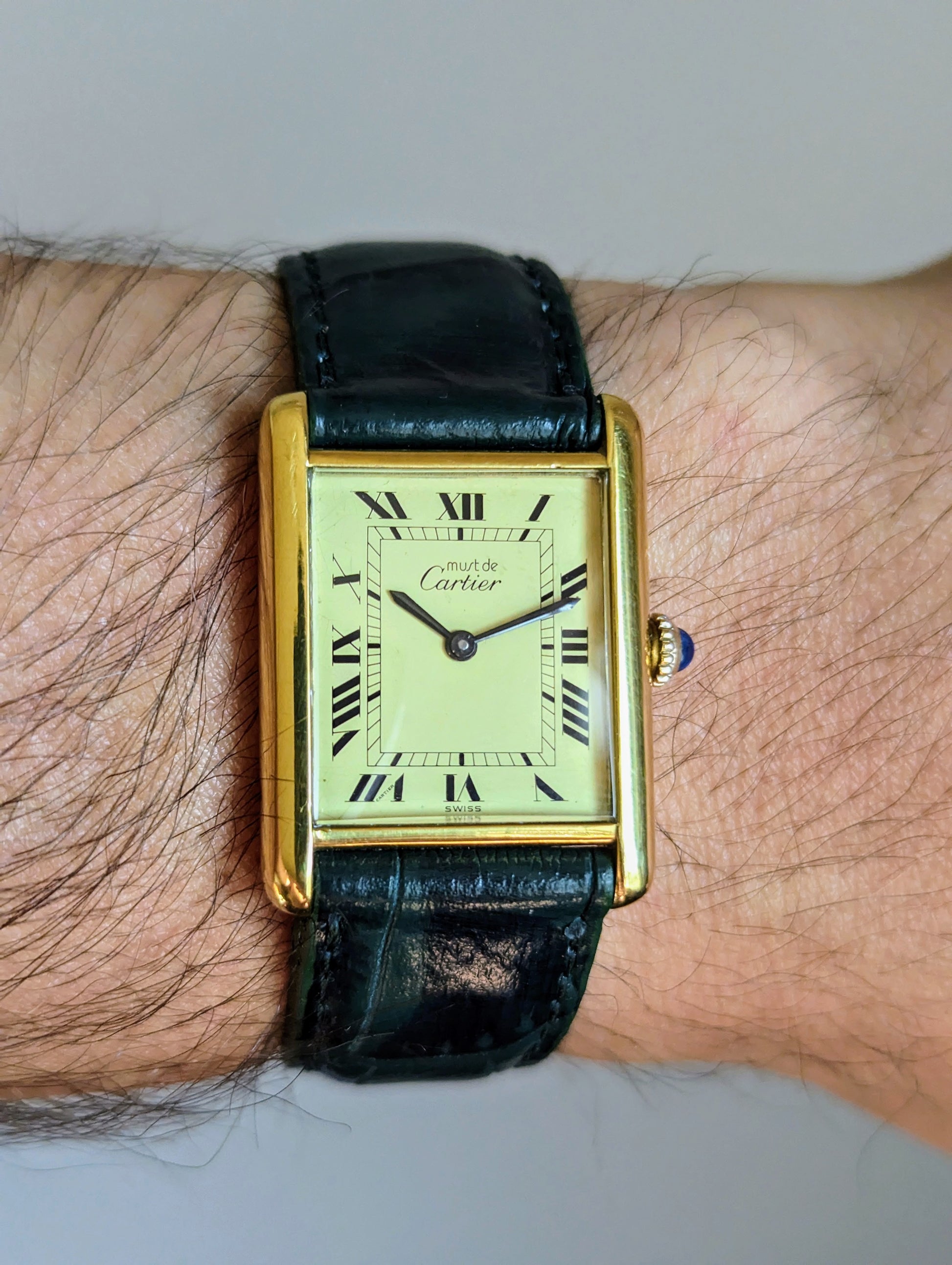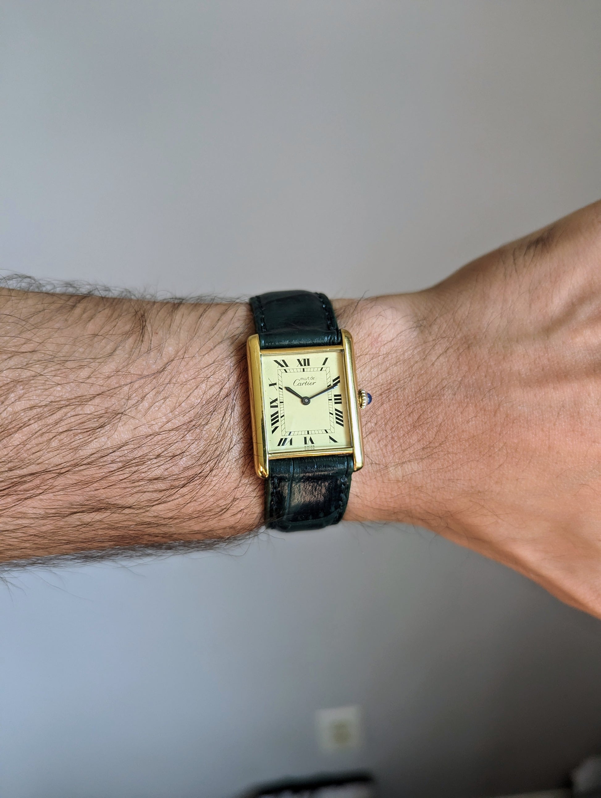 With the quartz crisis looming brands, including Cartier, had to get creative. From the brands inception through the mid 20th century, Cartier predominantly encased there watches in precious metals. As a means of lowering cost and therefor lowering the price point of entry into the prestigious brand, Cartier launched the Tank "Vermeil." It involved a process by which gold was plated on top of a sterling silver base. Less precious metal coupled either a handwound movement (ETA based) or Quartz further reduced production costs allowing for a more accessible price point for the masses.