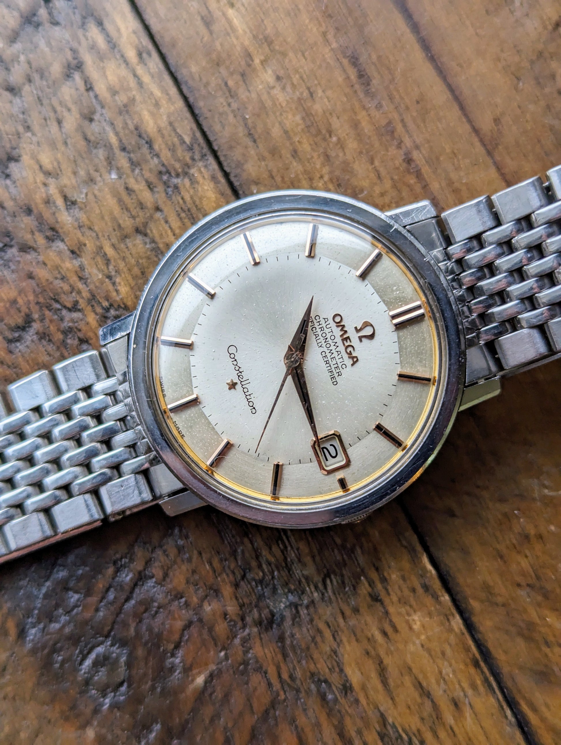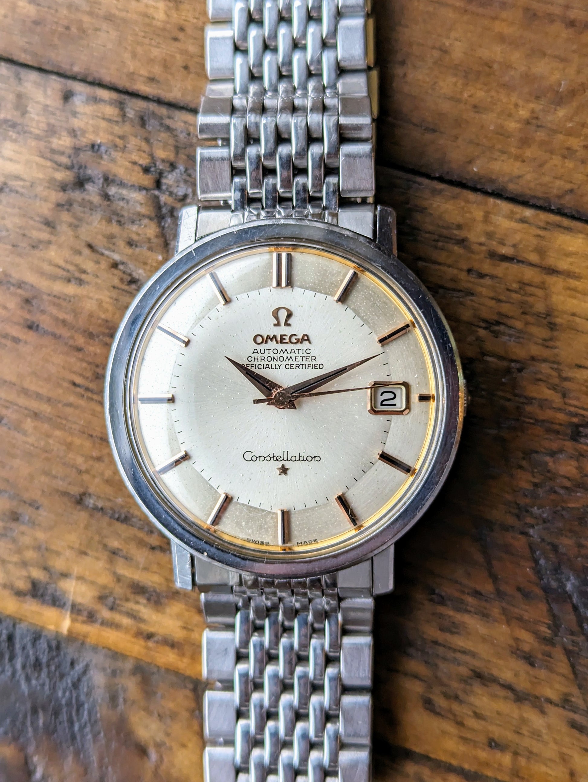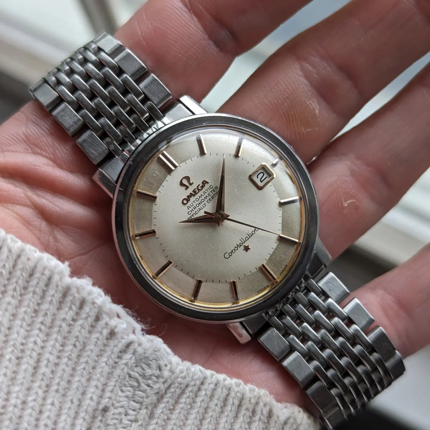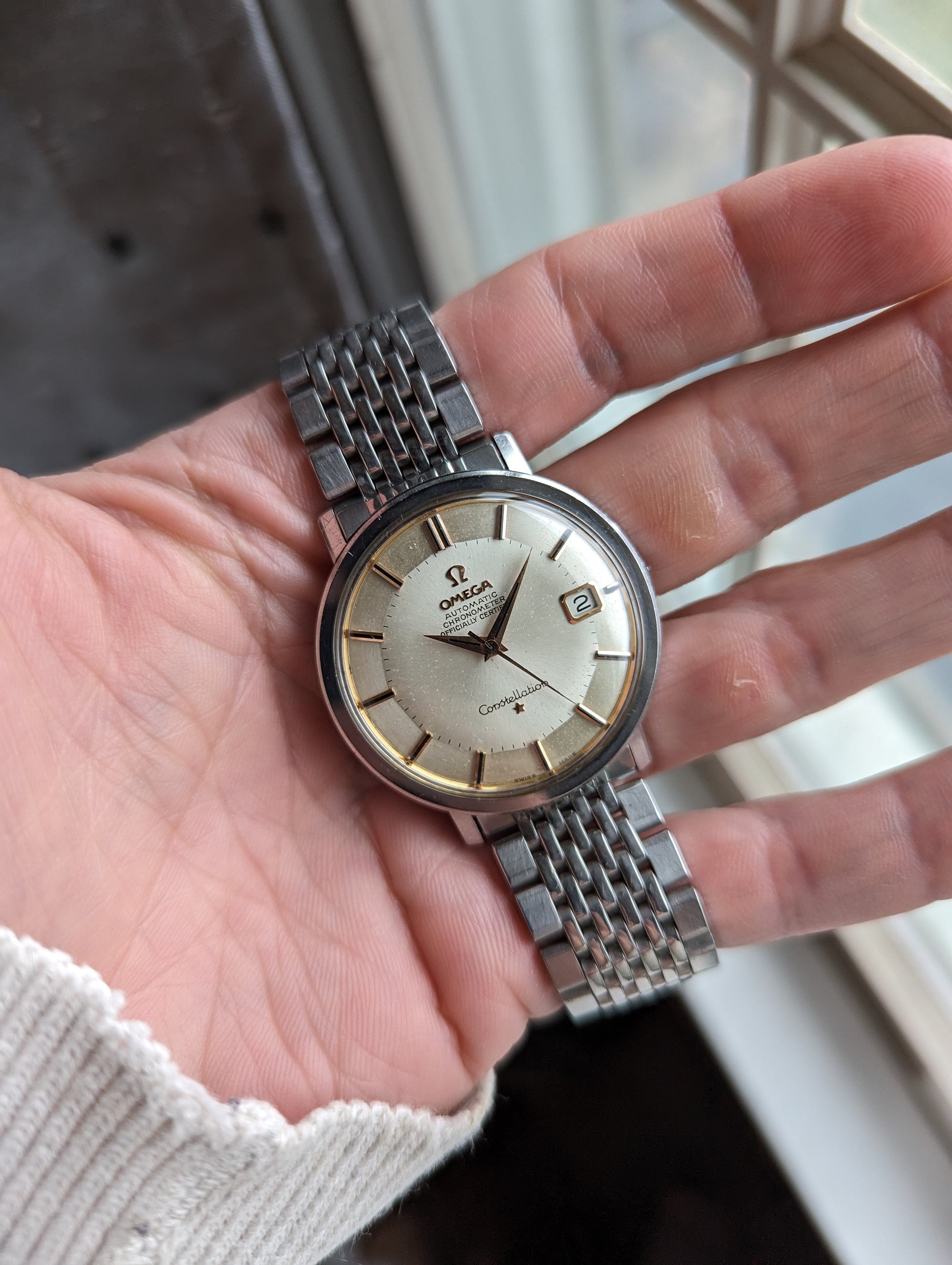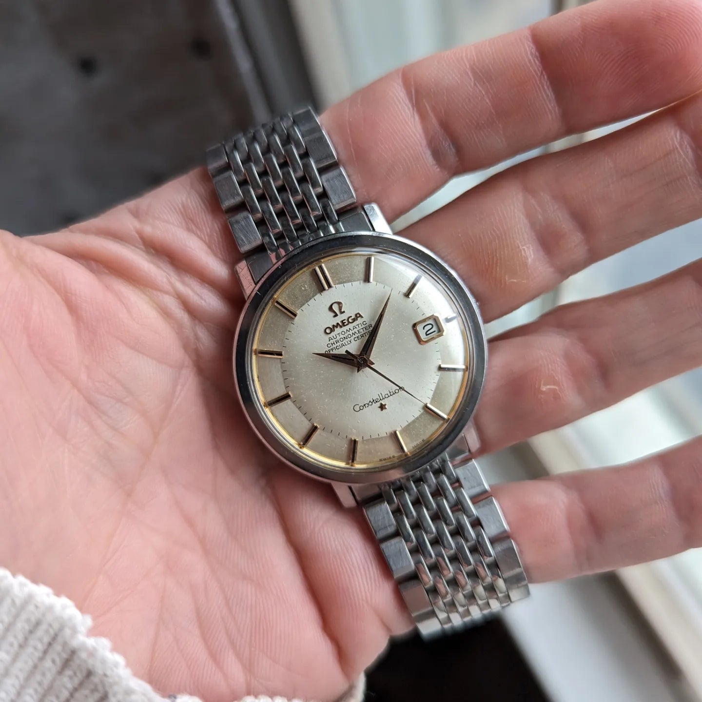 This vintage Omega Constellation reference 168.004 is an interesting watch. The case was designed in a way that the crown is almost hidden behind the watches bezel giving it a unique look and presence on the wrist. There were many dial configurations throughout the production of this reference, one of which was a pie pan dial. This is important to note as the actual diameter of the dial makes this the largest vintage pie pan that Omega ever manufactured.