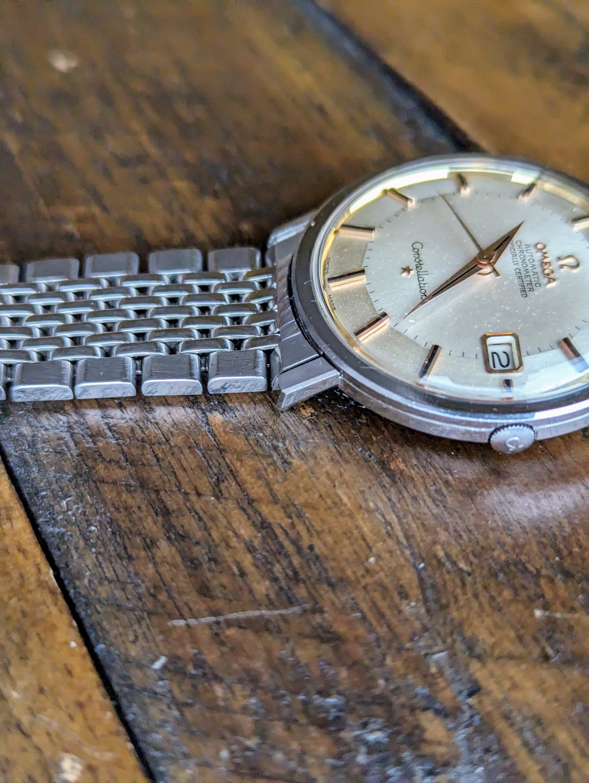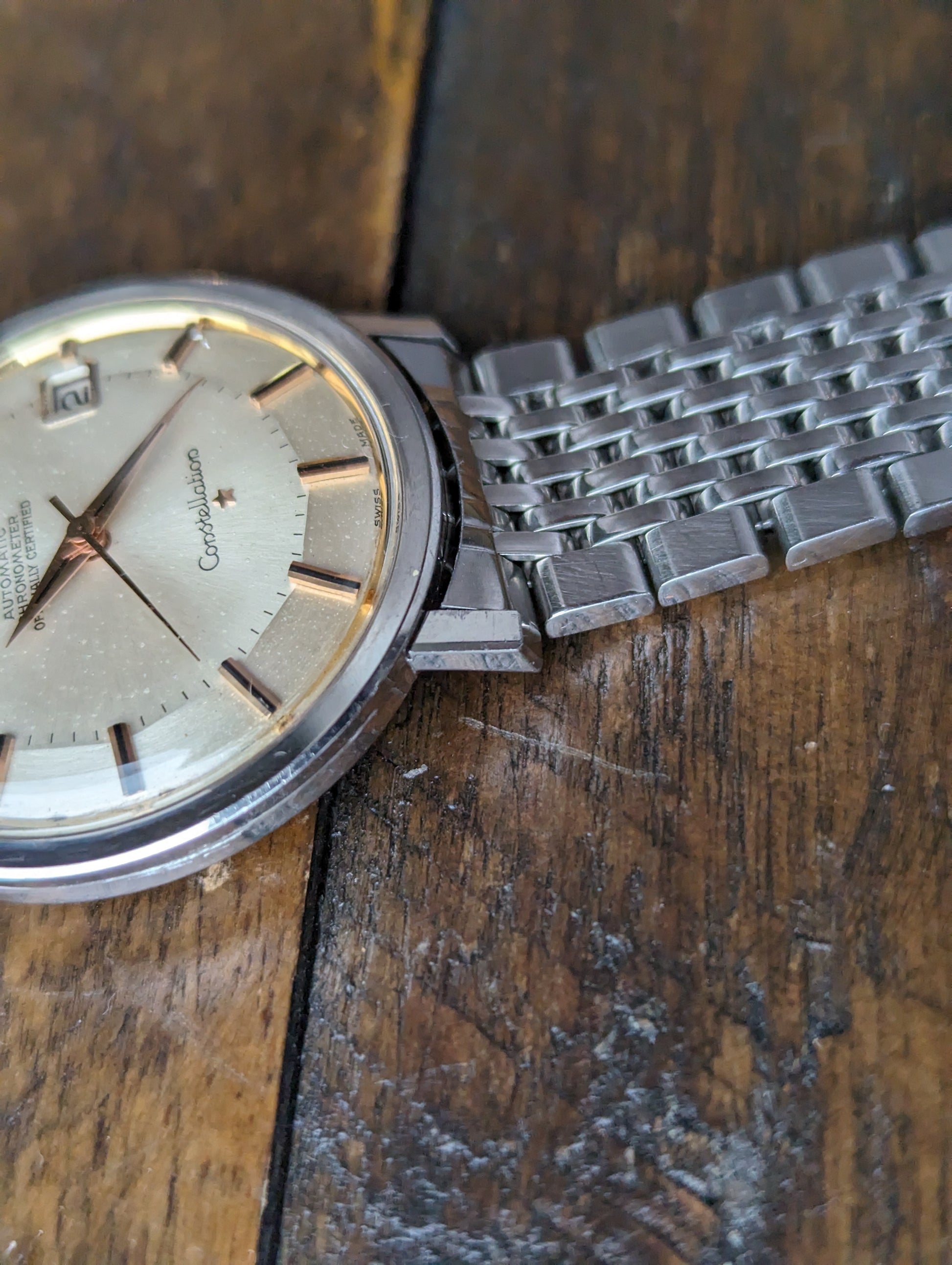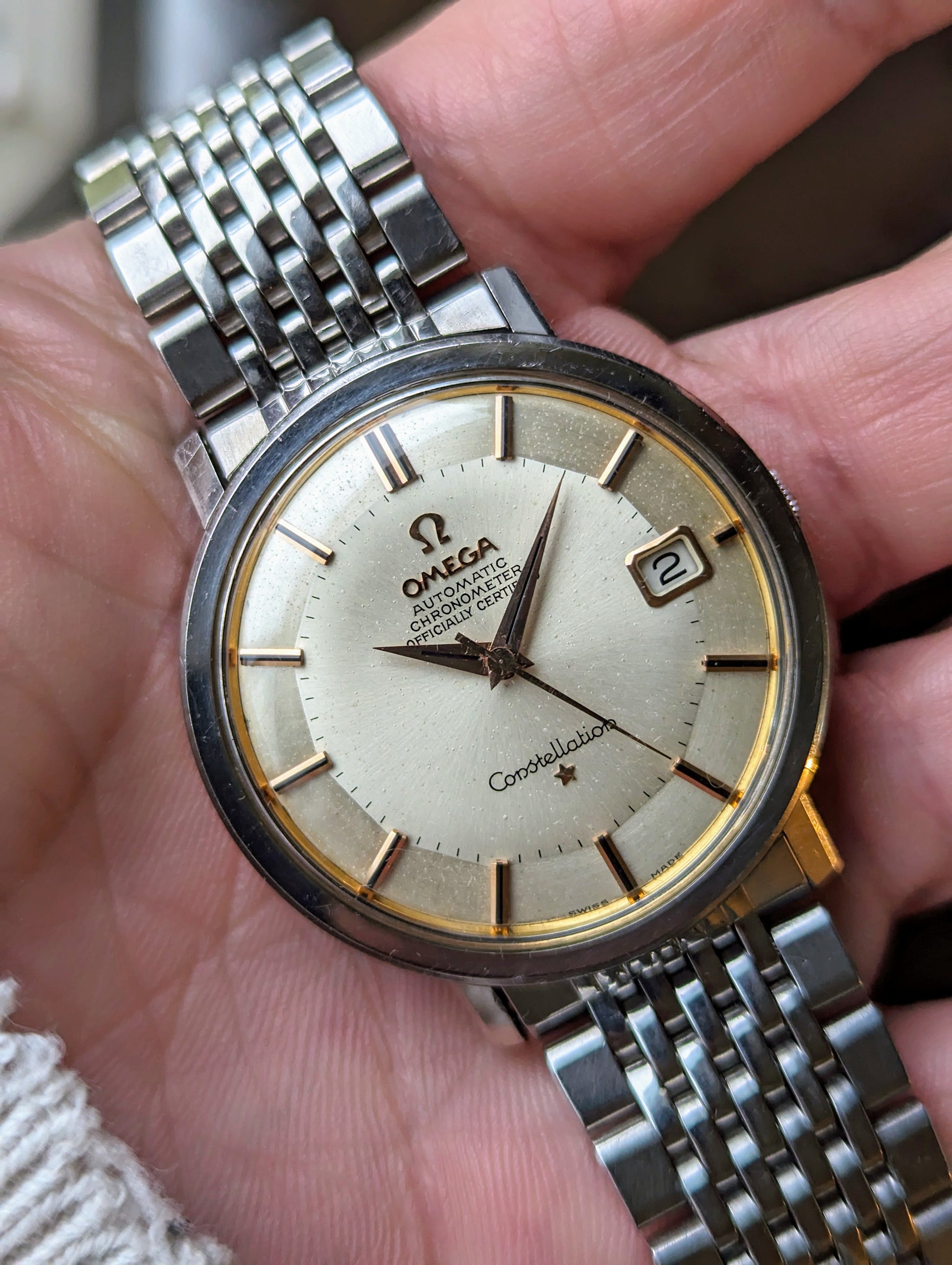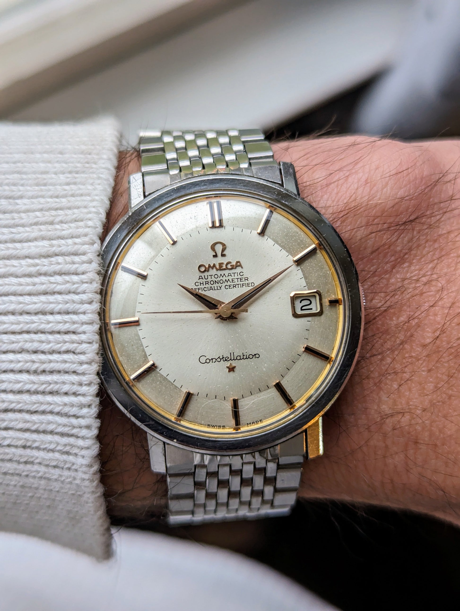 This vintage Omega Constellation reference 168.004 is an interesting watch. The case was designed in a way that the crown is almost hidden behind the watches bezel giving it a unique look and presence on the wrist. There were many dial configurations throughout the production of this reference, one of which was a pie pan dial. This is important to note as the actual diameter of the dial makes this the largest vintage pie pan that Omega ever manufactured.