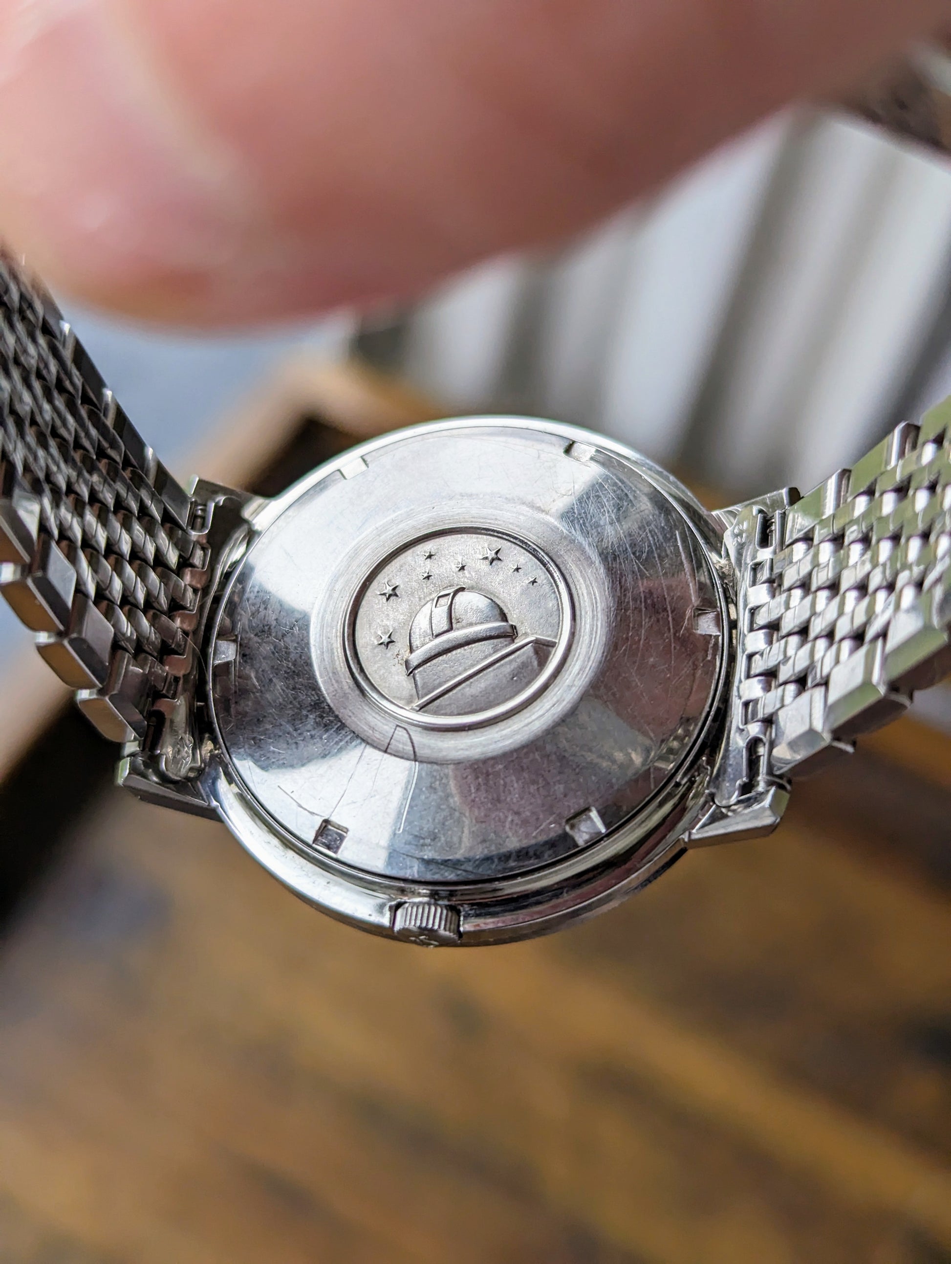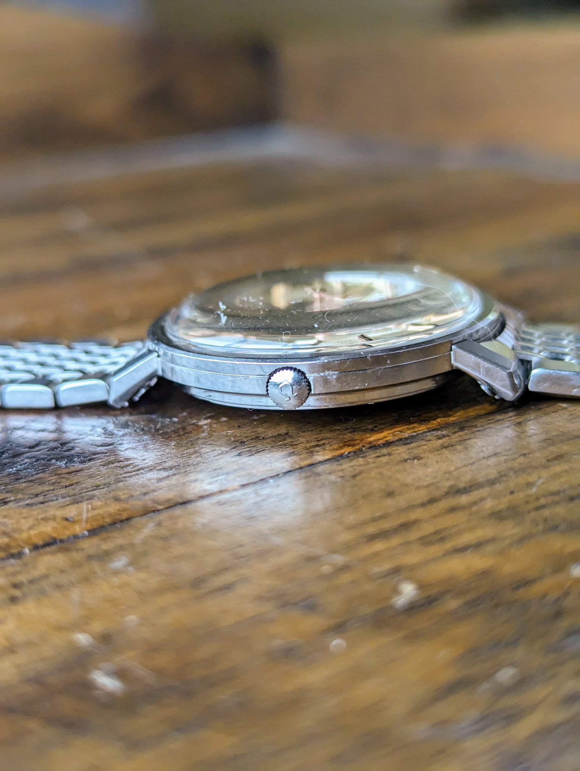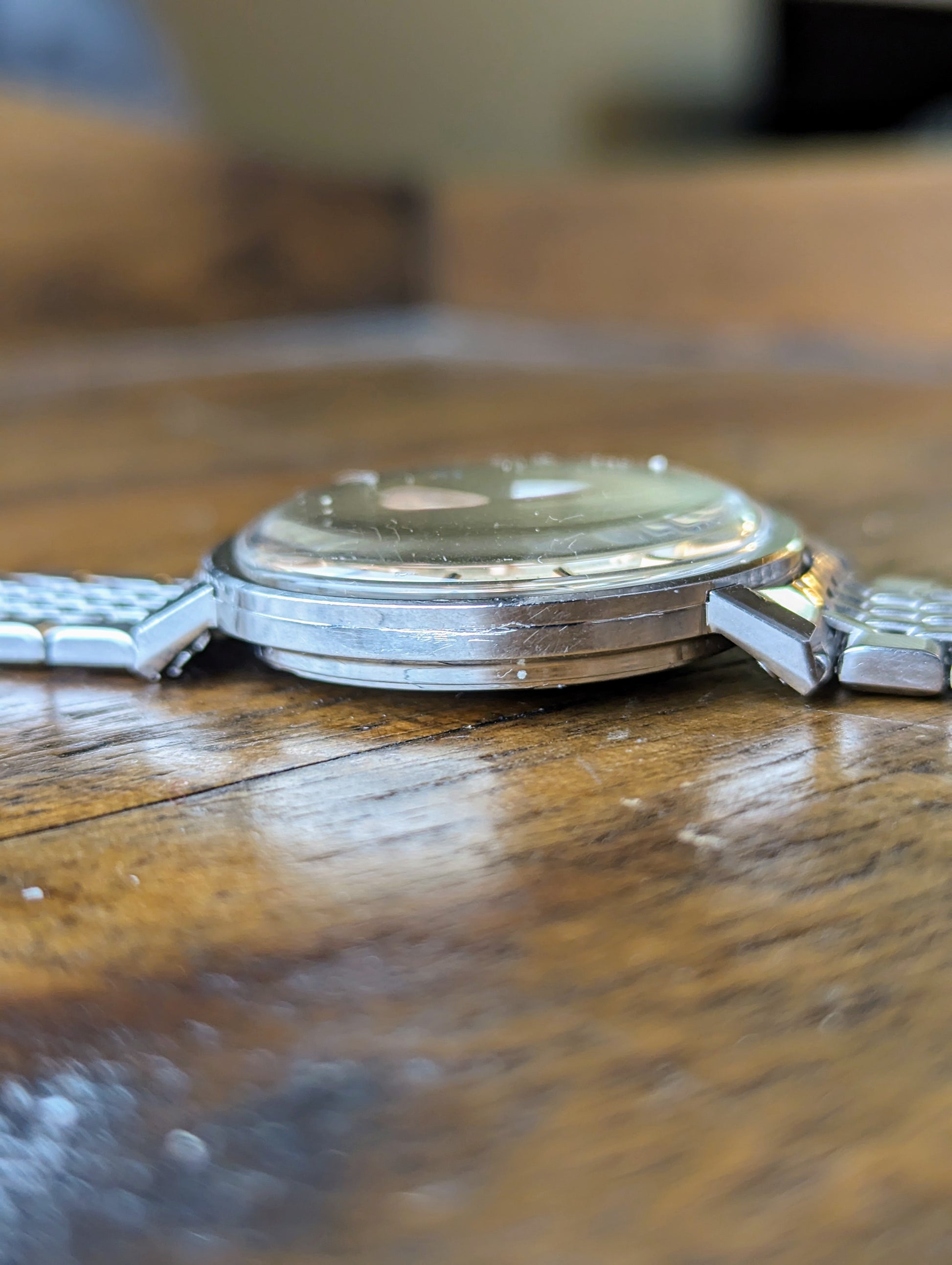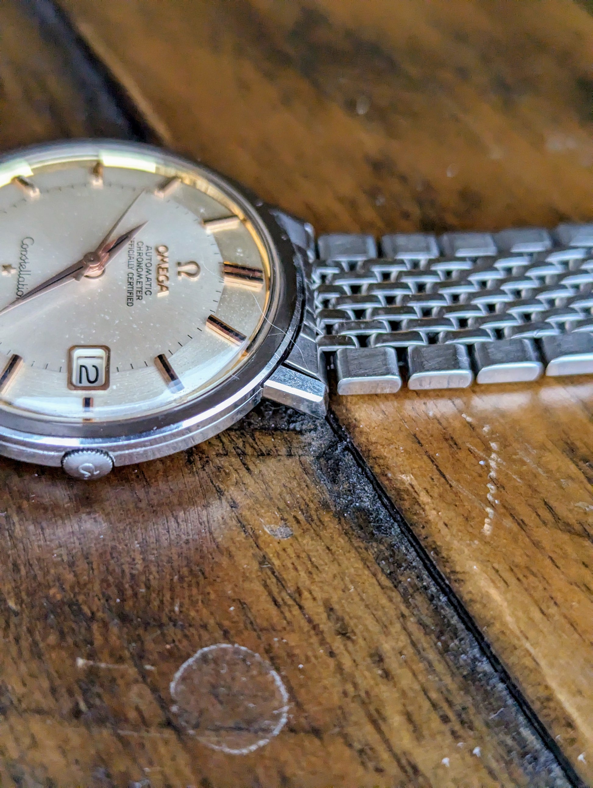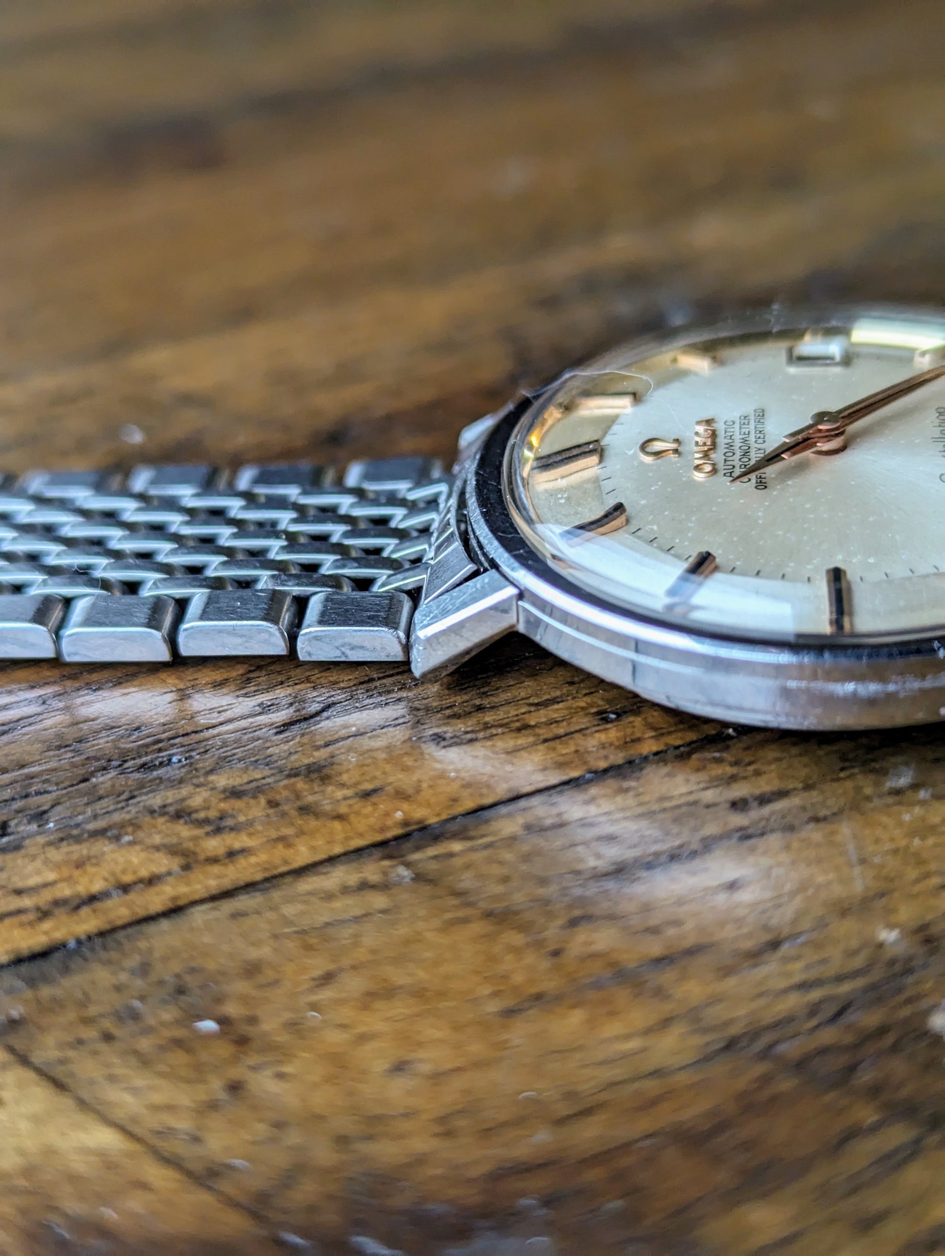 This vintage Omega Constellation reference 168.004 is an interesting watch. The case was designed in a way that the crown is almost hidden behind the watches bezel giving it a unique look and presence on the wrist. There were many dial configurations throughout the production of this reference, one of which was a pie pan dial. This is important to note as the actual diameter of the dial makes this the largest vintage pie pan that Omega ever manufactured.