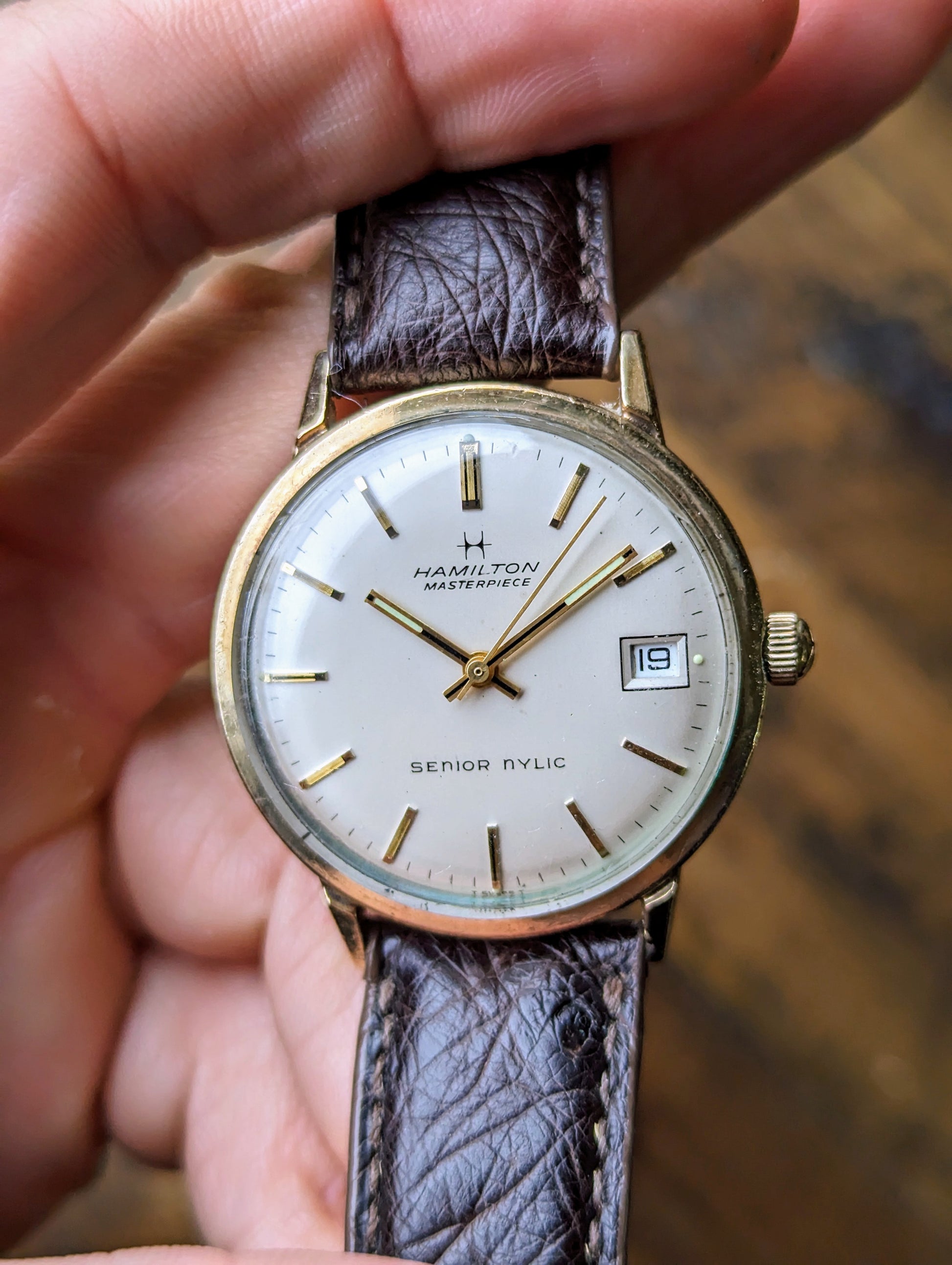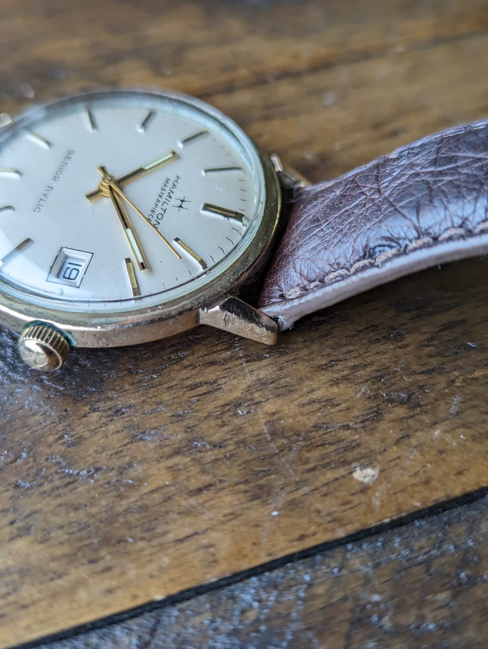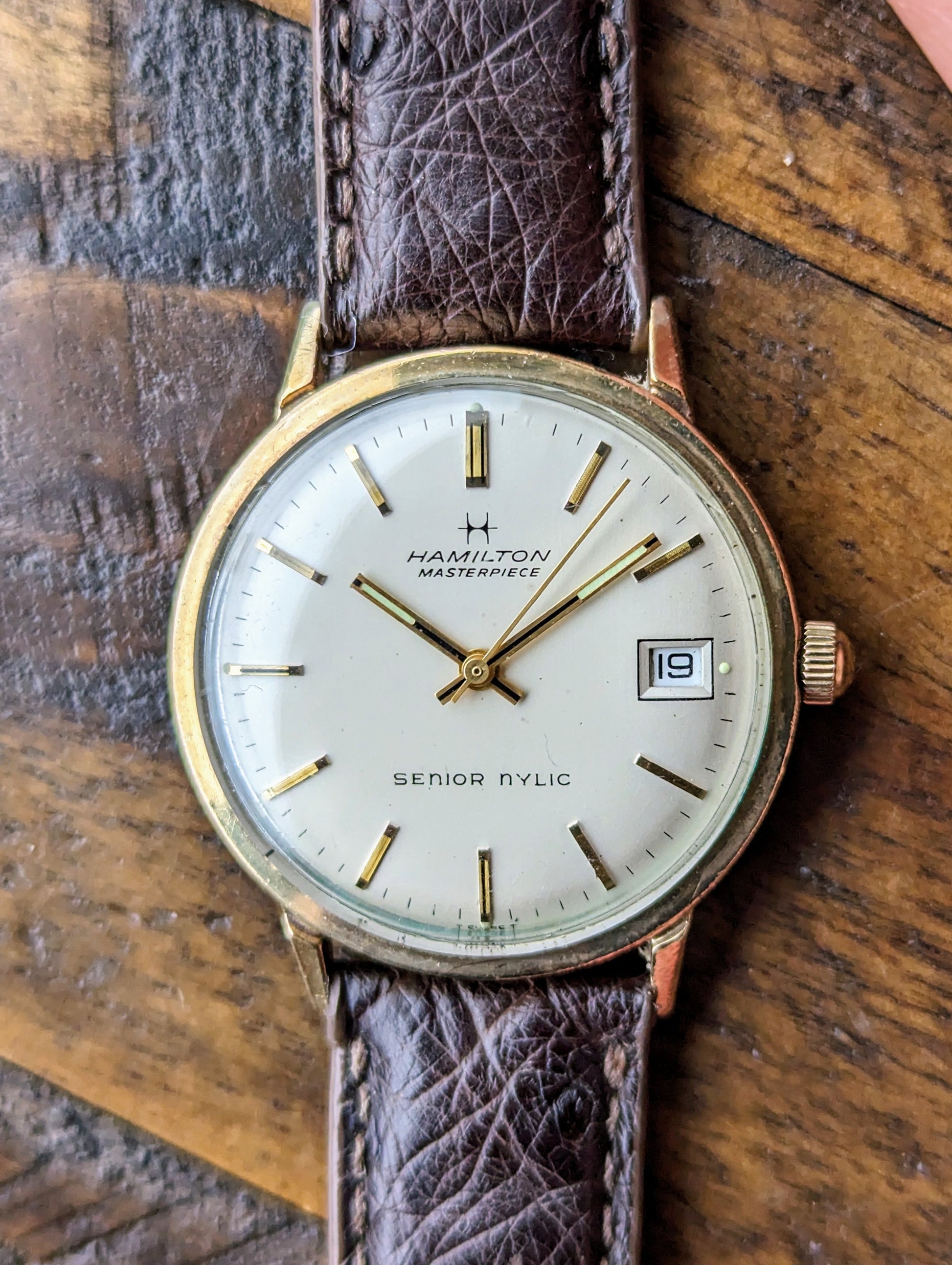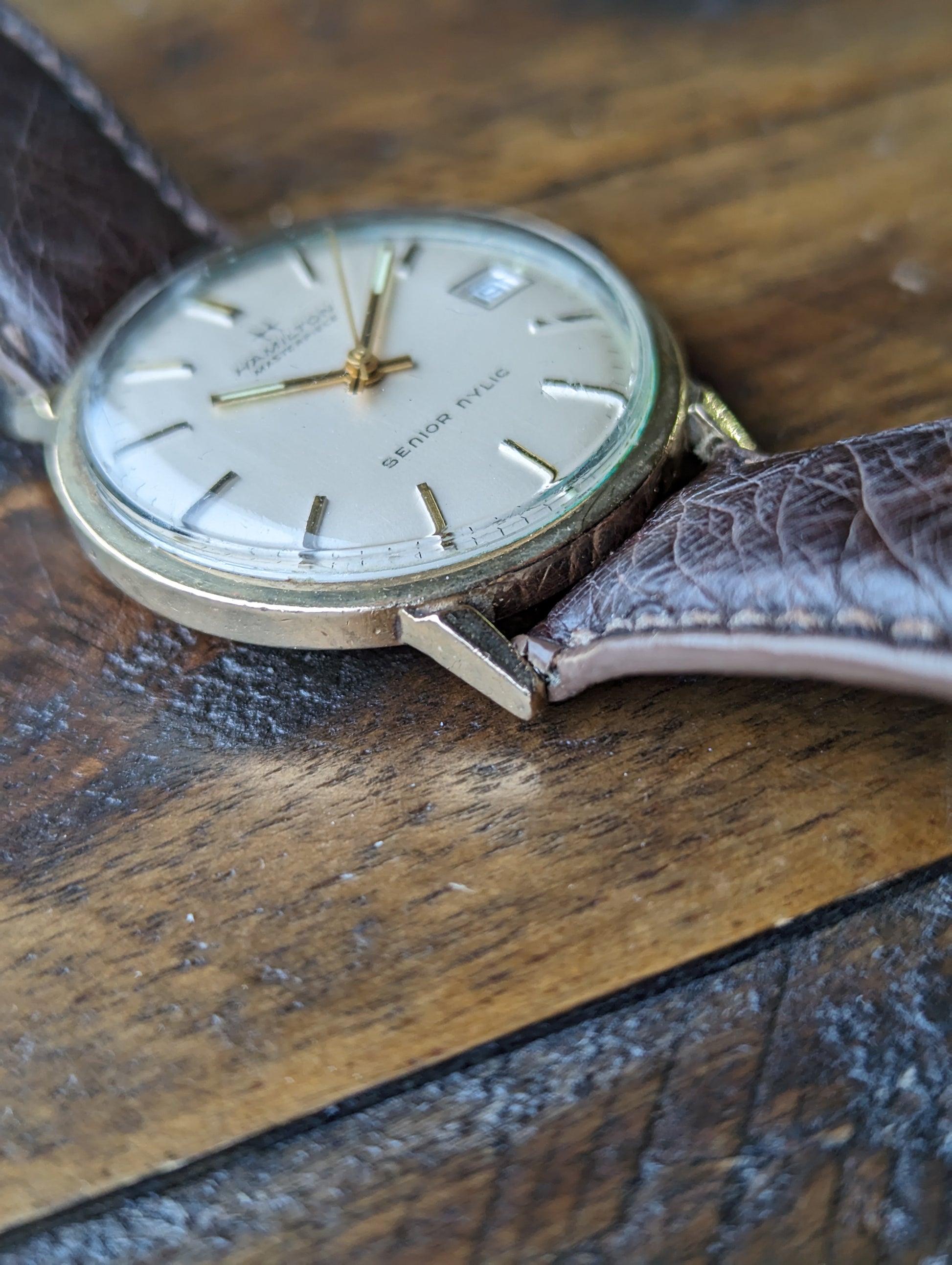 DIAL: We have a matte silver hamilton masterpiece dial with an extra line of text that reads "Senior NYLIC" The dial appears to be free of any scratches, stains, patina or other imperfections. It features stick hour indices and baton style hands.