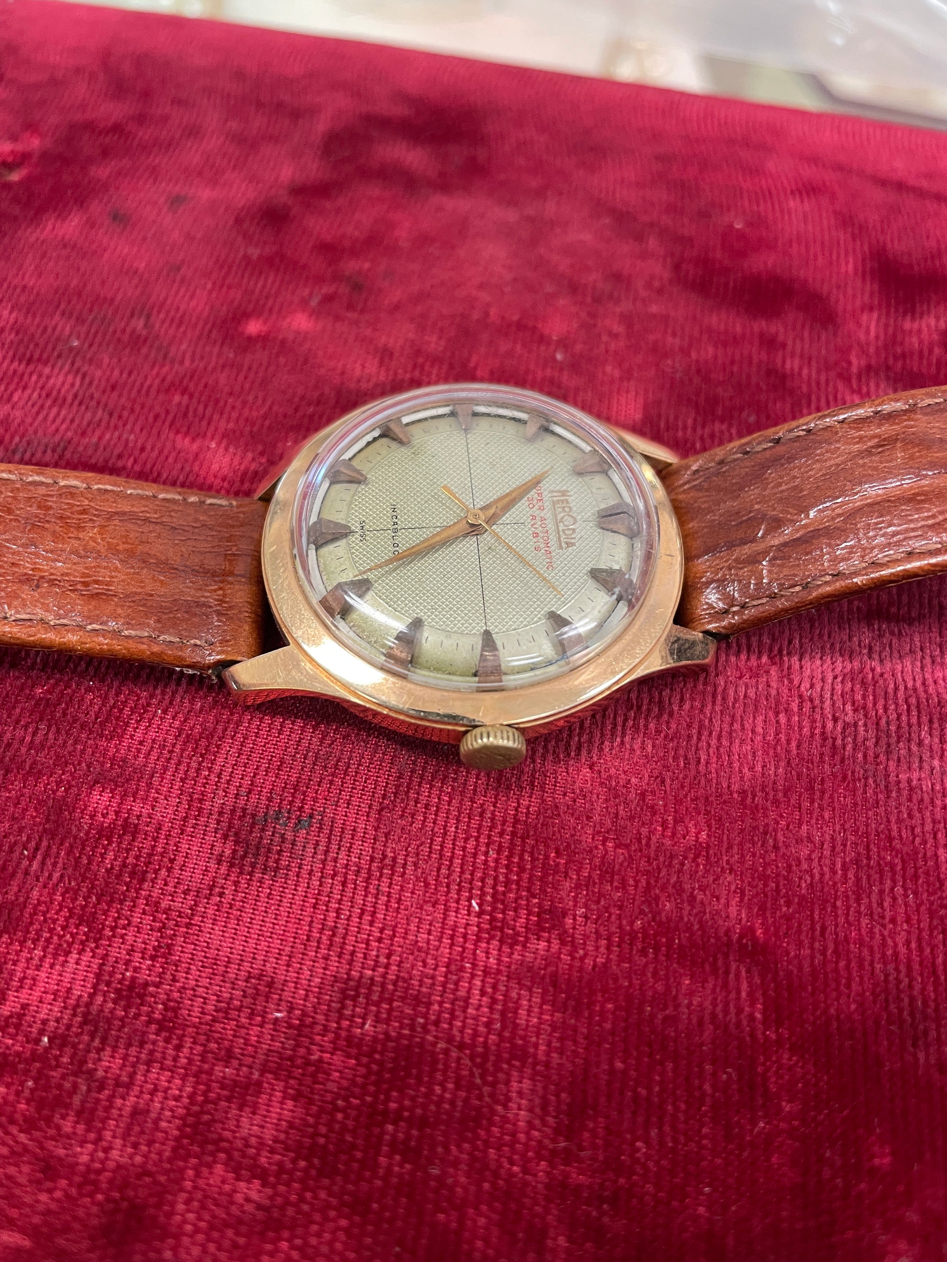 DIAL: The original white, non luminous, pie pan dial has aged to a dark beige. The center features a crosshair w/ waffle pattern and it is contrasted with a smooth minute track. The dial is completed with rose gold hour markers and beautiful dauphine hands.Â