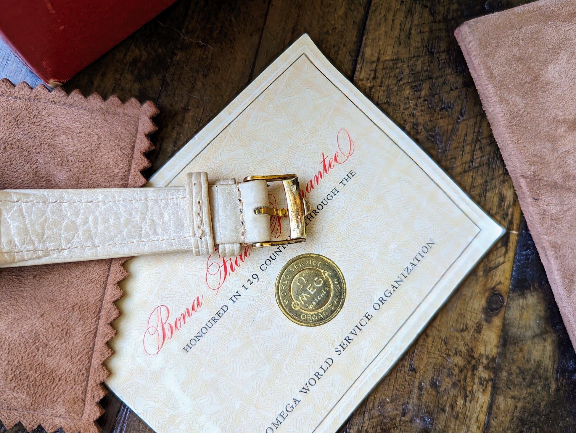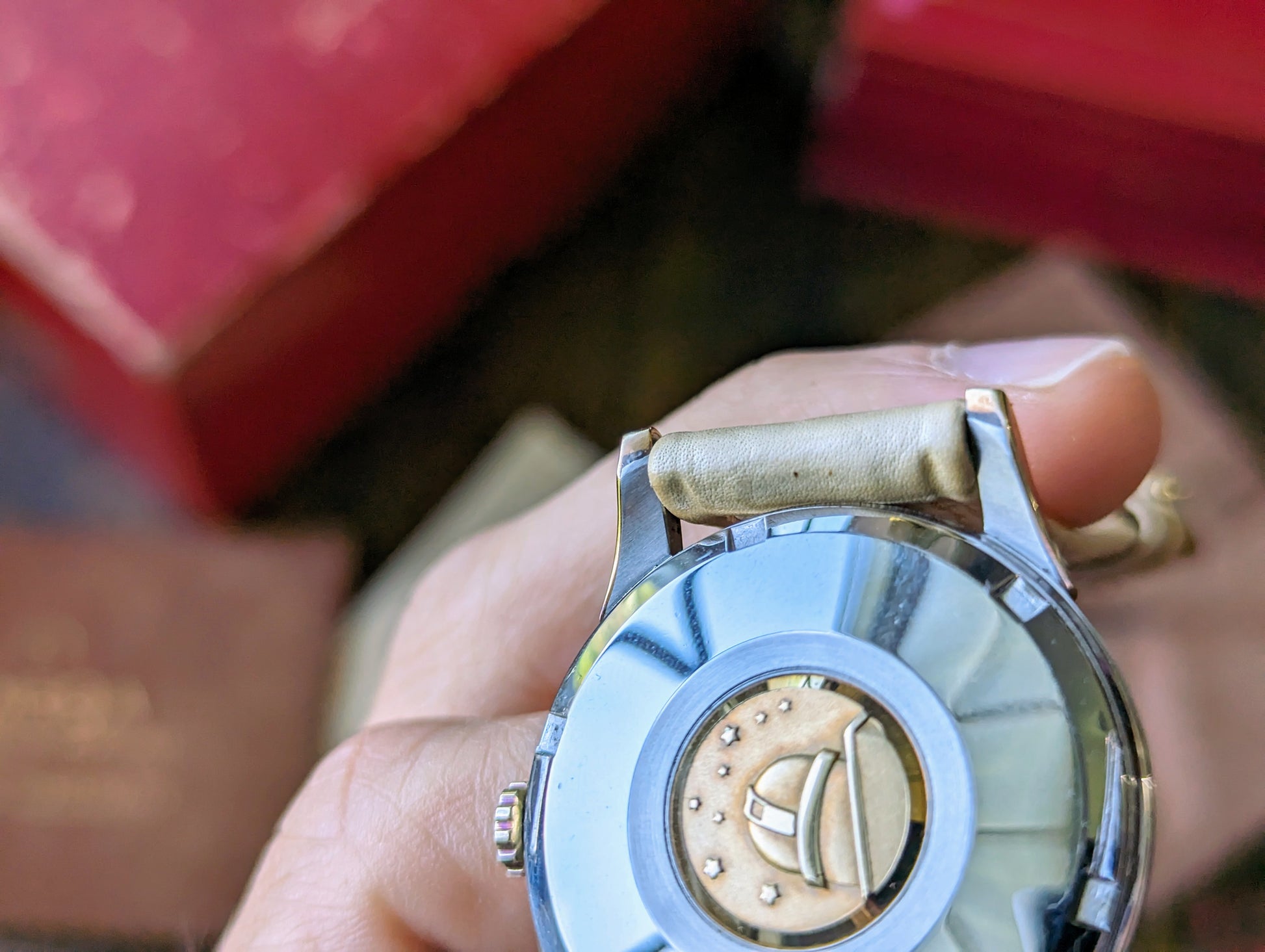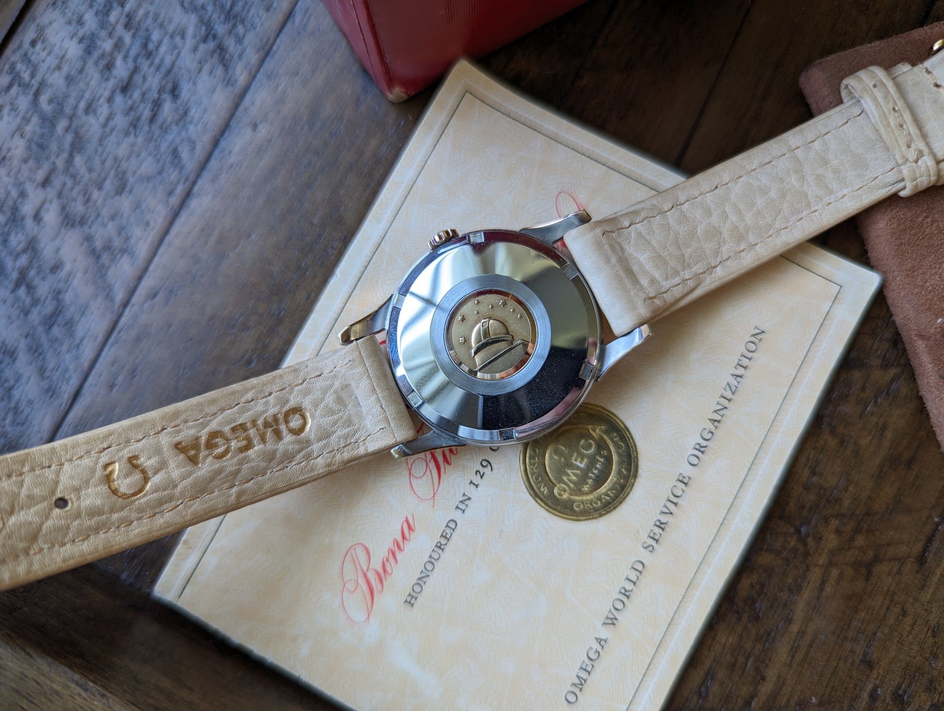 BRACELET: Comes on the watches original strap dating all the way back to 1960. The strap is even in color which is rather uncommon for straps from this era. It is in great condition. There appears to be no fraying on any part of the strap and the threading is intact.