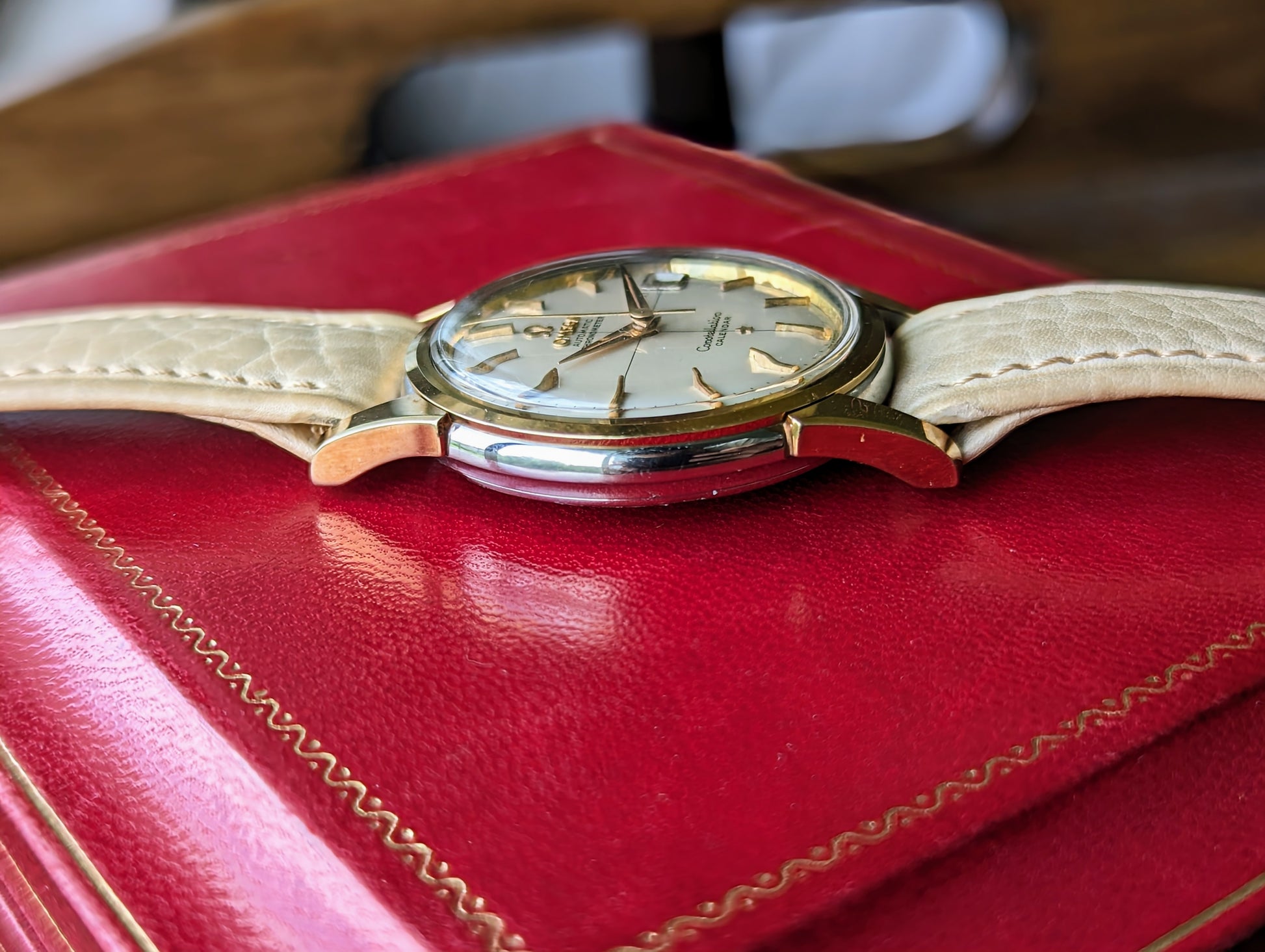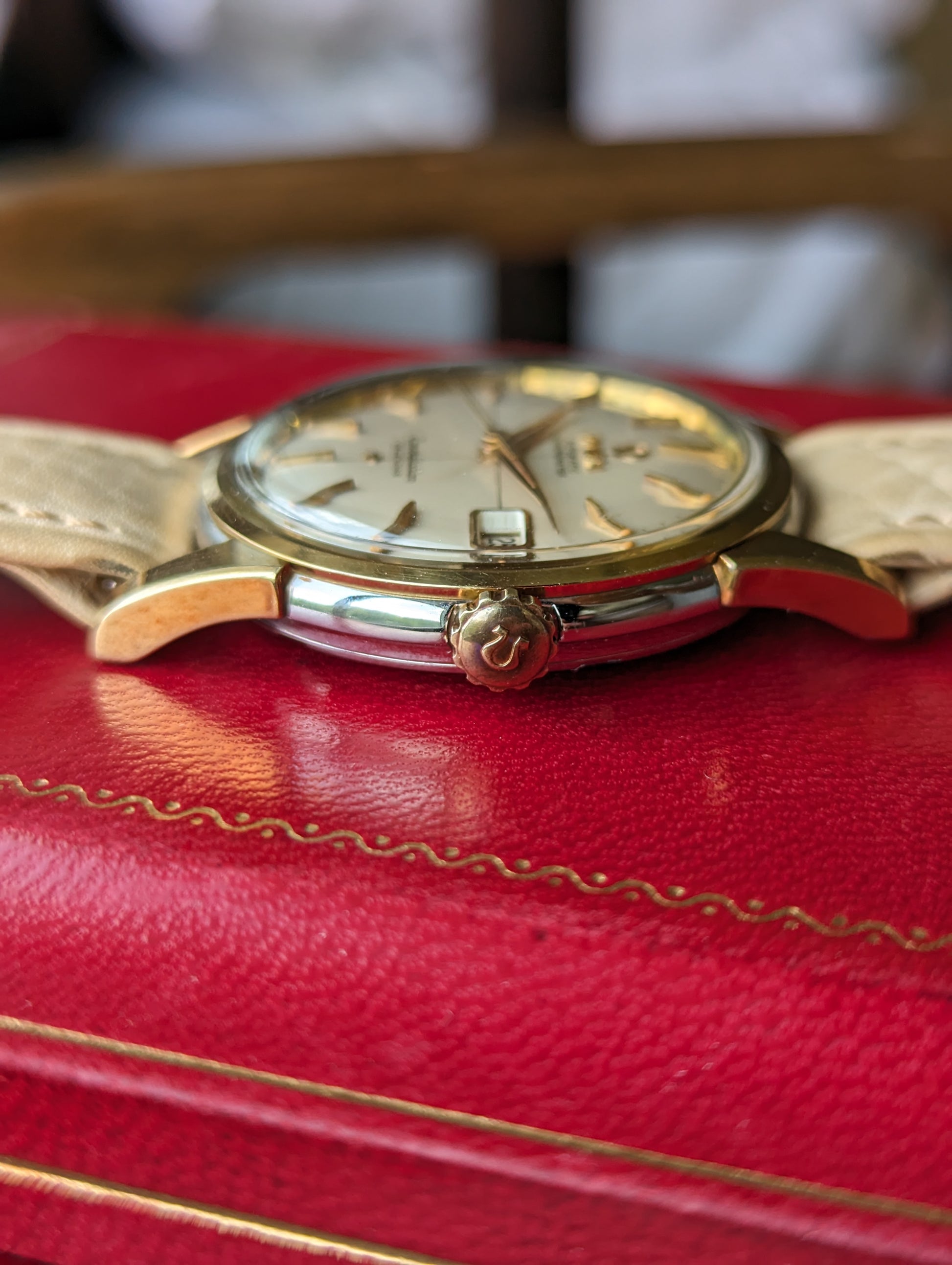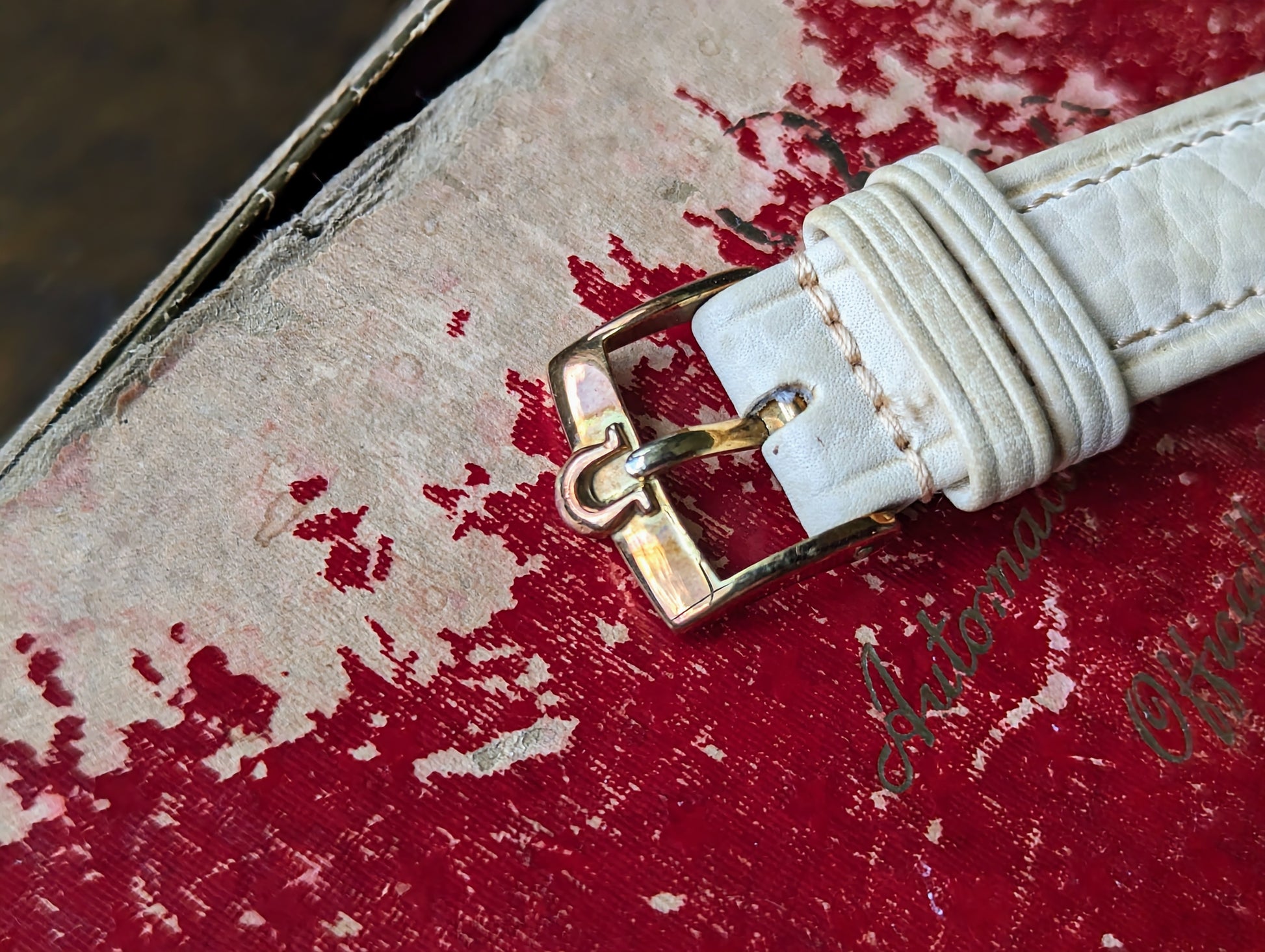 CASE: The 34mm yellow gold capped over stainless steel case is unpolished. Better yet the watch appears to be truly unworn. There is no evidence to me of any wear on the case. The only imperfections that are visible to me are two wrench marks on the back of the case from someone using improper tools or technique when attempting to open it. The bevel on the bezel is very distinct. All four lugs retain their factory original facets and beveled edges. The case features its original, flat foot scalloped crown. The yellow gold medallion has a crisp observatory and all 8 stars are present with a matte, grainy backdrop - exactly what you would expect to see from an unpolished example. There is a beautiful rosy red tarnishing that can be appreciated on the watches crown and original buckle.