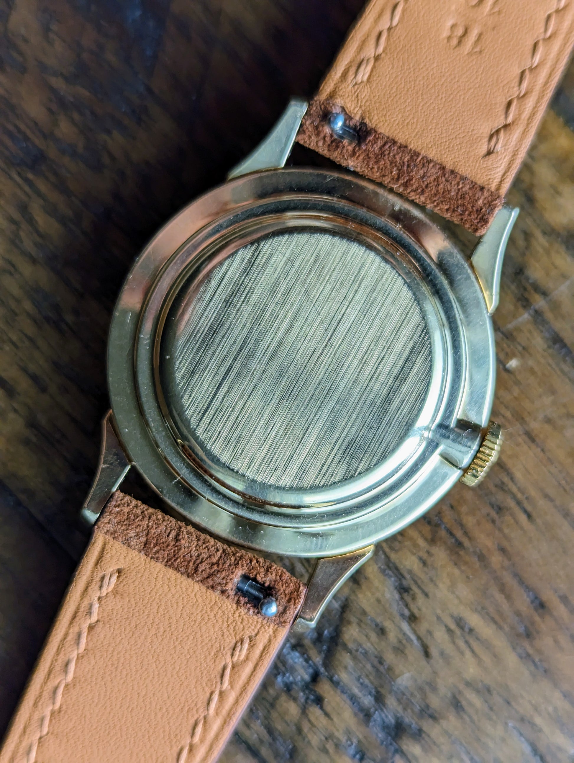 CASE: The 33mm solid 14kt yellow gold case is in excellent condition and remains unpolished. The watch was cased in the United States by a company named Jonell.