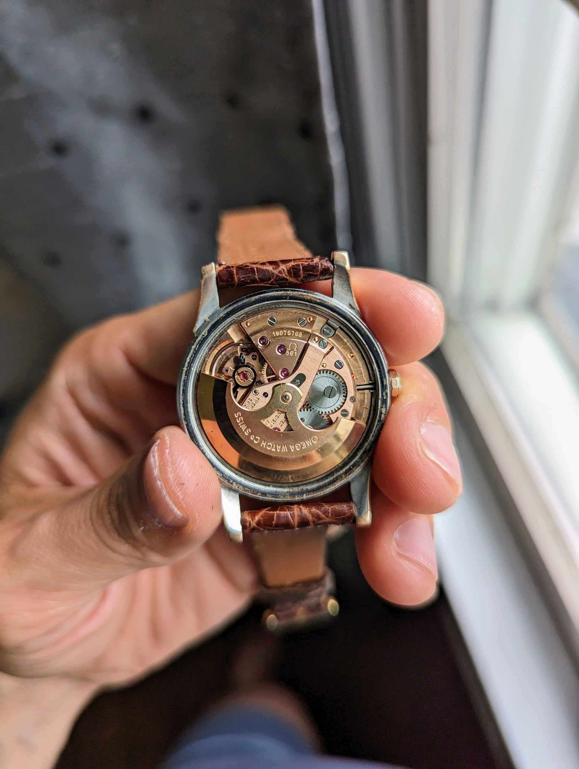 CASE: The 34mm pink gold capped over stainless steel case is unpolished. The bevel o the bezel is very distinct. All four lugs retain their factory original facets and beveled edges. The case features its original, thin decagonal crown. The screw down caseback has some very faint wear throughout but no scratches from wrench marks at all. The pink gold medallion has a crisp observatory and all 8 stars are present with a matte, grainy backdrop - exactly what you would expect to see from an unpolished example. The case is completed by the watches original, Omega signed crystal of which has some crazing.