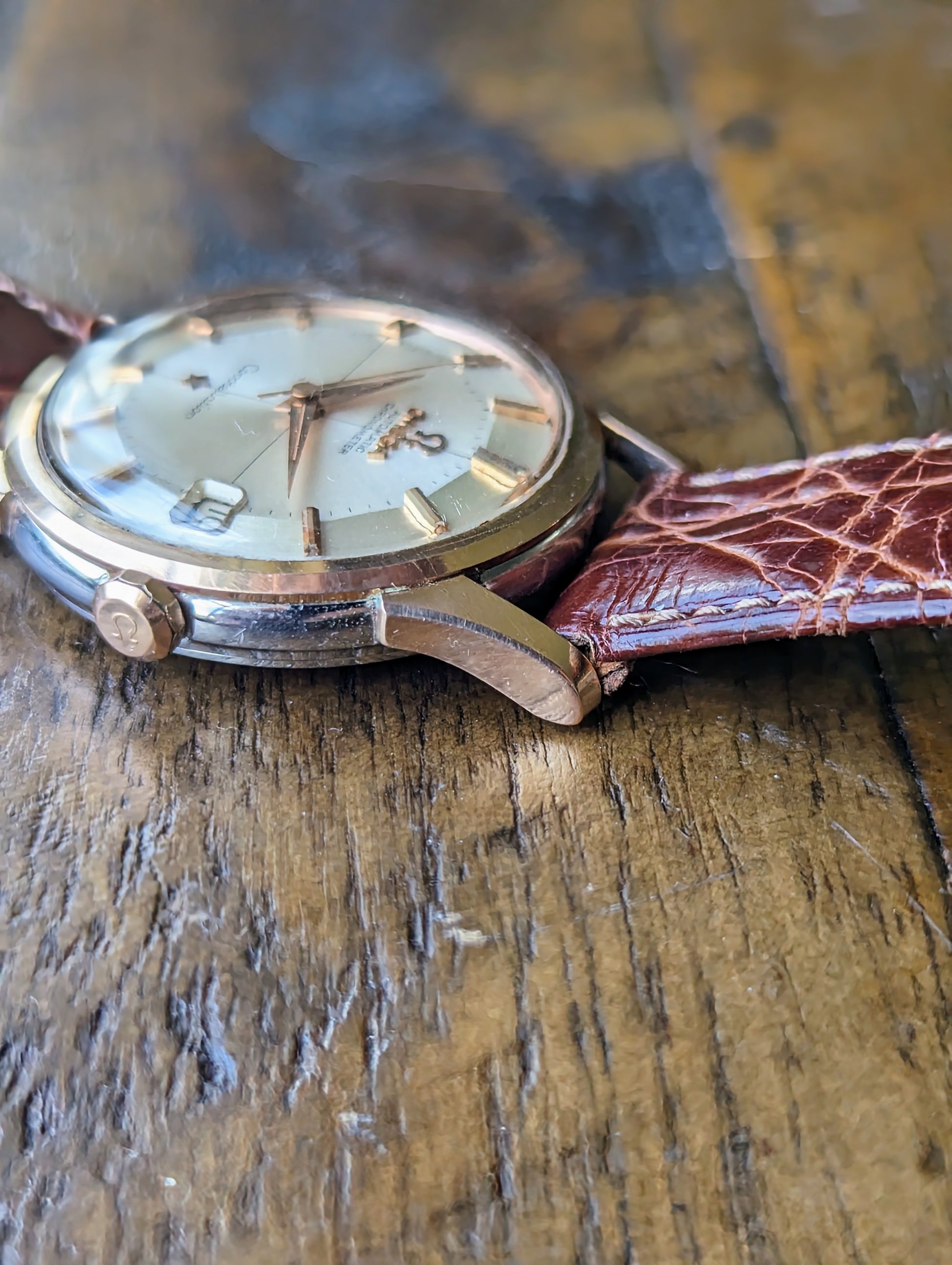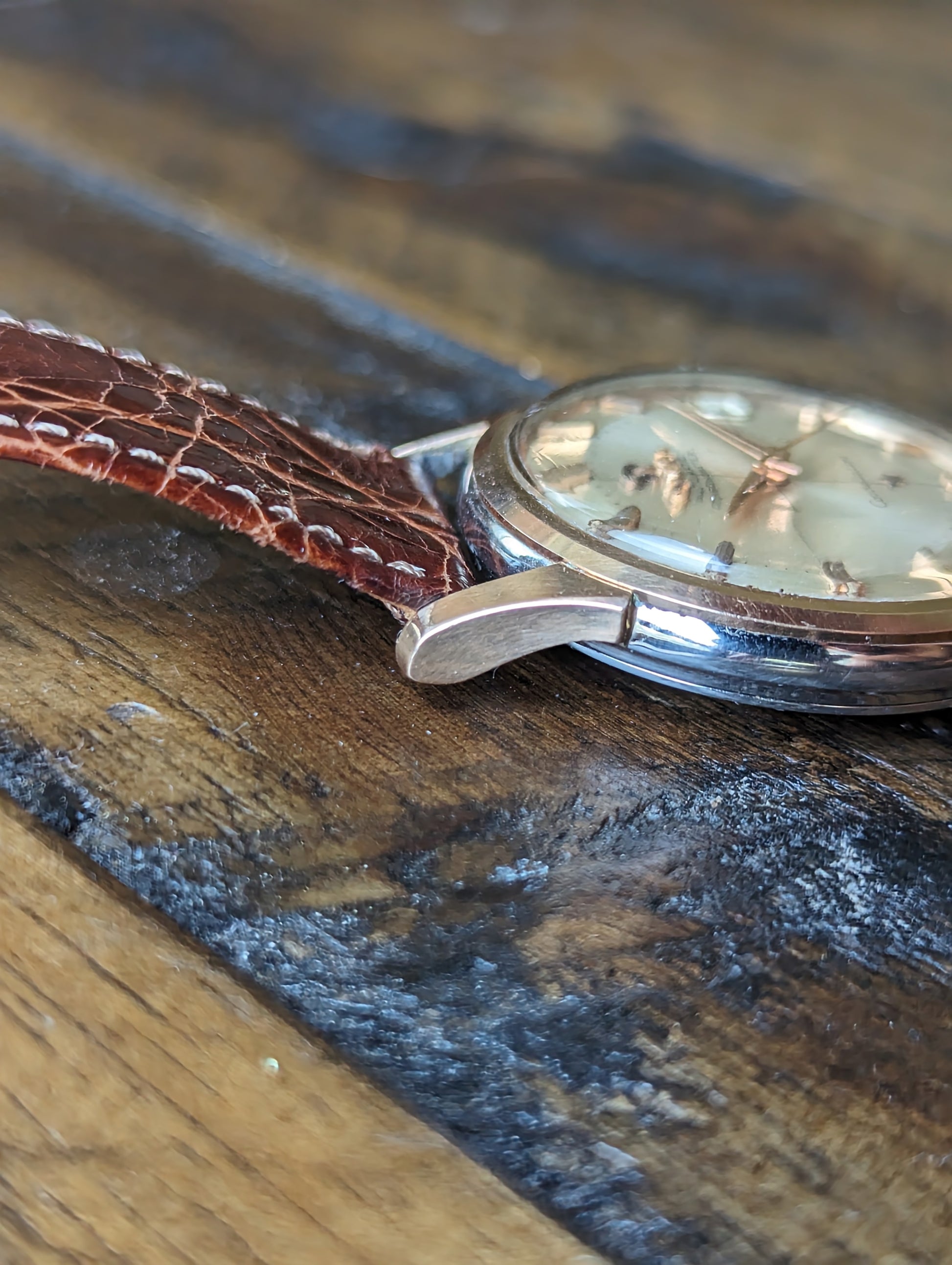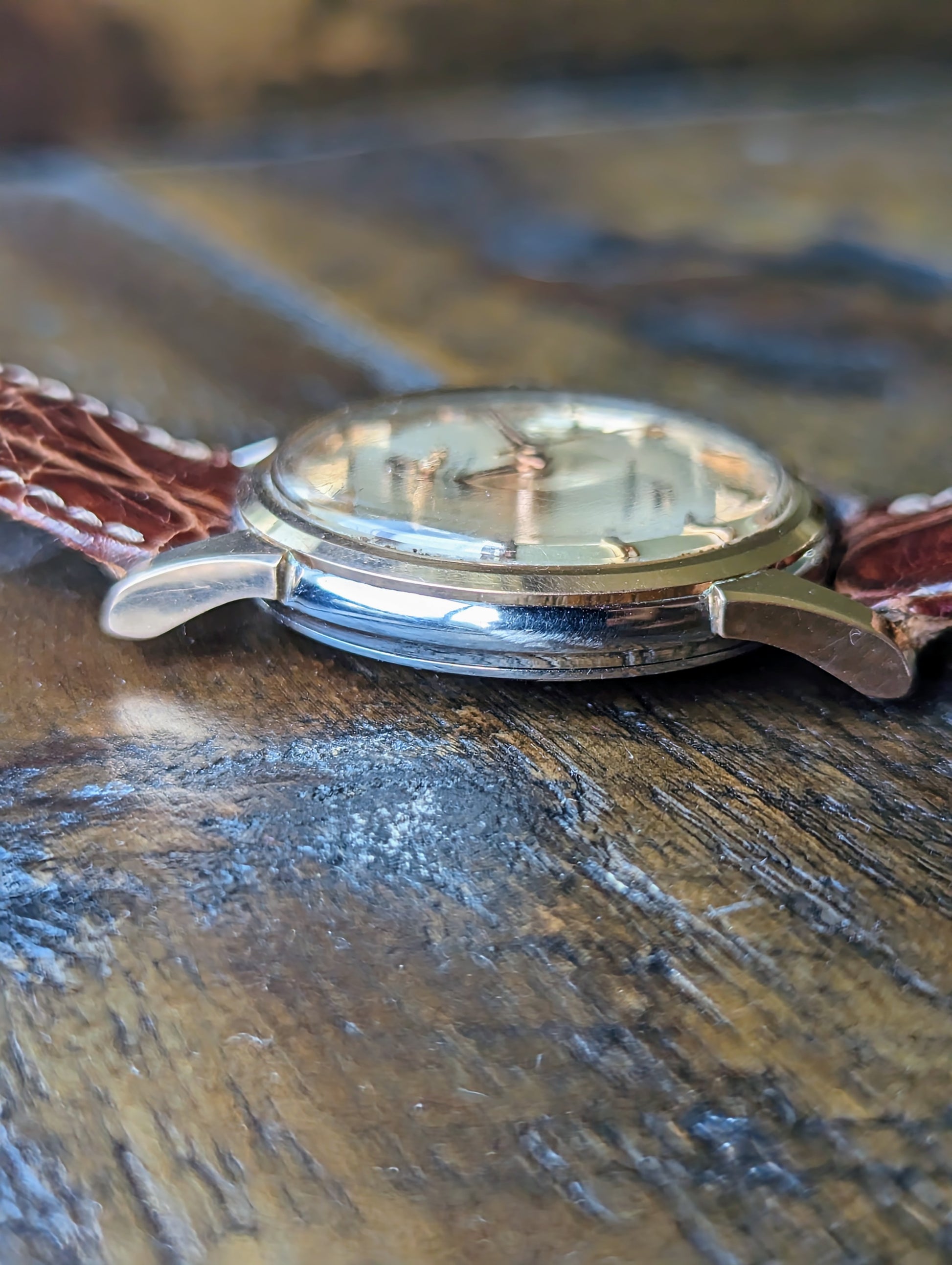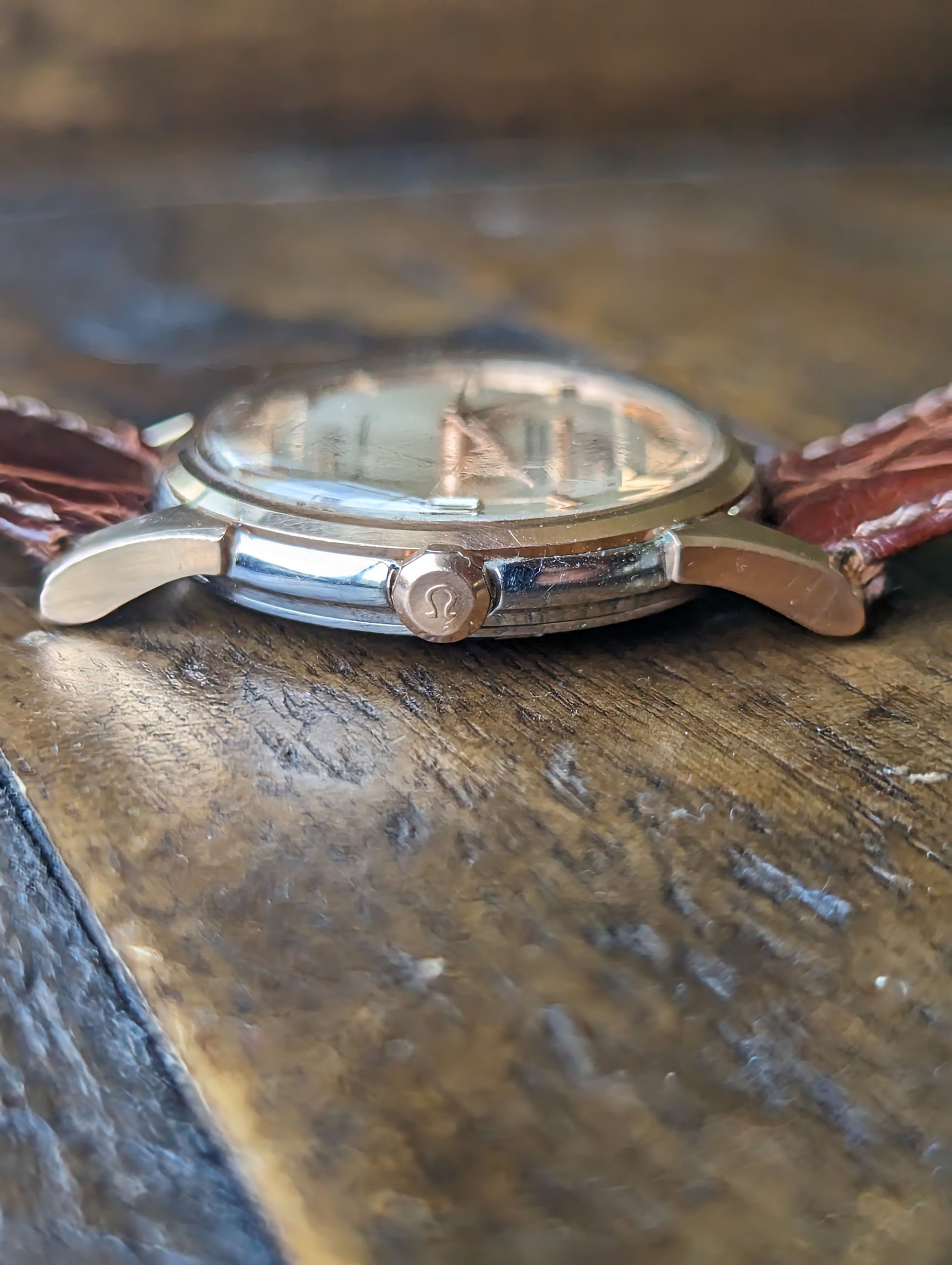 This example, a reference 14393, represents a transition for Omega. These models received an upgraded caliber however kept the same lyre lugs - the last model to do so before the switch to the "dogleg" lugs. It somewhat of a special example in the sense that the capping is pink gold which is much more uncommon than yellow. In addition the case remains unpolished. The dial is relatively clean and I would grade the piece overall as collector grade example. We are pleased to offer it in our vintage watch shop.