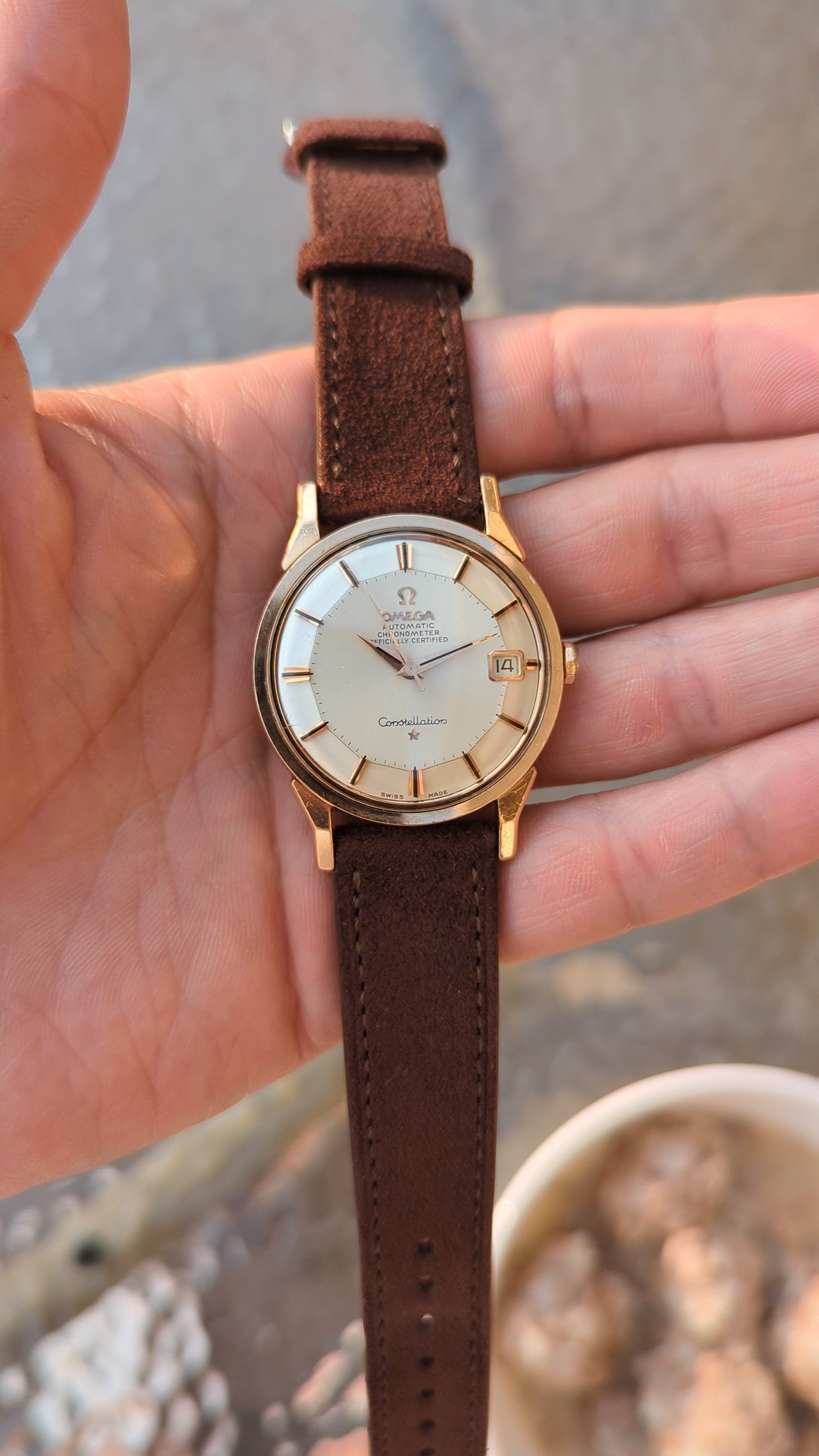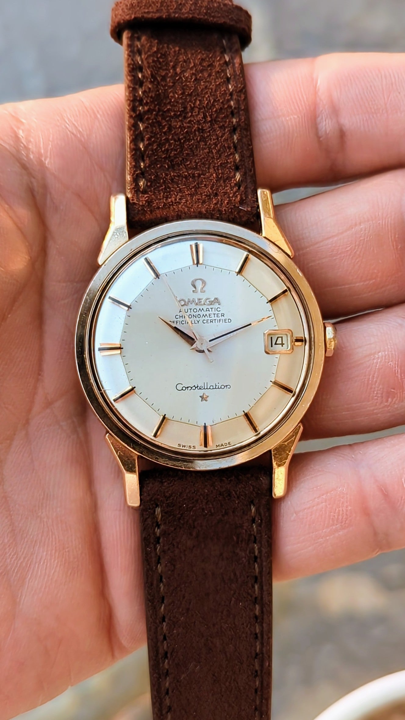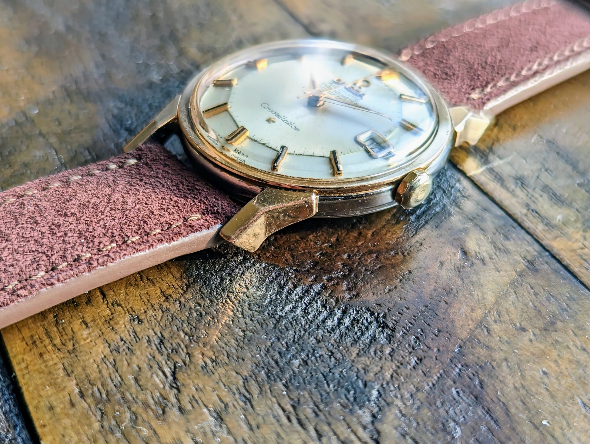 That is precisely what we have here. A "Dogleg" Omega Constellation reference 168.005. But this isn't any ordinary dogleg. No. This example is a more uncommon precious metal: pink gold. We have a pink gold capped over stainless steel. To top it all off it encases the the most popular dial configuration currently sought after in the collecting vintage market - a piepan.