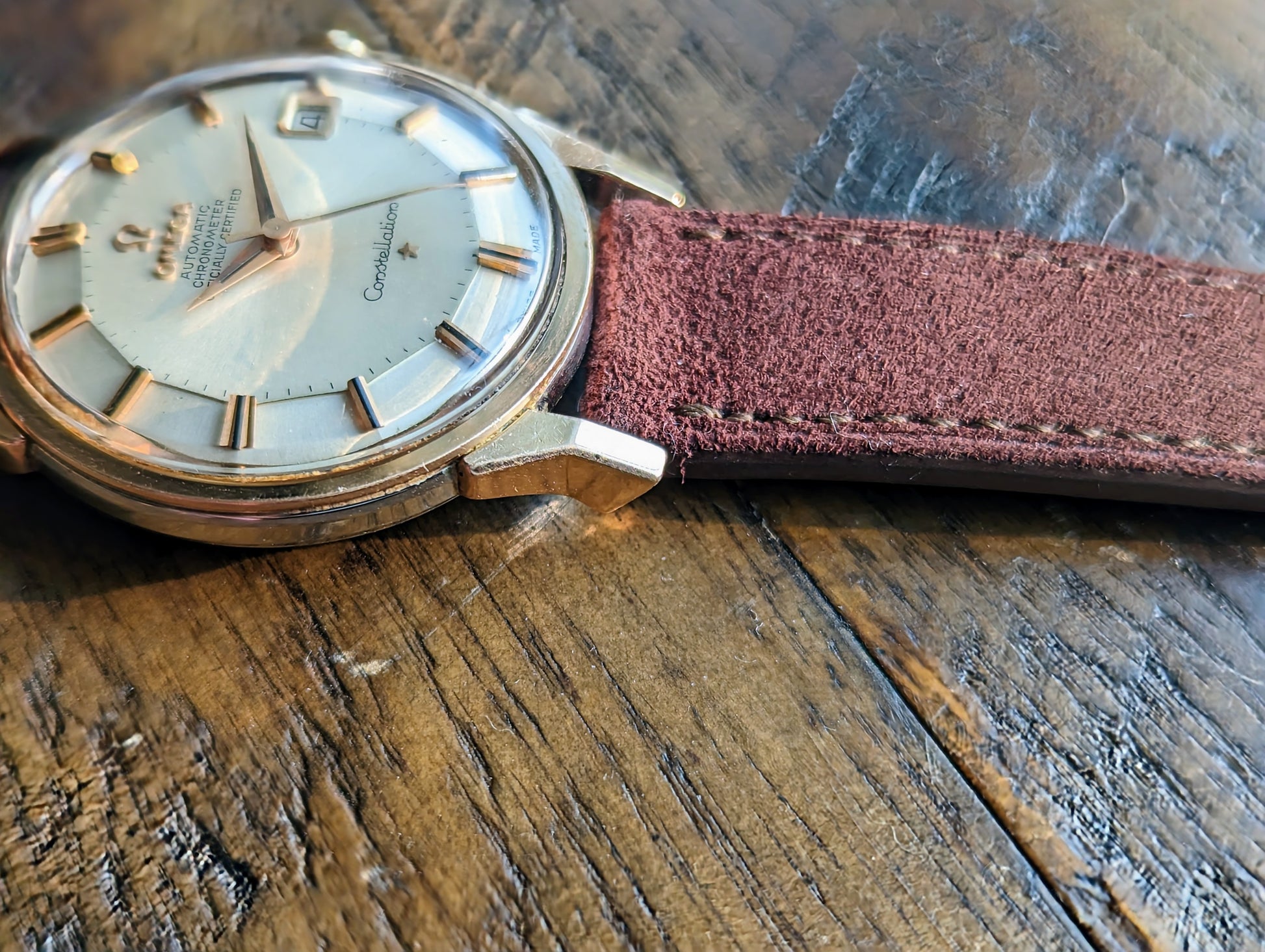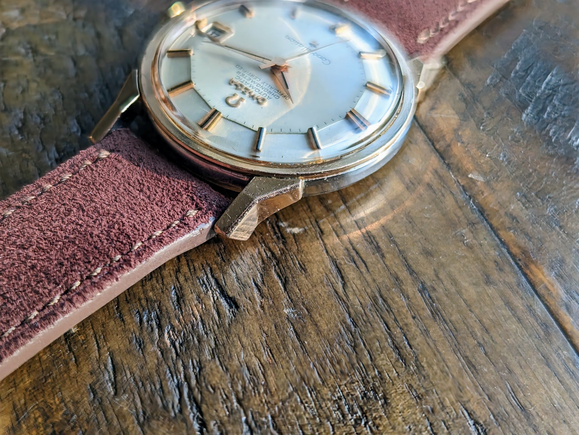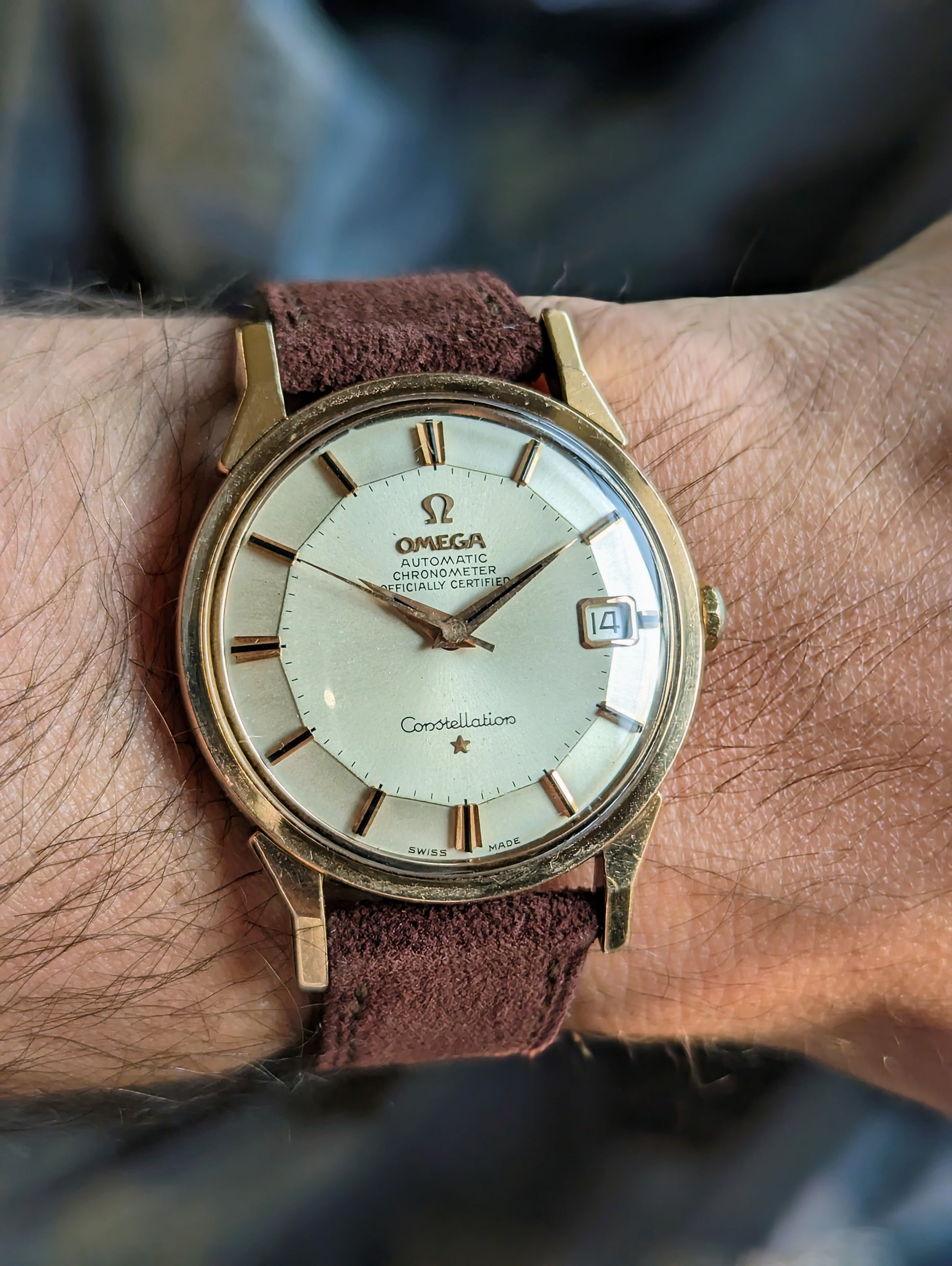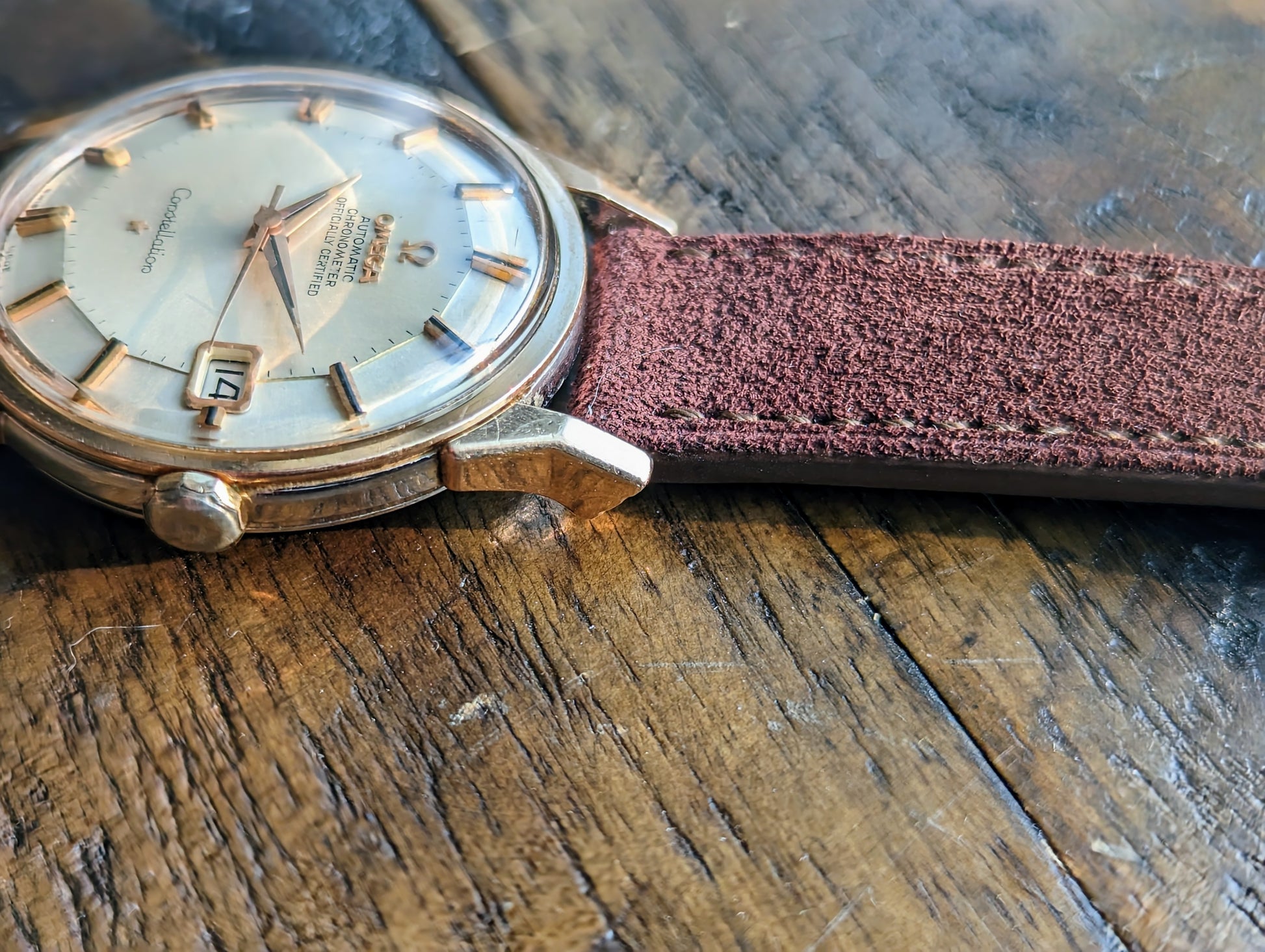 That is precisely what we have here. A "Dogleg" Omega Constellation reference 168.005. But this isn't any ordinary dogleg. No. This example is a more uncommon precious metal: pink gold. We have a pink gold capped over stainless steel. To top it all off it encases the the most popular dial configuration currently sought after in the collecting vintage market - a piepan.