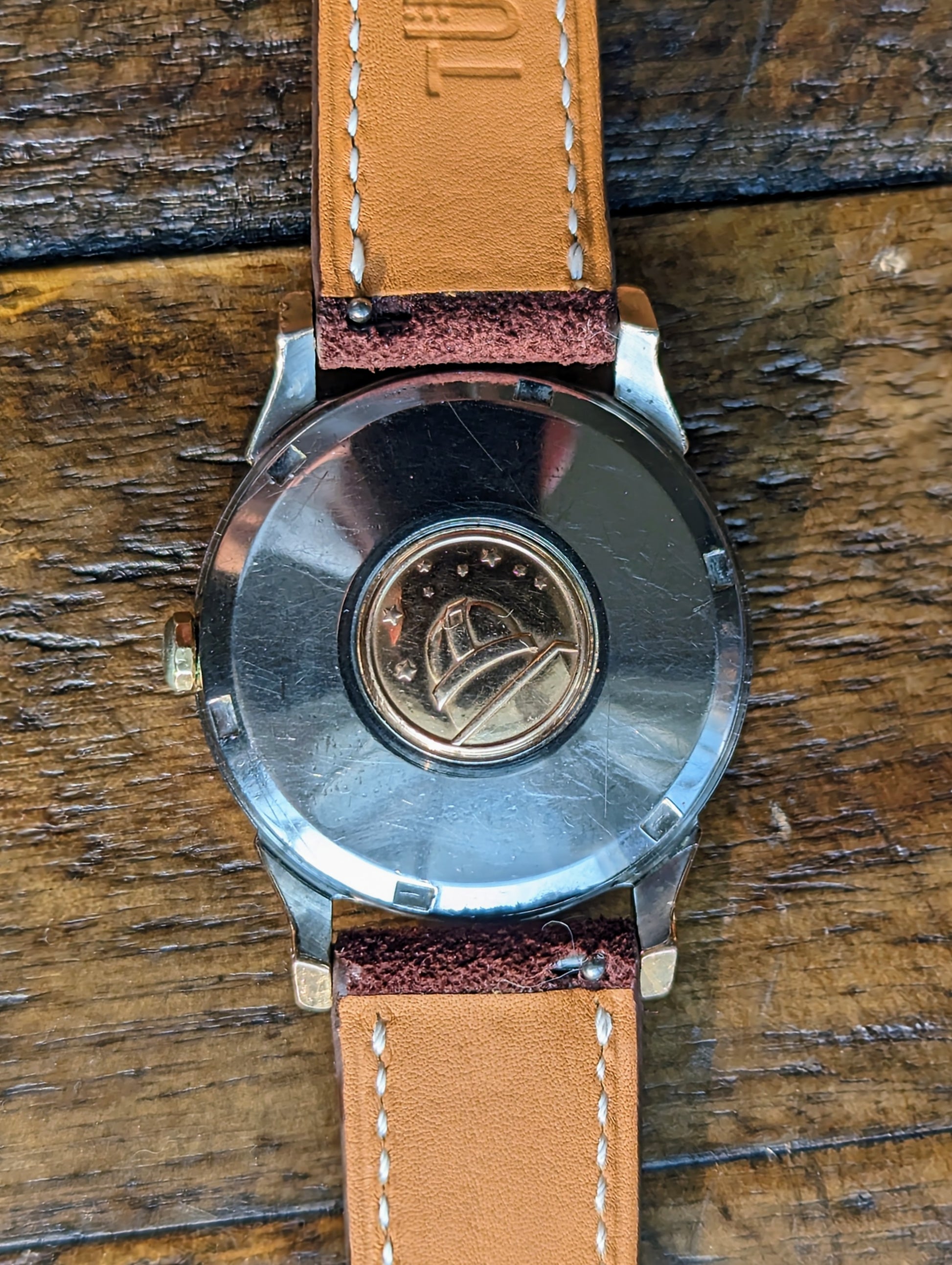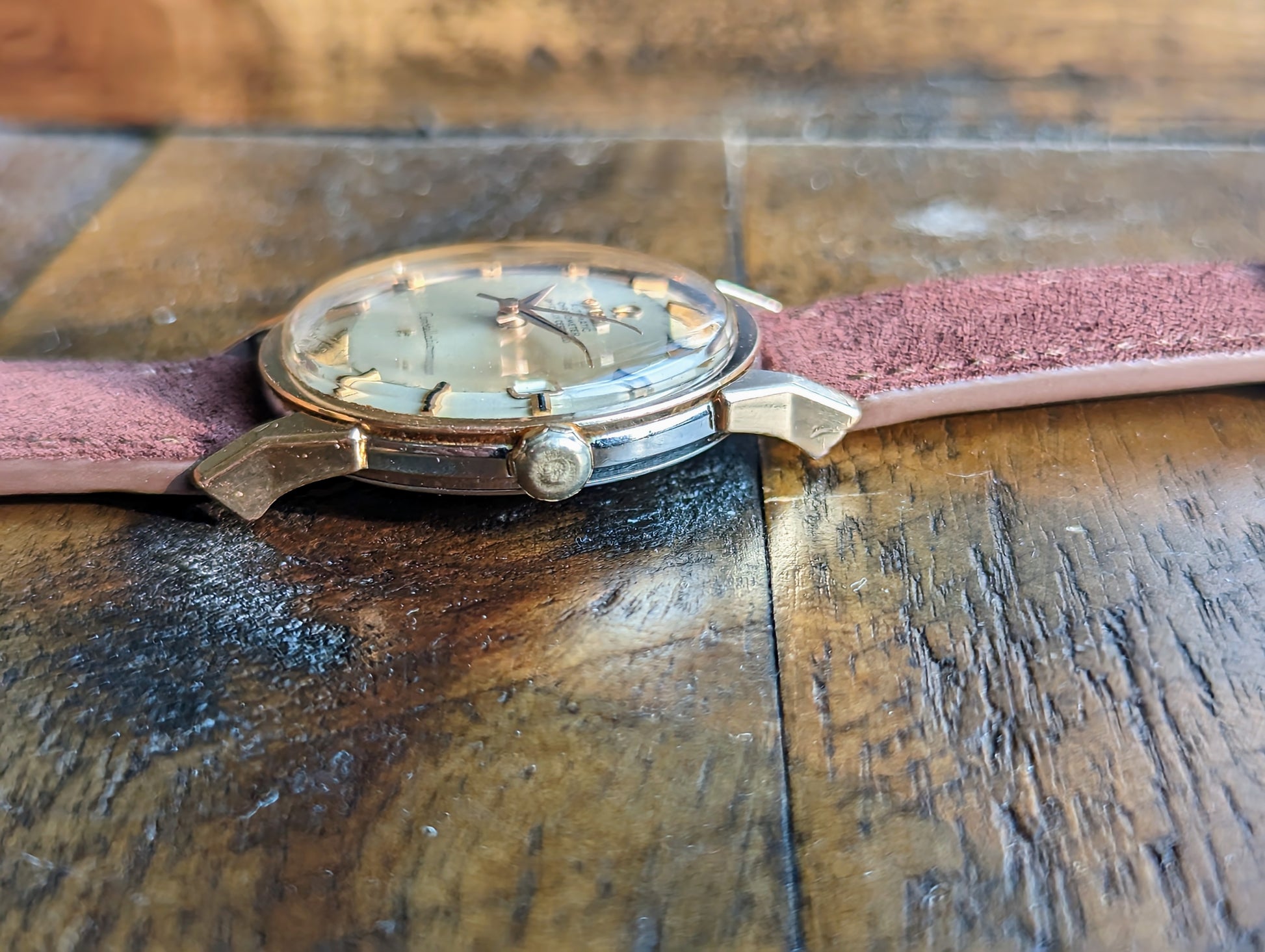 CASE: The 34mm pink gold capped over steel case is in good shape. The watch presents with wear commensurate for its age. All four lugs retain their beveled edges on the anterior and lateral portions. The original brushed finish on the back of the lugs can still be appreciated. The observatory medallion on the caseback is nice and crisp with all 8 stairs well defined. There is more faint scratches on the caseback but nothing too deep. The case is completed by the correct thin decagonal crown. The pink gold capped portion of the flat side on the crown has worn away as evidenced by photographs. The crystal was replaced sometime in the past.