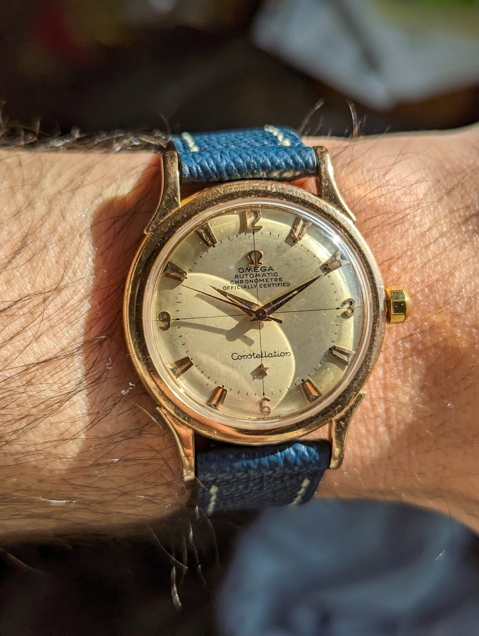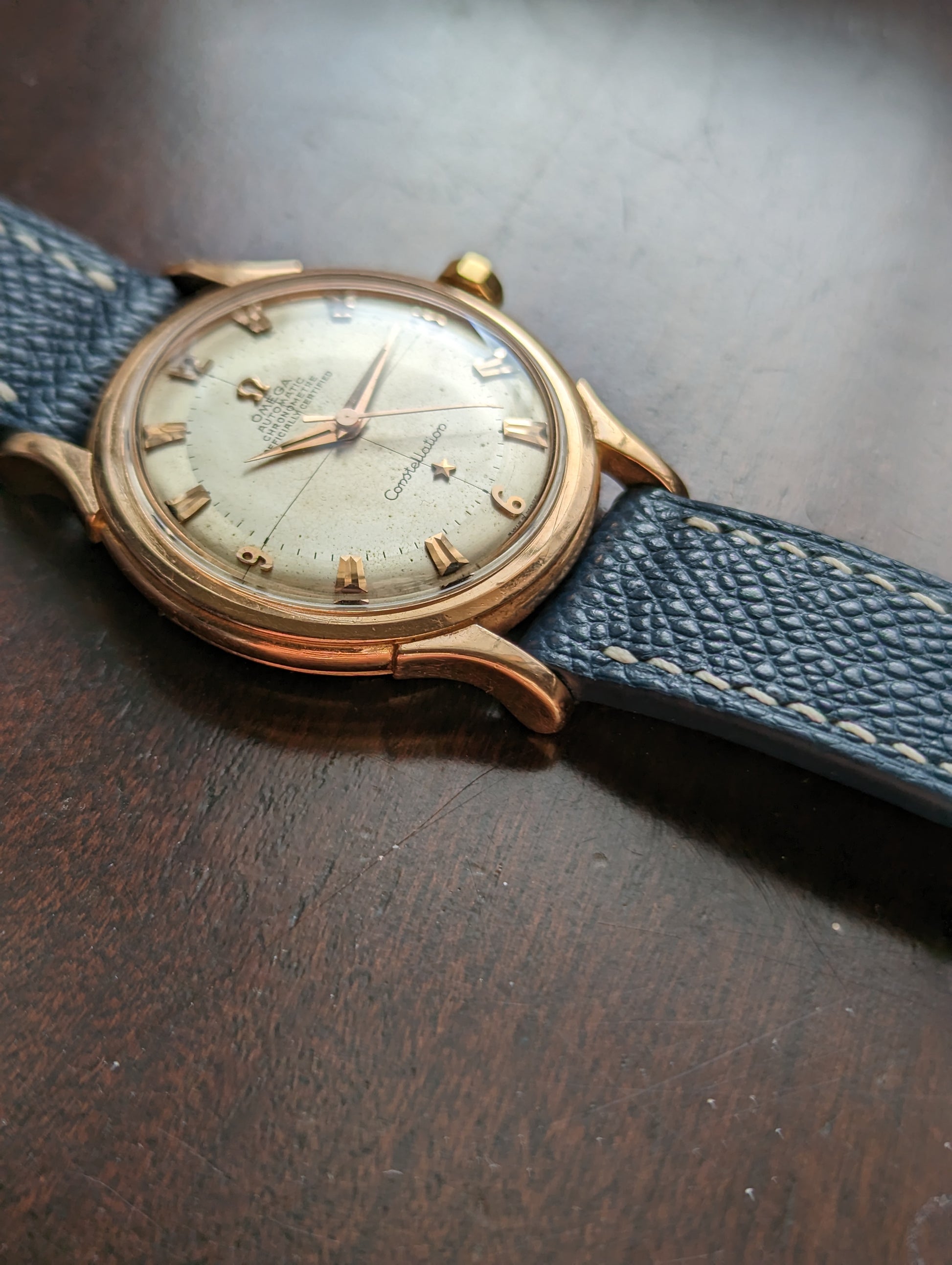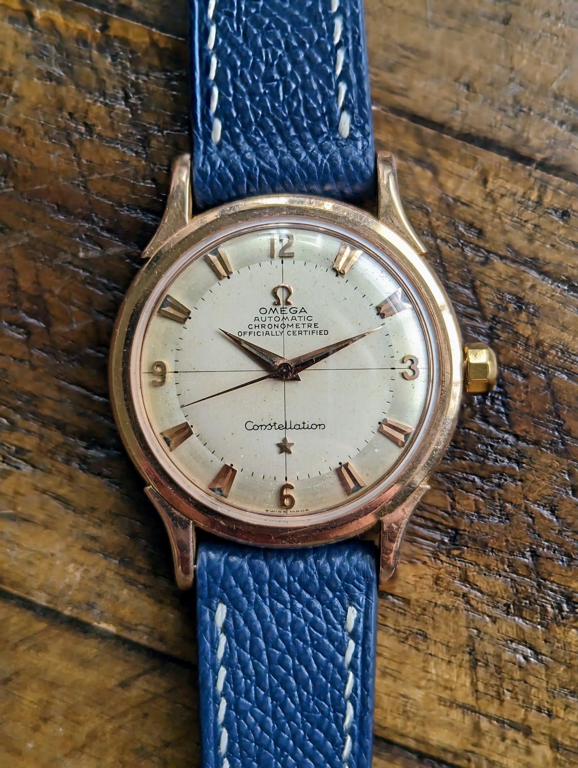 Omega introduced its “Constellation” line in the early 1950’s starting with the reference 2648. The Constellation was Omega’s top-of-the-line model, offering chronometre certified bumper automatic movements and a medallion on the caseback depicting an observatory with 8 stars - each of which represent the 8 records omega set Geneva observatory trials.