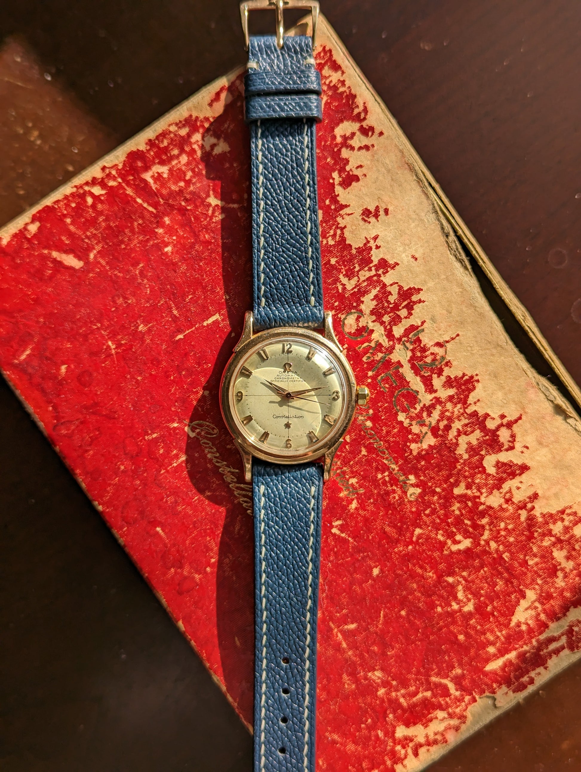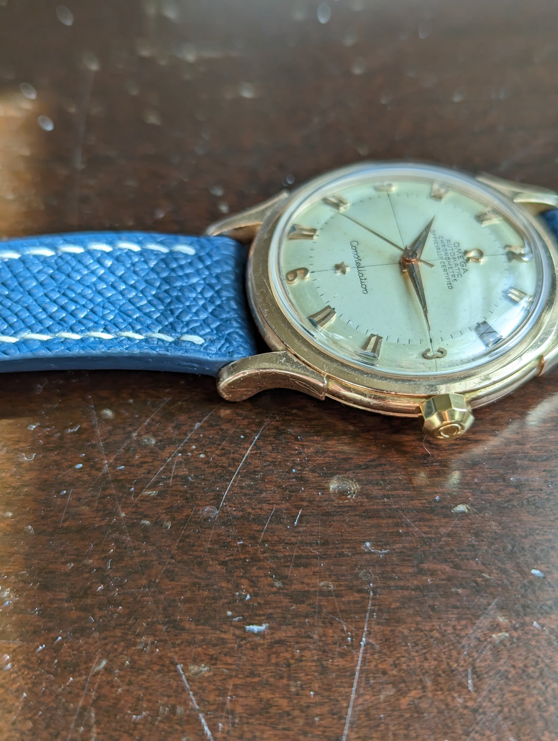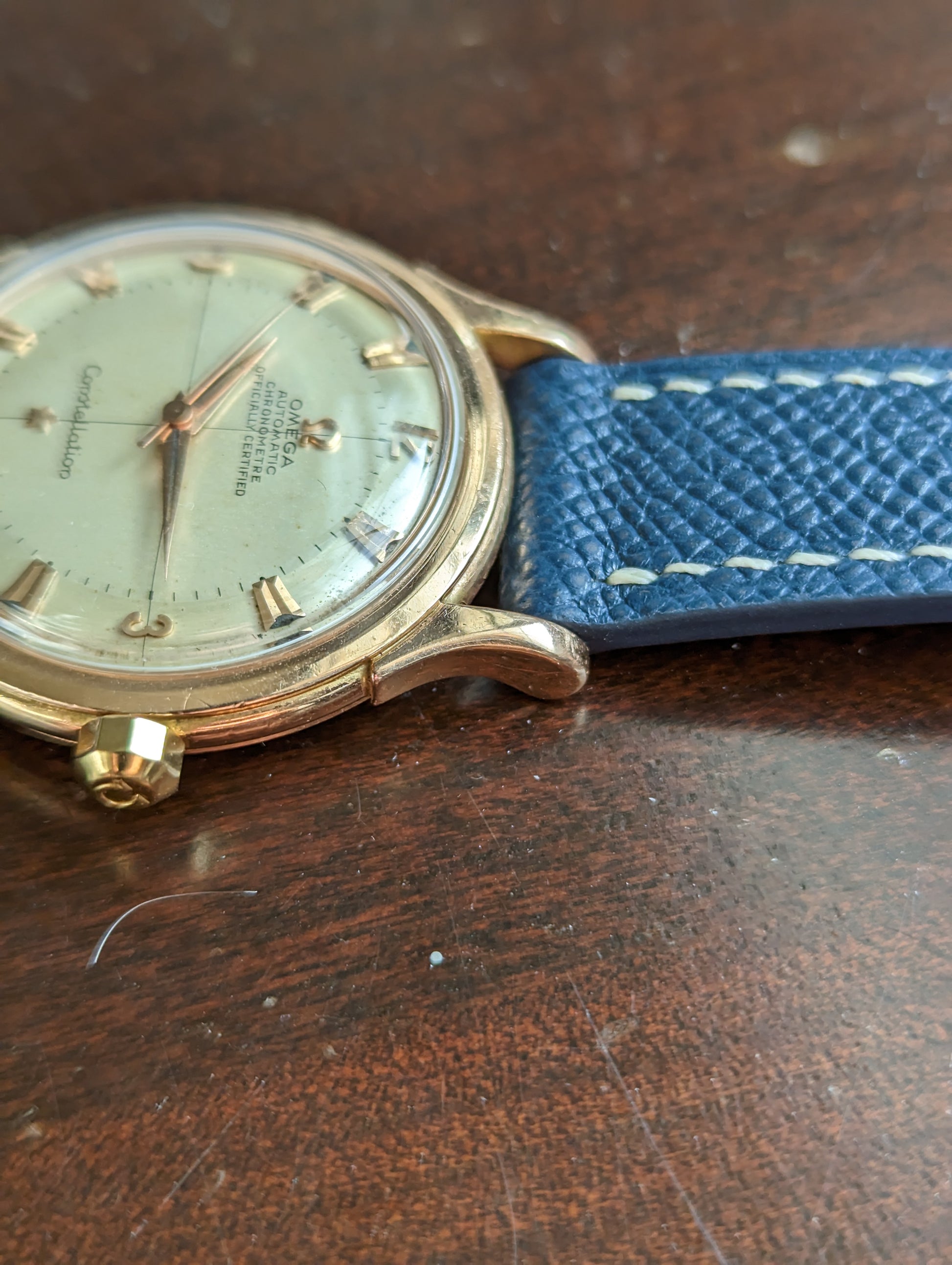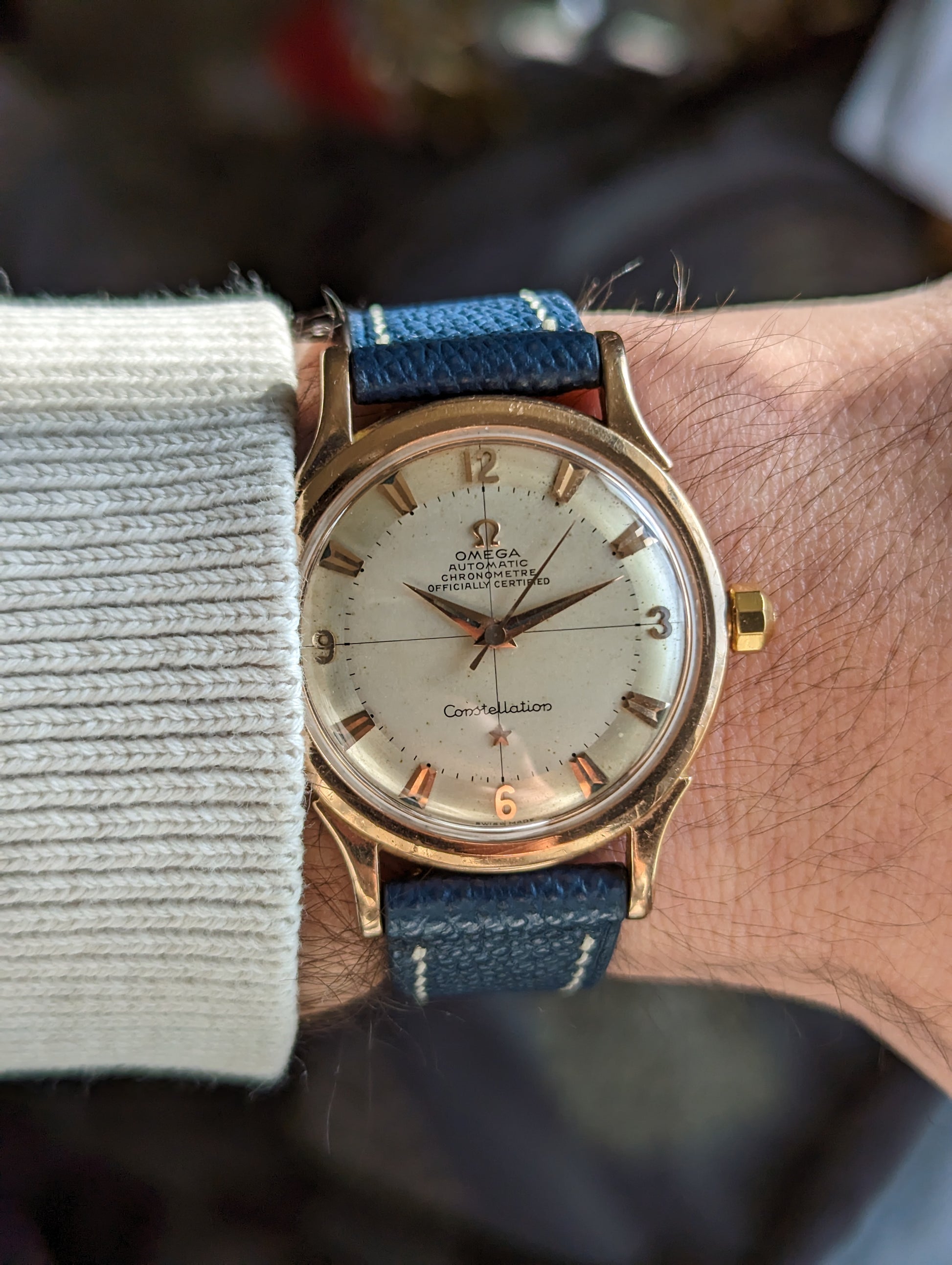 Omega introduced its “Constellation” line in the early 1950’s starting with the reference 2648. The Constellation was Omega’s top-of-the-line model, offering chronometre certified bumper automatic movements and a medallion on the caseback depicting an observatory with 8 stars - each of which represent the 8 records omega set Geneva observatory trials.