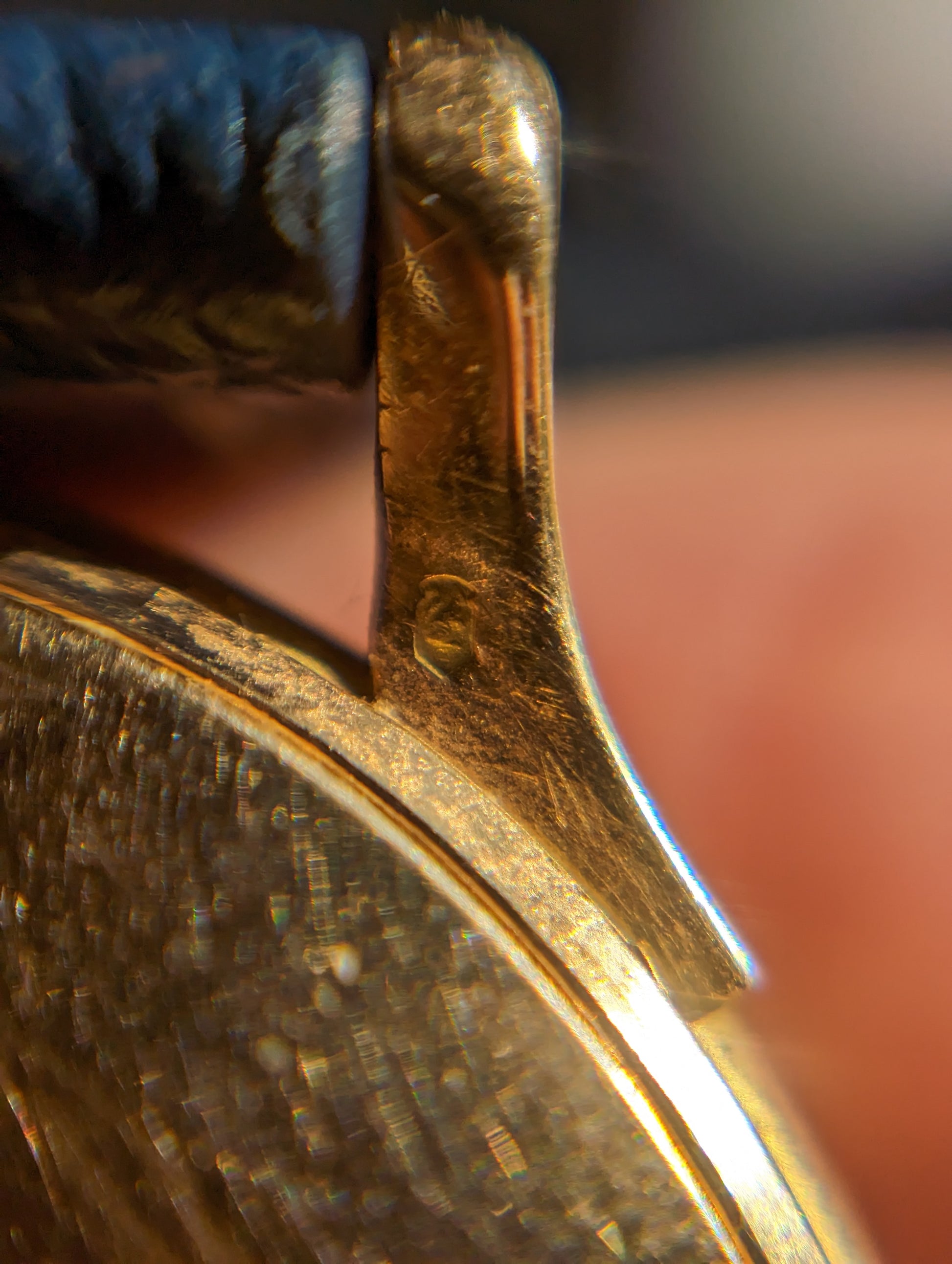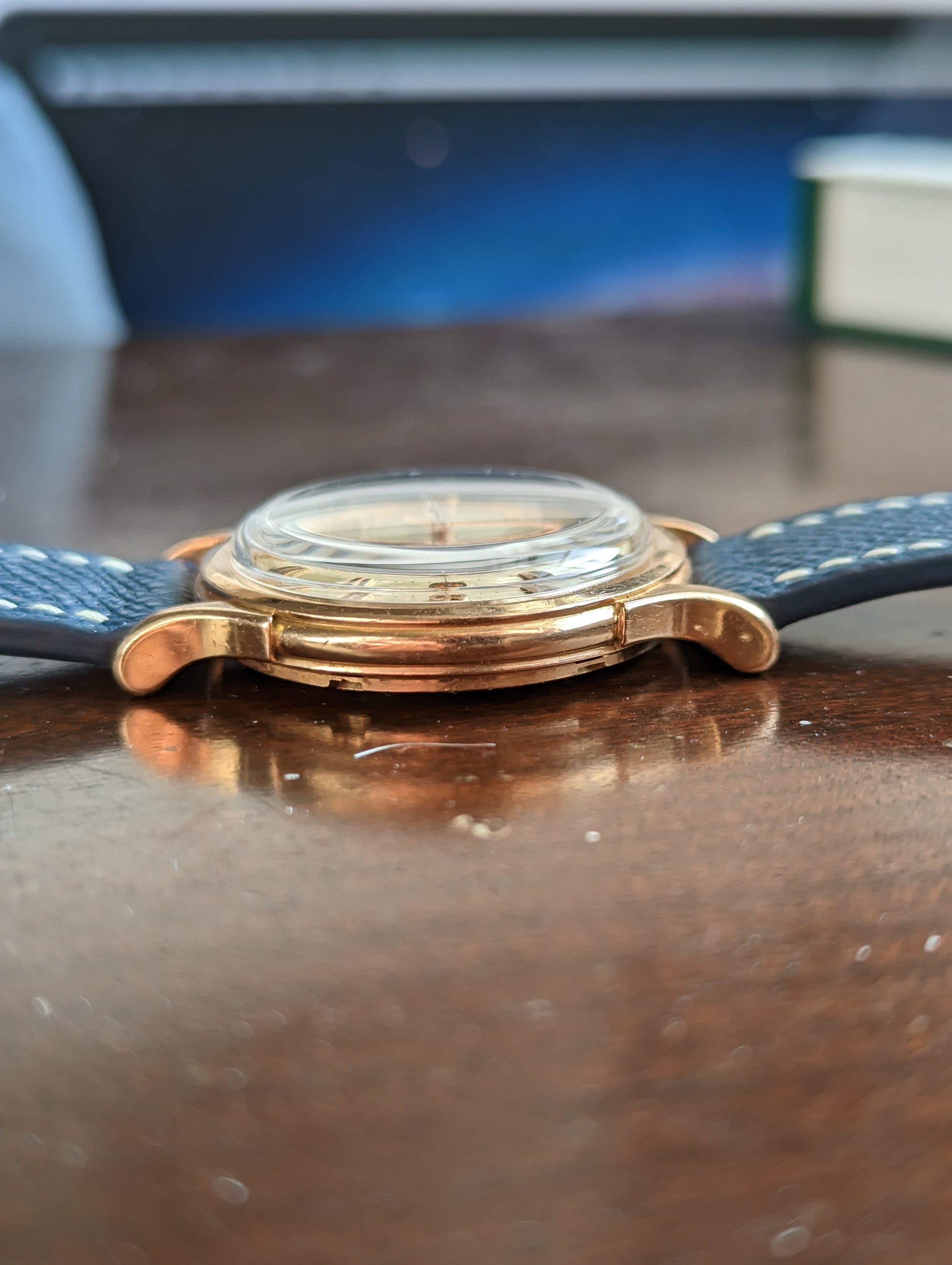 CASE: The solid 14kt rose gold 35mm case is in good shape. The original bevel on the bezel can still be appreciated. The lugs and midcase retain strong lines. The screw down caseback is also in good shape. It shows some wear commensurate with its age. The medallion on the caseback is wonderfully preserved with the all 8 stars present, the observatory is crisp and the grainy sky backdrop still discernable. The crystal was replaced some time in the past. The case is completed by a modern service replacement which is the correct thick decagonal crown in matching rose gold.