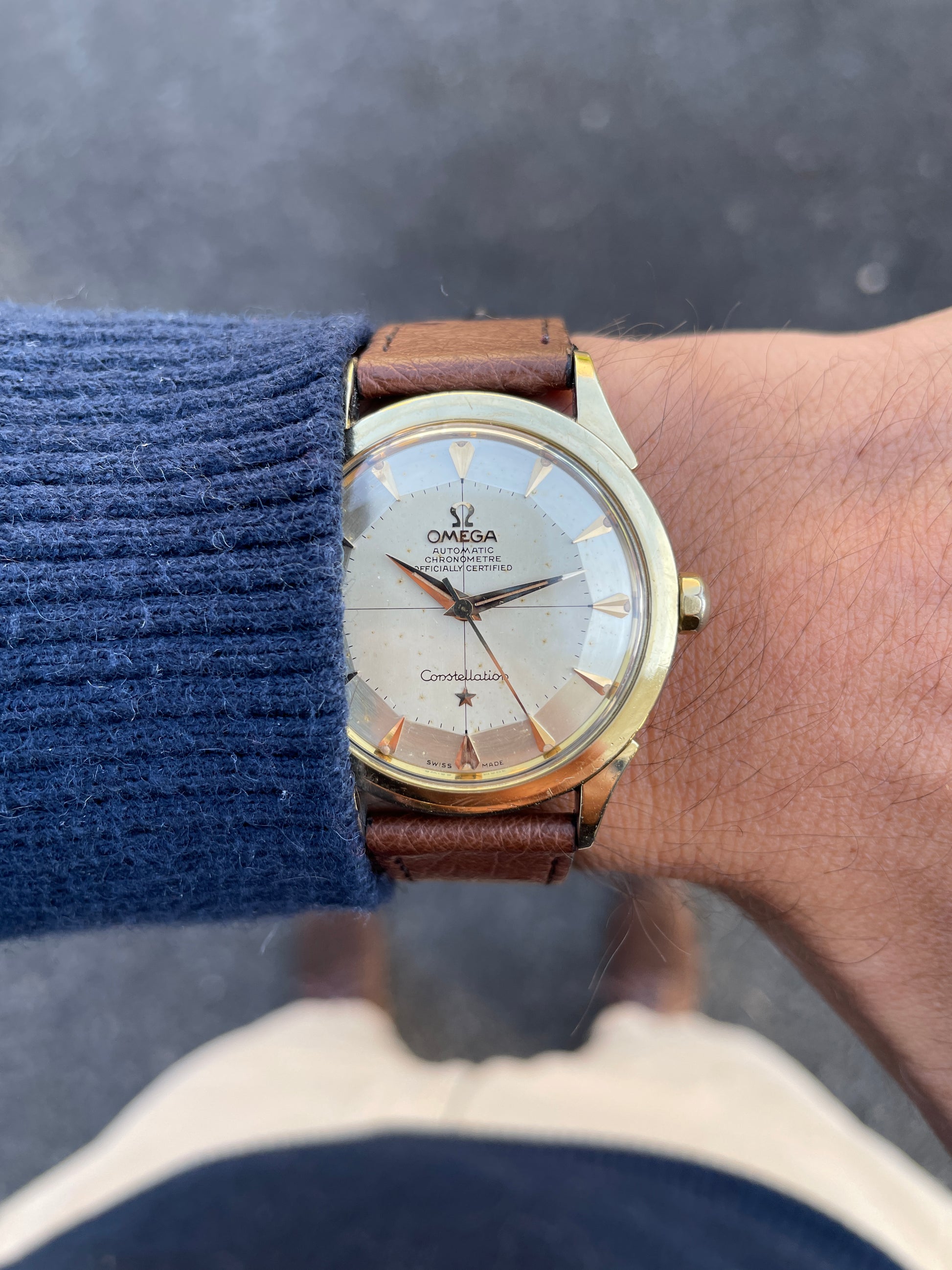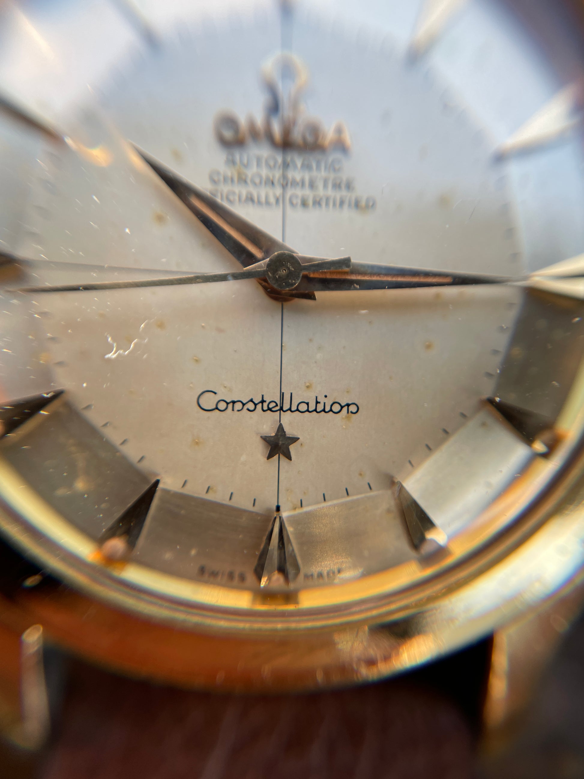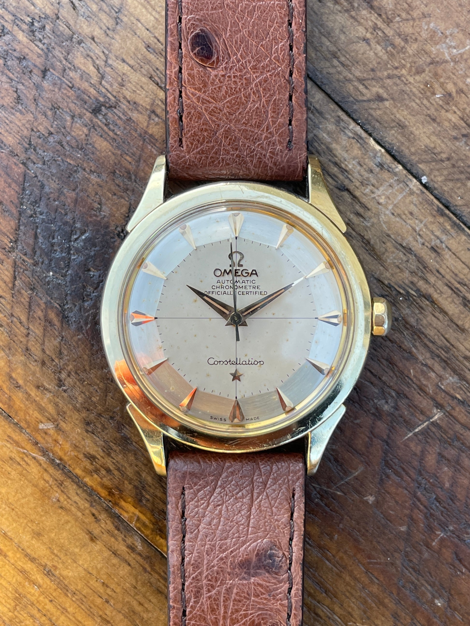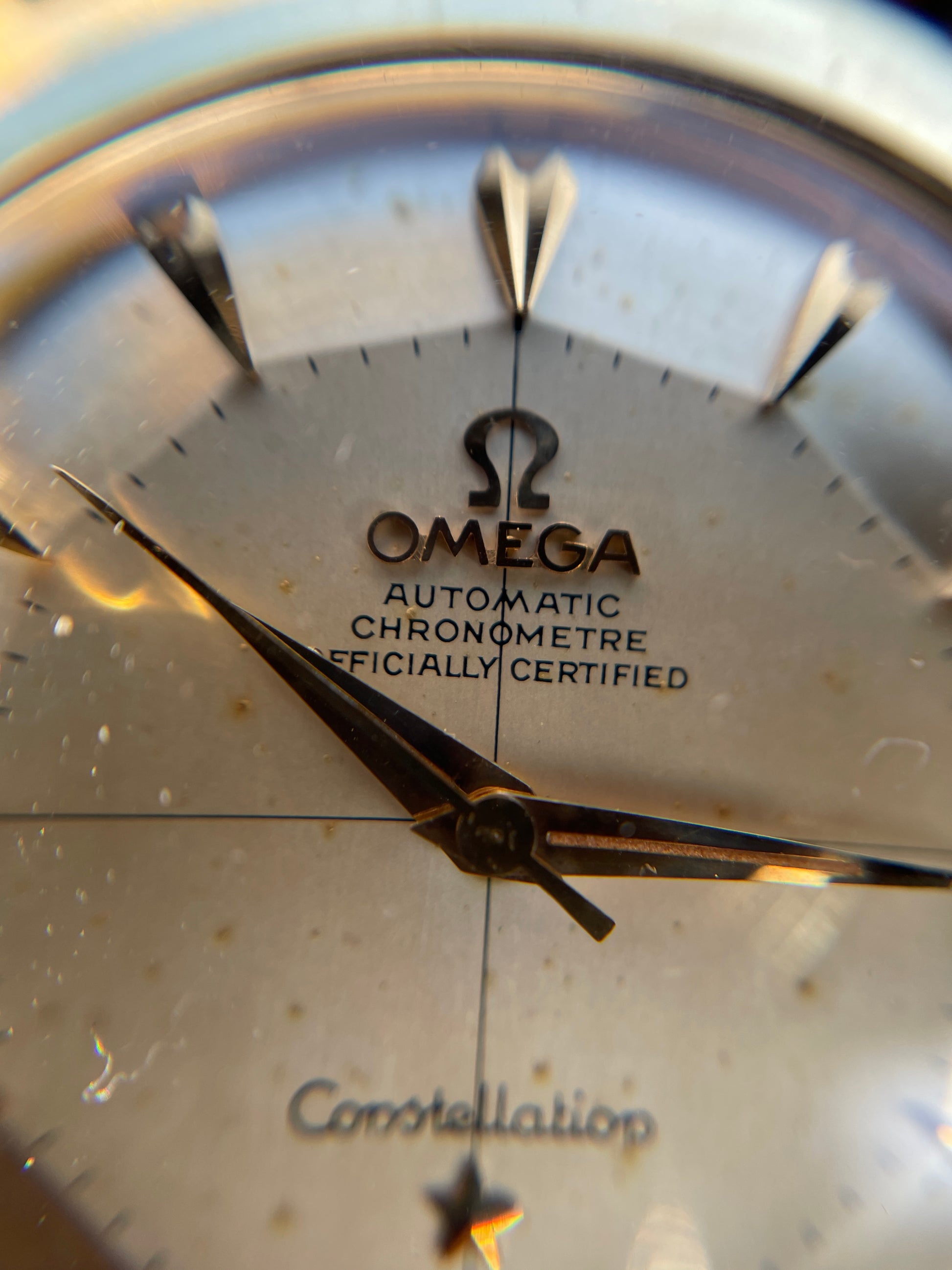 Omega introduced its "Constellation" line in the early 1950's starting with the references 2648 and 2652. The constellation line was Omega's top of the line, time only offering fitted initially with there chronometer certified automatic bumper calibers 352 and 354. This example - a 2852 - is a very collectable and popular reference especially with its highly desirable pie-pan dial. The 2852 represents Omegas evolution and technical advancements as it was the first constellation reference to feature a fully automatic mechanical movement - the 5xx series.