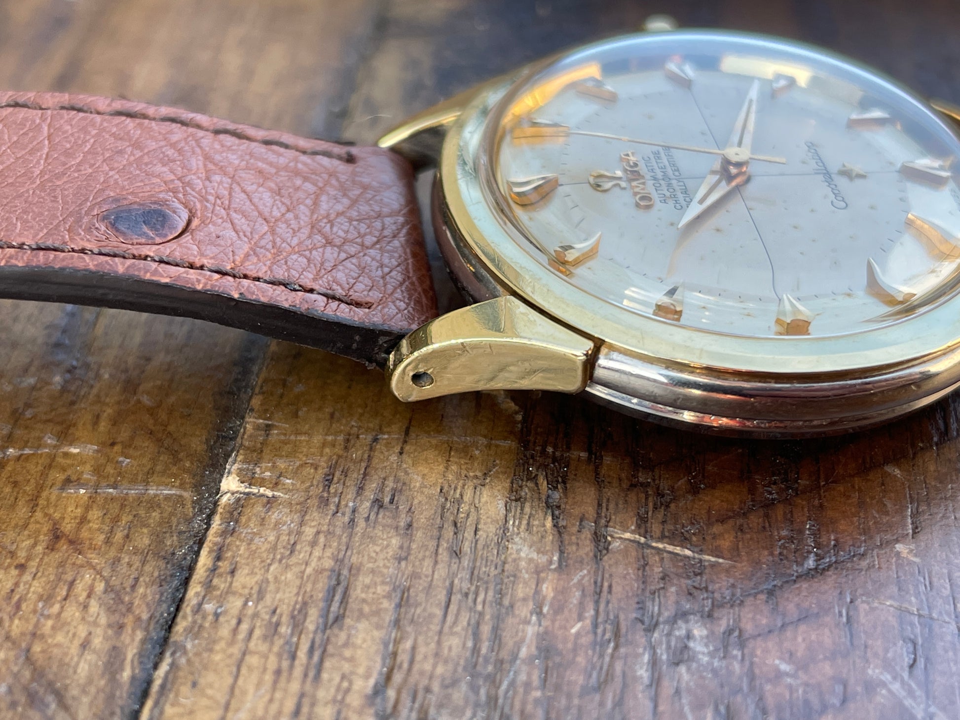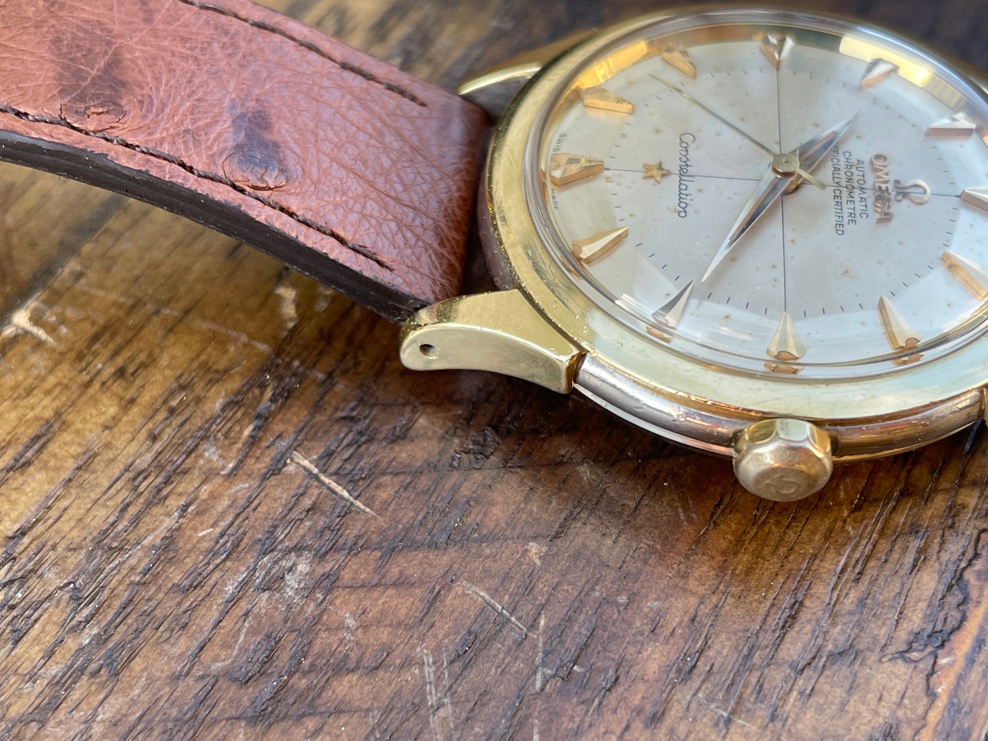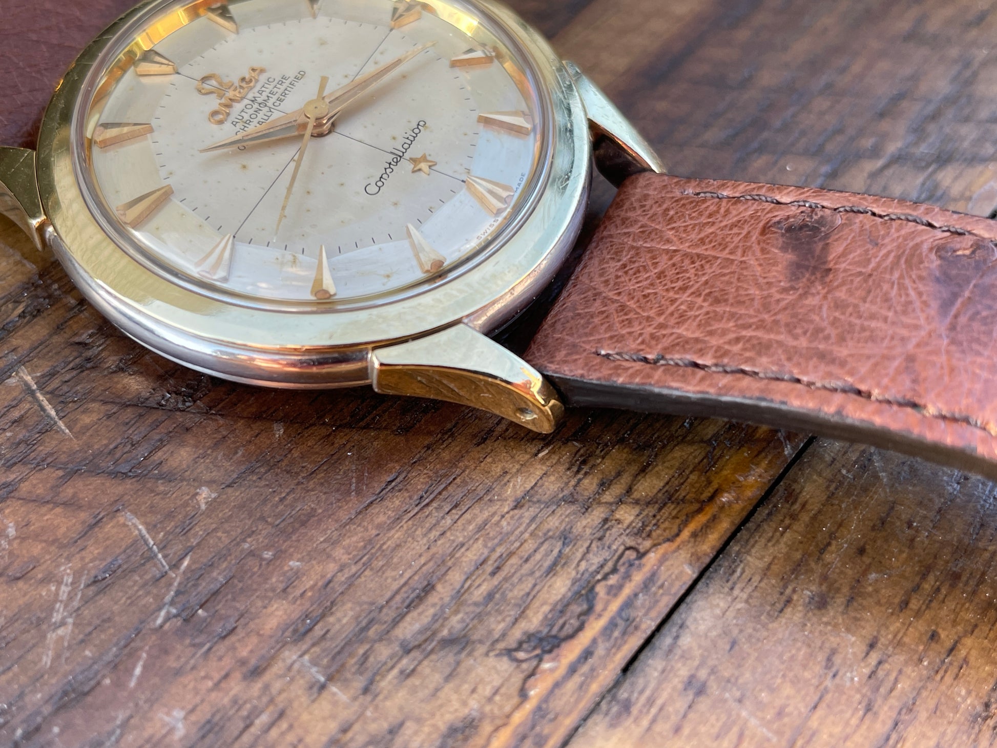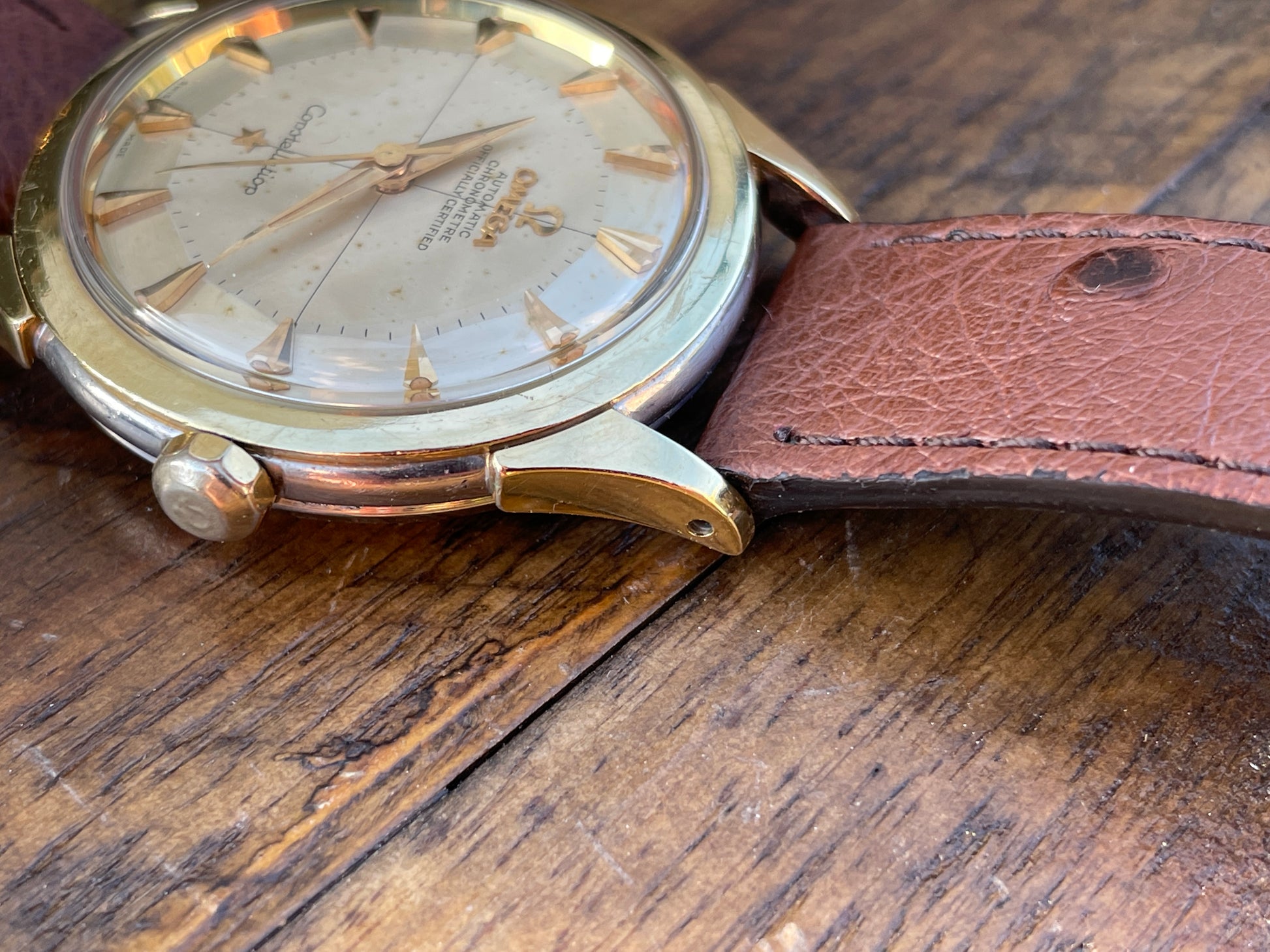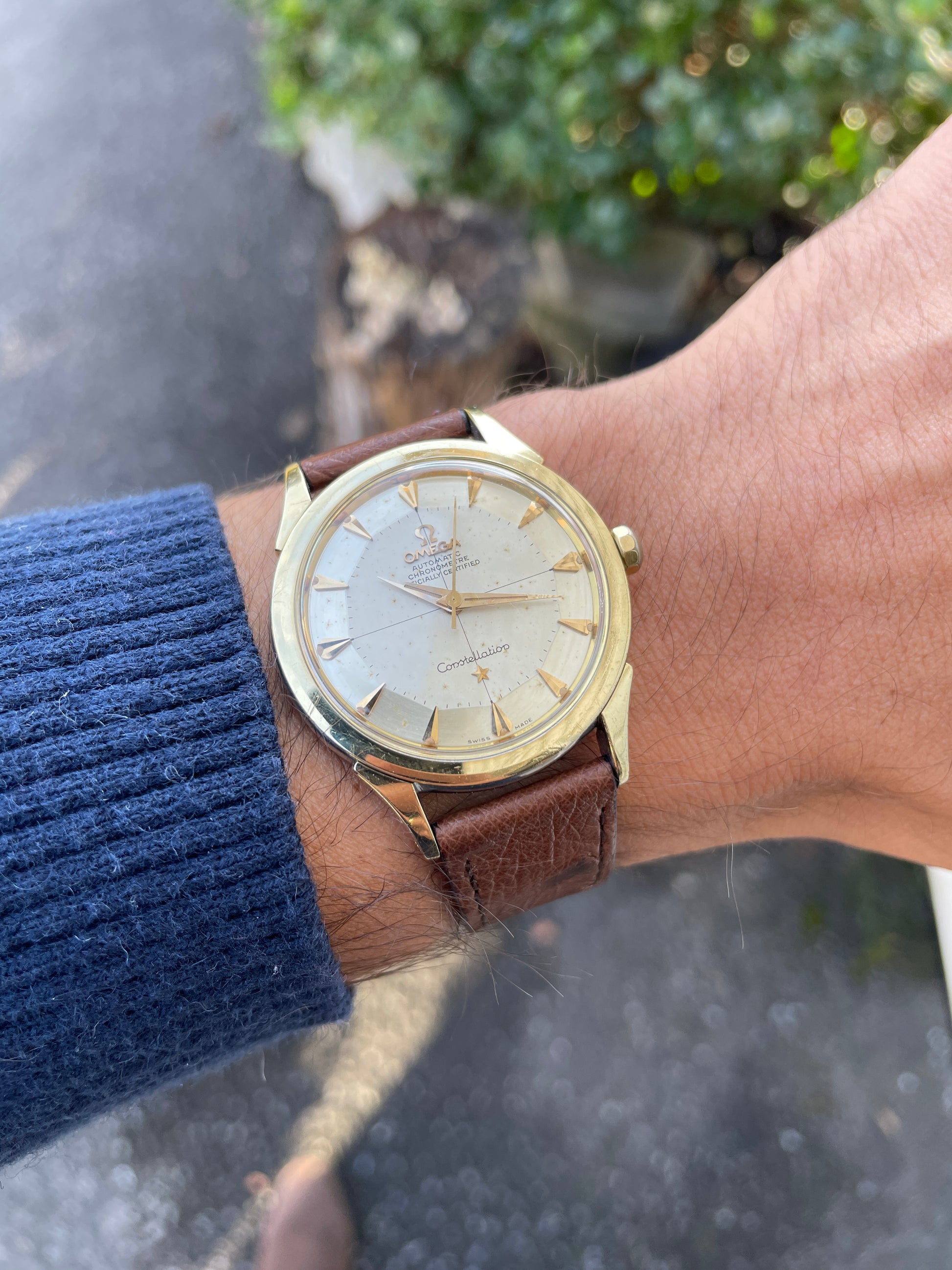 Omega introduced its "Constellation" line in the early 1950's starting with the references 2648 and 2652. The constellation line was Omega's top of the line, time only offering fitted initially with there chronometer certified automatic bumper calibers 352 and 354. This example - a 2852 - is a very collectable and popular reference especially with its highly desirable pie-pan dial. The 2852 represents Omegas evolution and technical advancements as it was the first constellation reference to feature a fully automatic mechanical movement - the 5xx series.