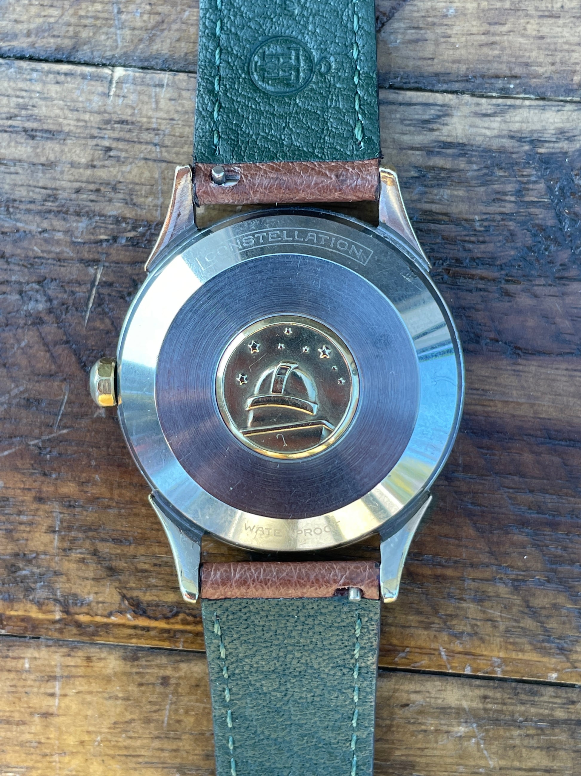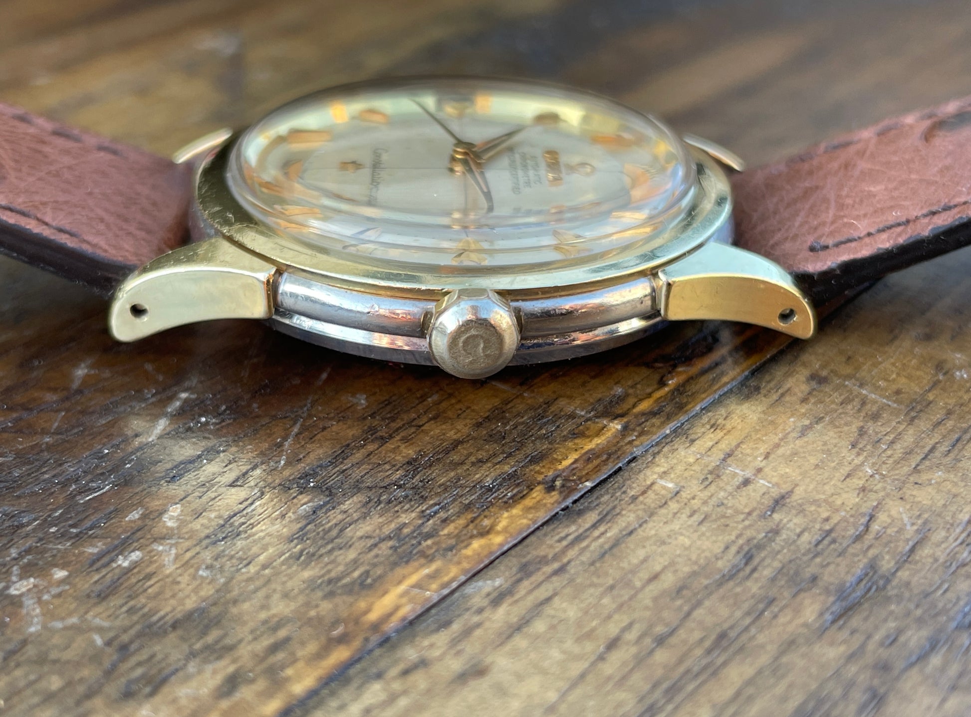 CASE: The 35mm gold cap over steel case has most likely seen a polish or 2 in the past. The case is still in good shape as evidenced by the strong edges on the lugs that articulate with the case. The caseback sports the desirably observatory medallion which is very well preserved and the original brushed finishing on the caseback itself can still be appreciated. The crystal has been replaced sometime in the past. The original, thick decagonal crown has seen some of the gold cap wear off and steel showing through.