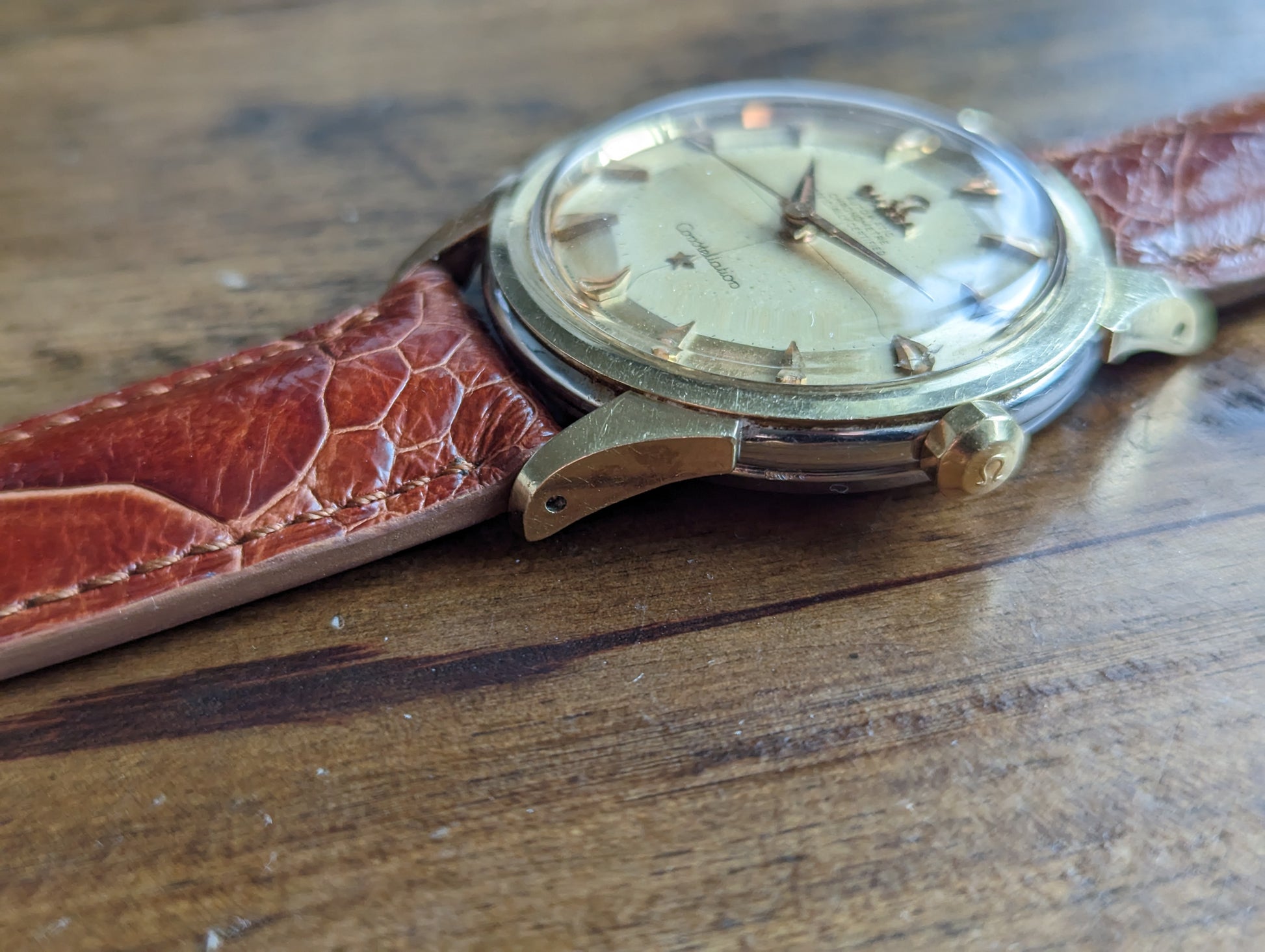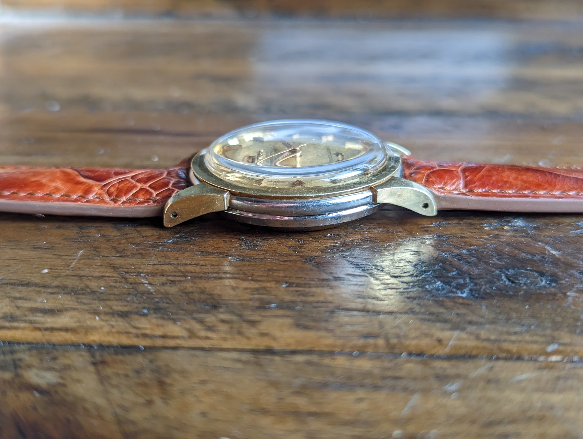 CASE: The 35mm gold capped over steel case is in wonderfully preserved condition - perhaps unpolished altogether. The bevel on the bezel, what is most likely to go when a gold capped case is polished, is still present and strong. The lugs demonstrate great definition with well reserved lines with the capping still noticeable on the back of the lugs over the steel. The crystal has just been replaced during its service. The case is completed by the watches original, thick, decagonal crown. A wonderful touch.