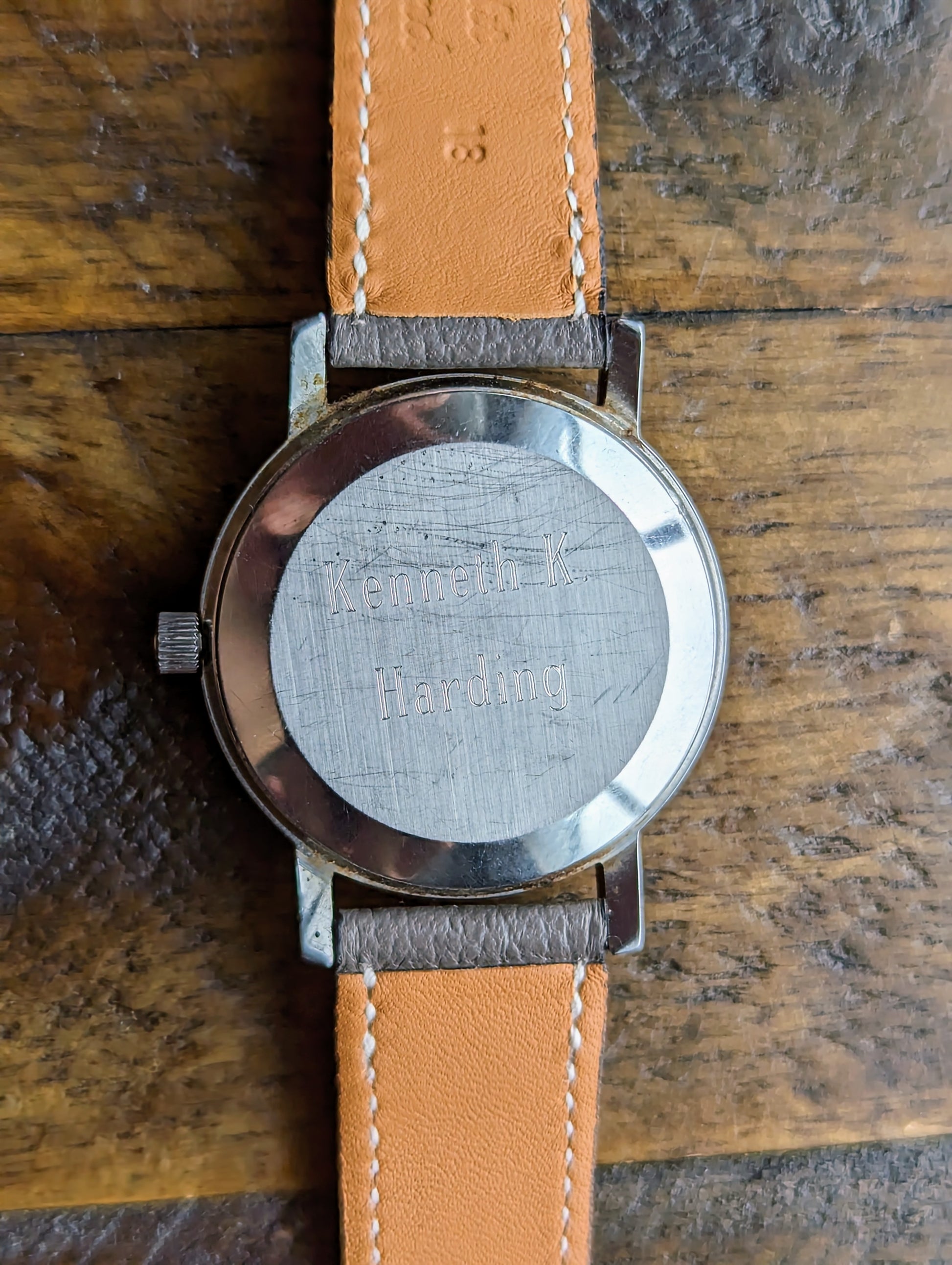CASE: The stainless steel 34mm case is unpolished. The facets on each of the four lugs can still be discerned. The case presents with even wear throughout commensurate for its age. It has an engraving on the caseback that reads "Kenneth K. Harding" - presumably the original owner of the watch. The case is completed by its original crown.