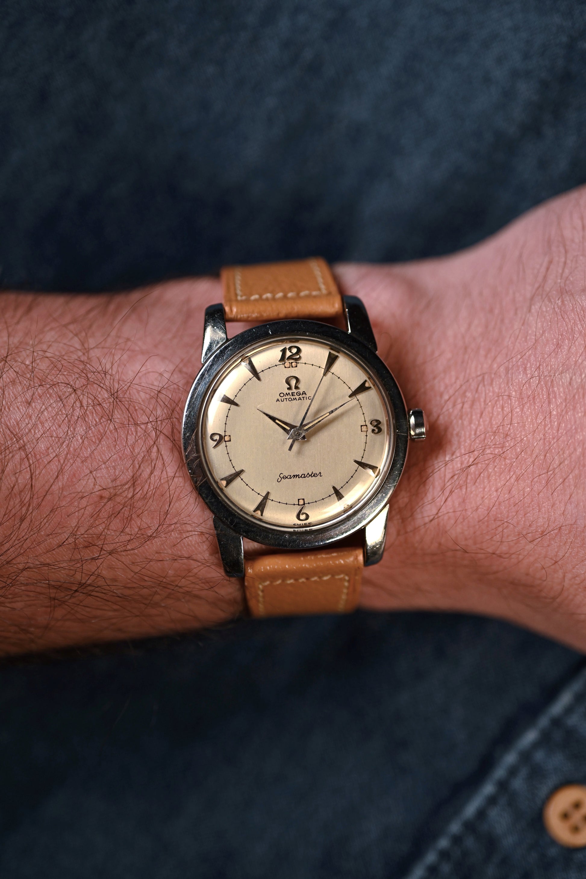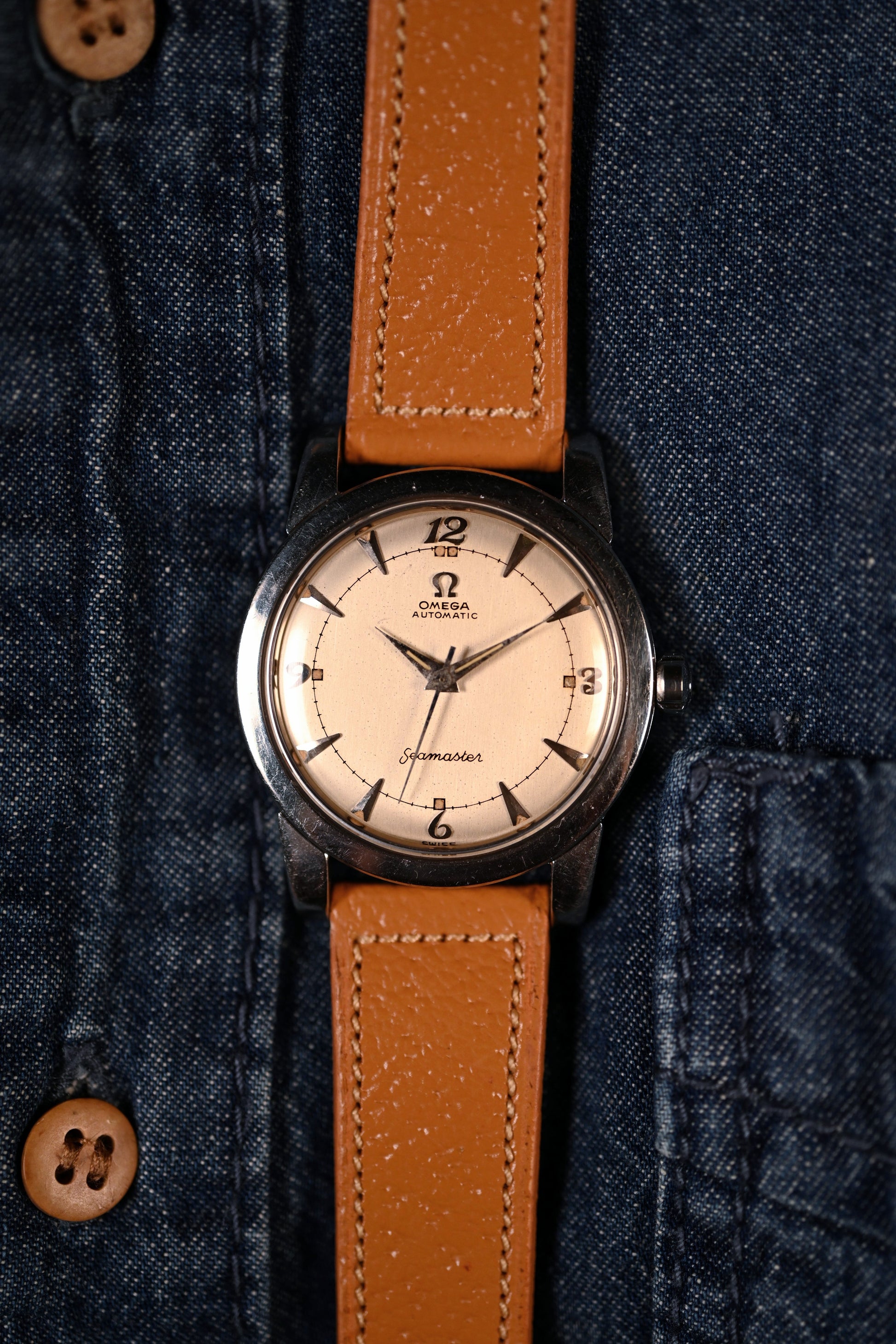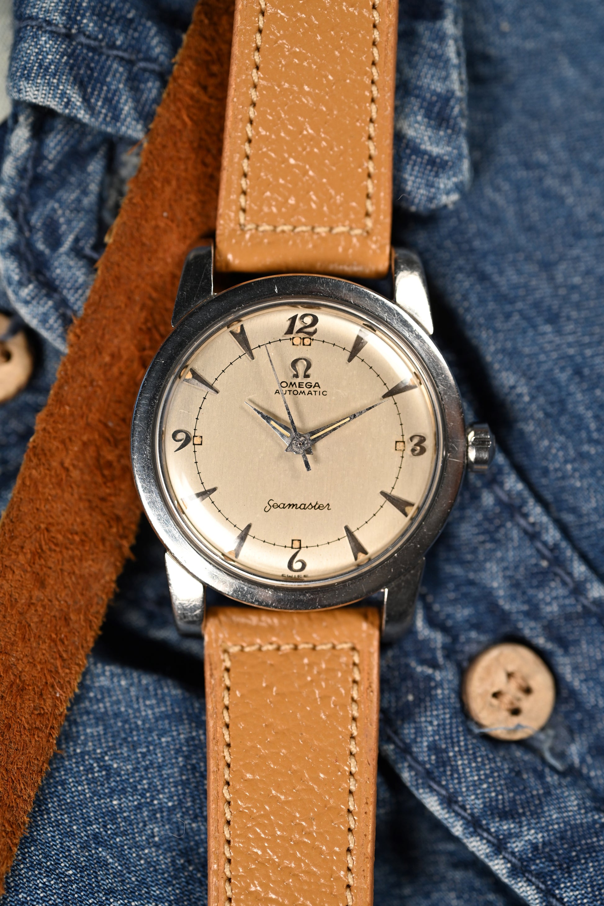 Omega introduced its Seamaster line in 1948. Today it remains Omegas longest continuous running production model. Originally it was released with the advertising catch phrase: "For town, sea and country." A nod to the intent behind the design. A watch that could go anywhere and do anything. Perfect for every type of occasion. The Omega Seamaster was introduced with the references 2577 and 2576 with center second or sub second configurations respectively. They were powered by bumper automatic movements - sometimes chronometer certified. They featured a variety of dial configurations with some exceedingly more scarce, rare and therefore coveted than others.