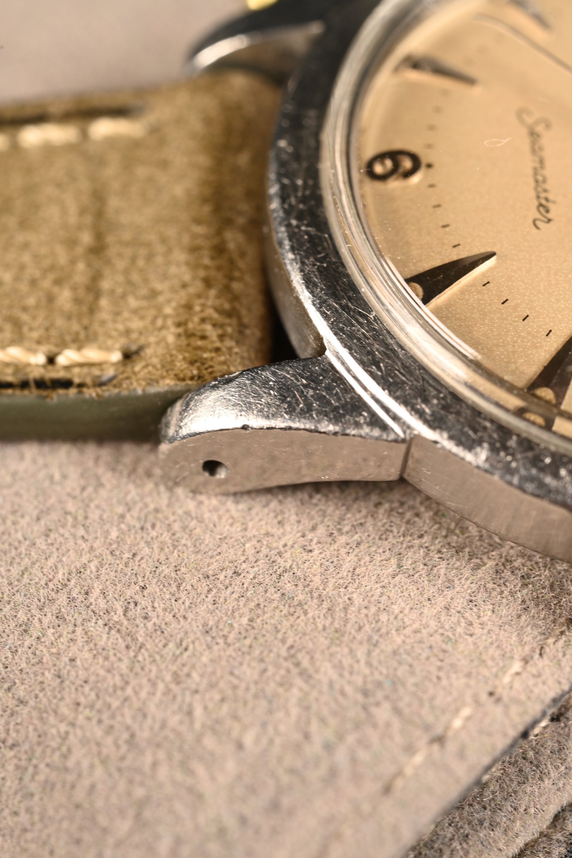 CASE: On this example we have an early, first generation, seamaster case. It measures 34mm in diameter. It is considered a very strong case, with light polishing in the past. The case retains strong, original factory lines. The strength of the case is further exemplified when examining the case back of which the original circular brushing can still be appreciated. Because of how faint this was originally when it left the factory typically it is lost as a result of polishing. The case presents with even wear throughout commensurate with its age. The crystal has been replaced some time in the past. It is completed by its original crown.