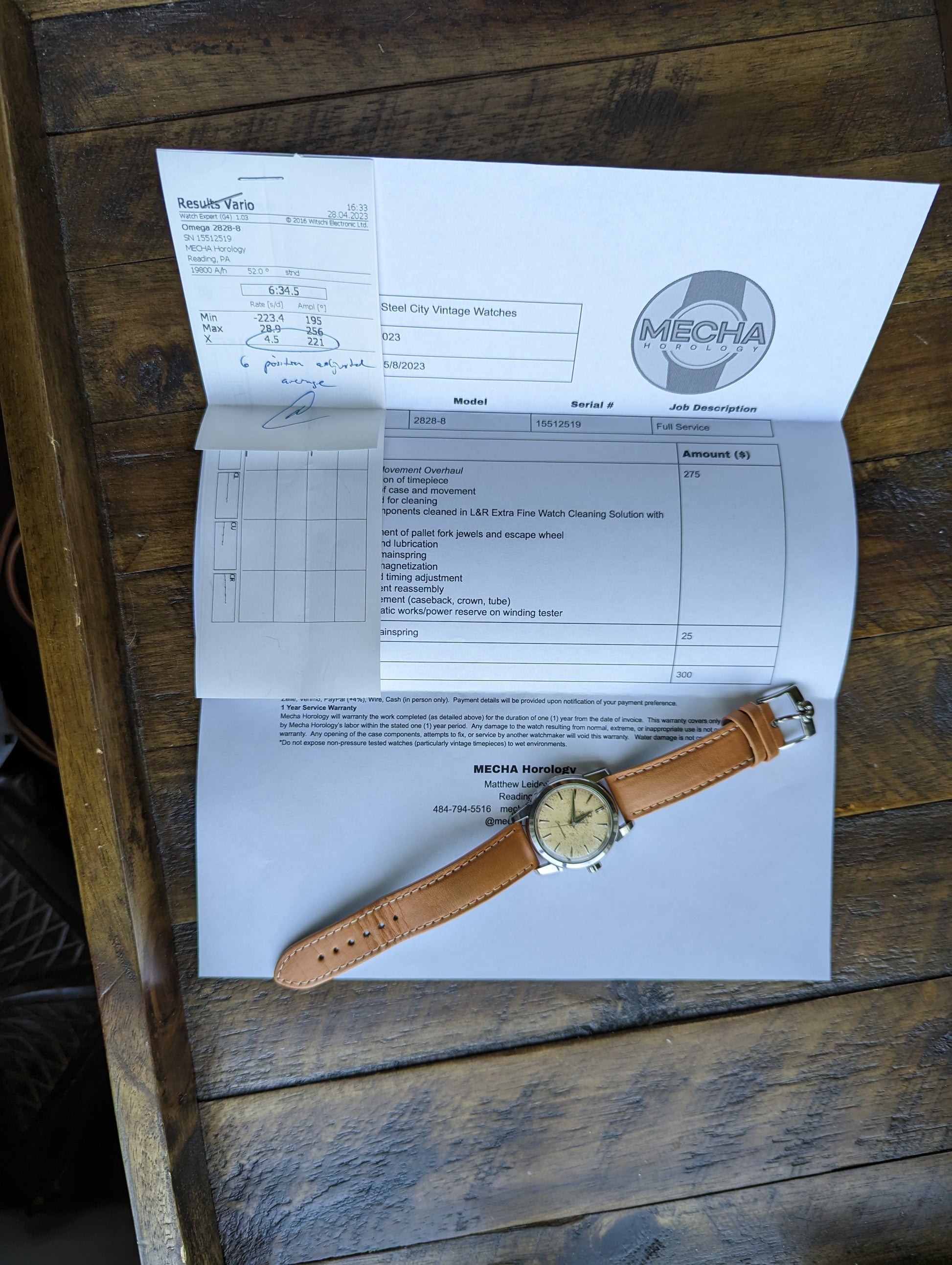 ACCESSORIES: Comes with itemized invoice from the service and one year warranty. The service cost totaled $300. Also comes with an OEM Omega vintage style buckle on the strap.