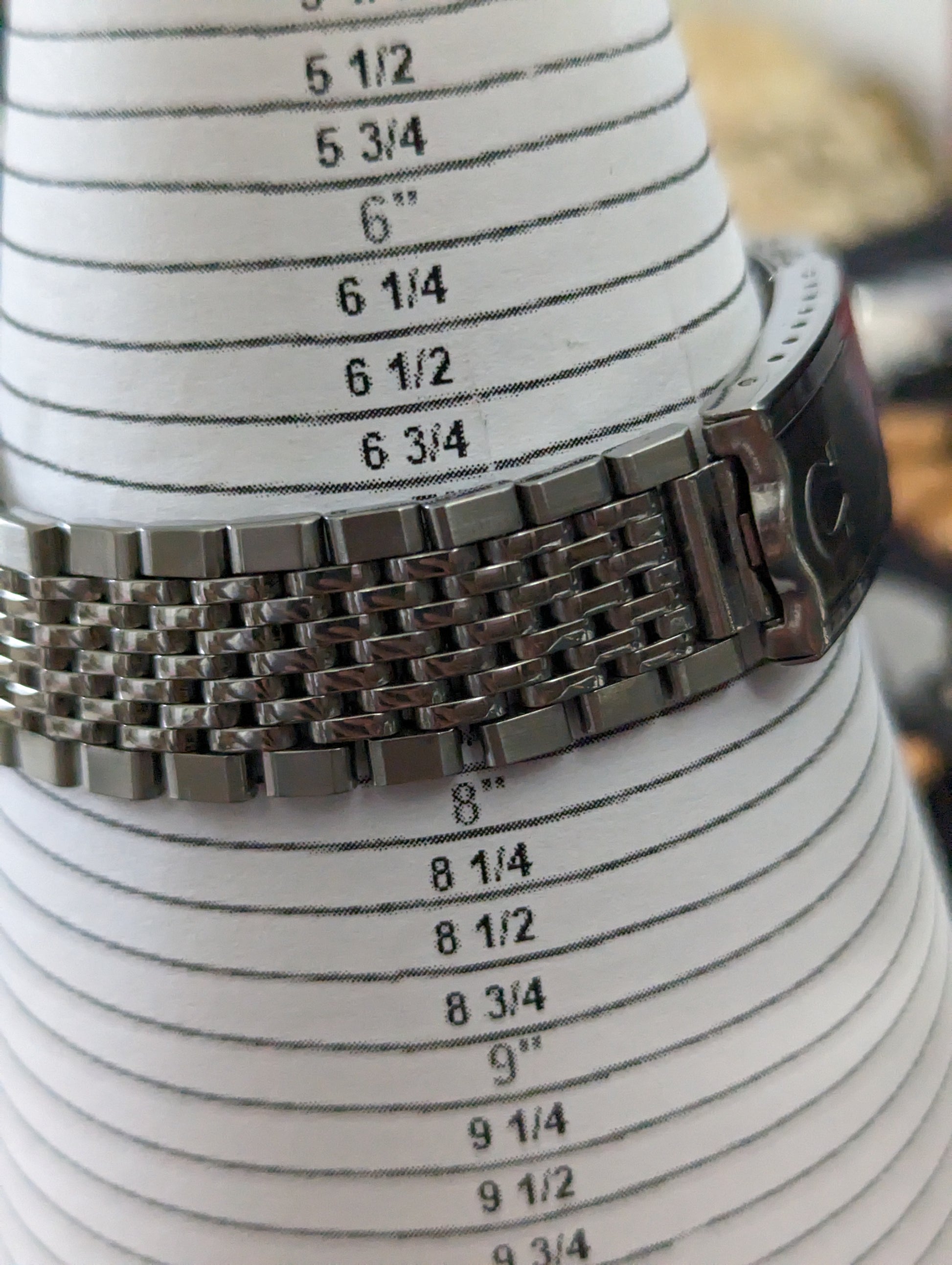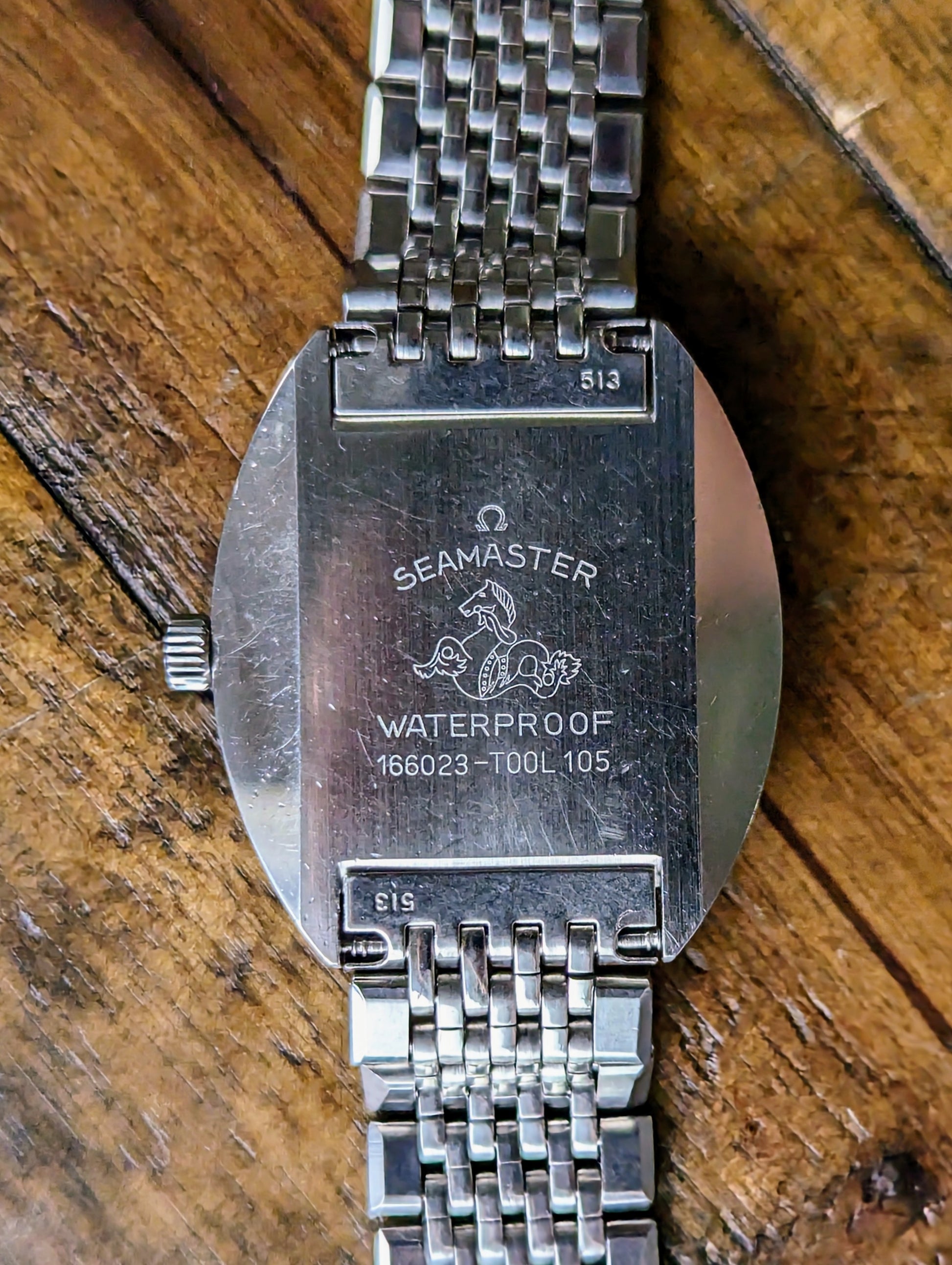 BRACELET: Comes on the watches original, Omega signed, stainless steel , 7 row beads of rice bracelet complete with the correct 513 end links and Omega stamped clasp. Uncommon to find these examples with their original bracelets. Bracelet fits a wrist up to 8 inches.