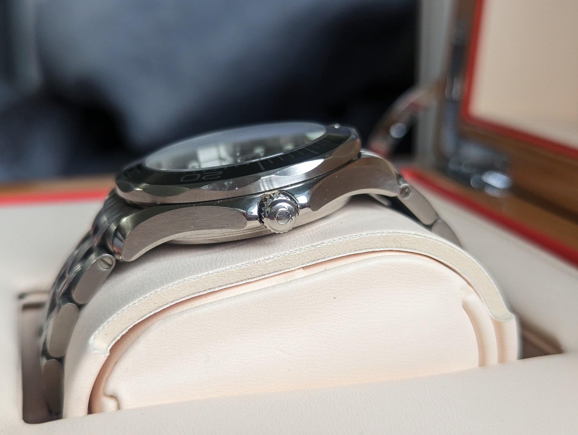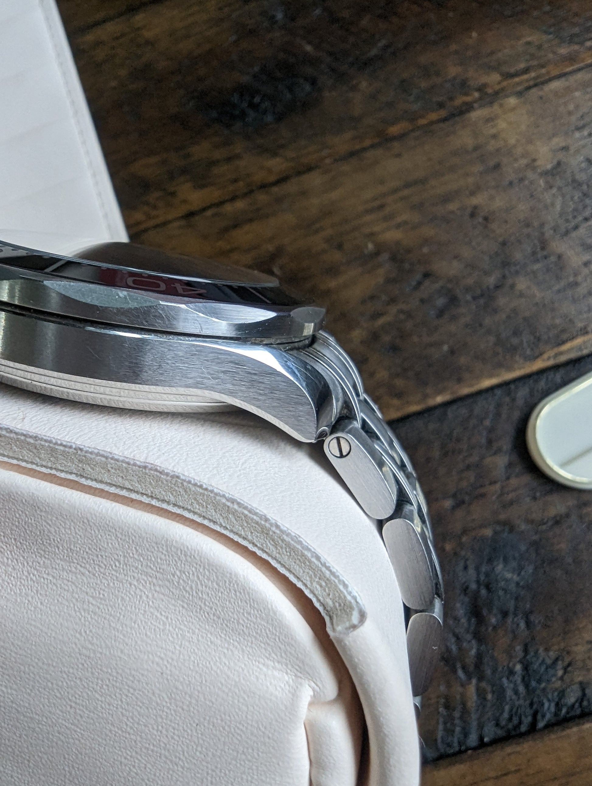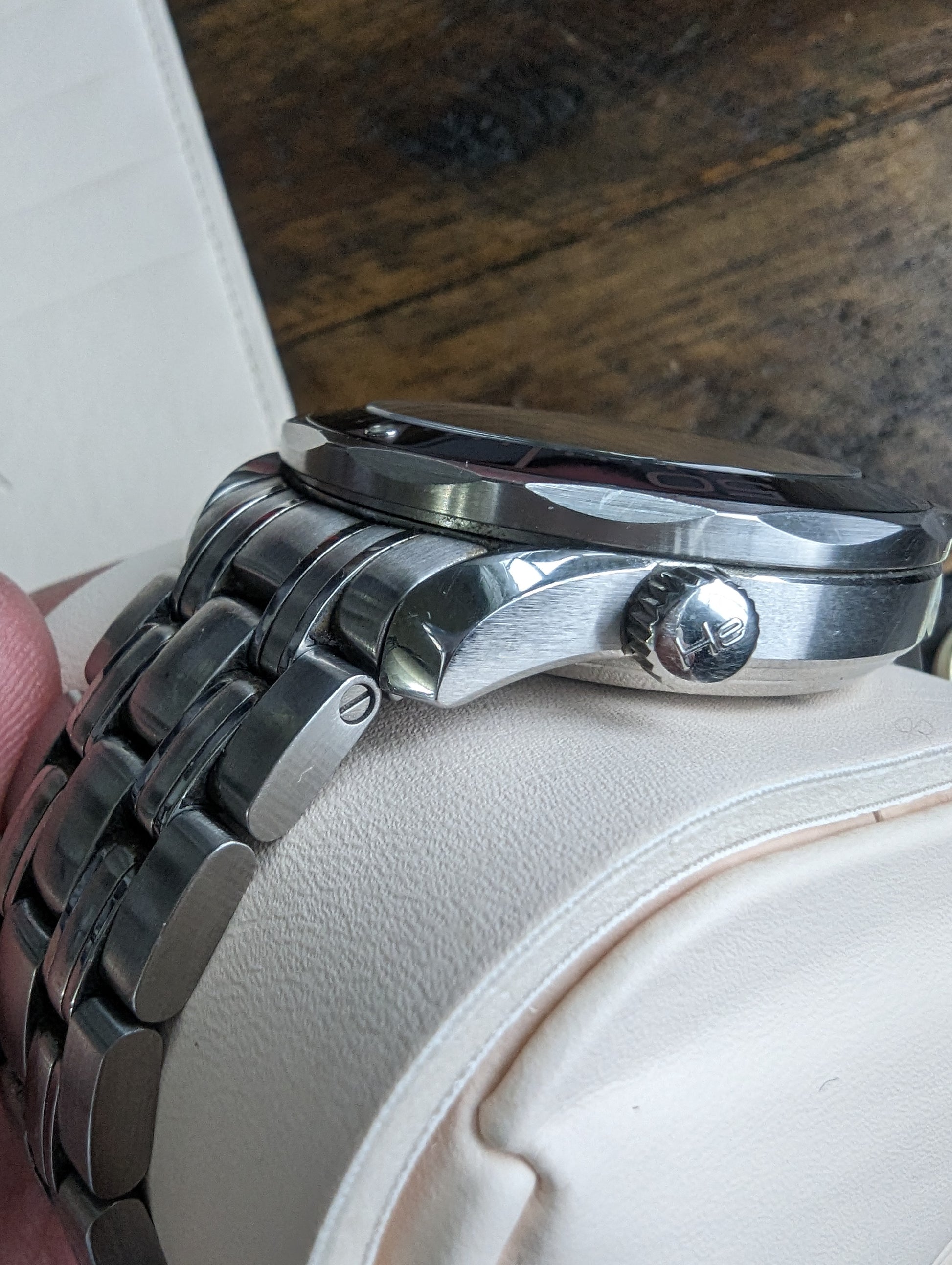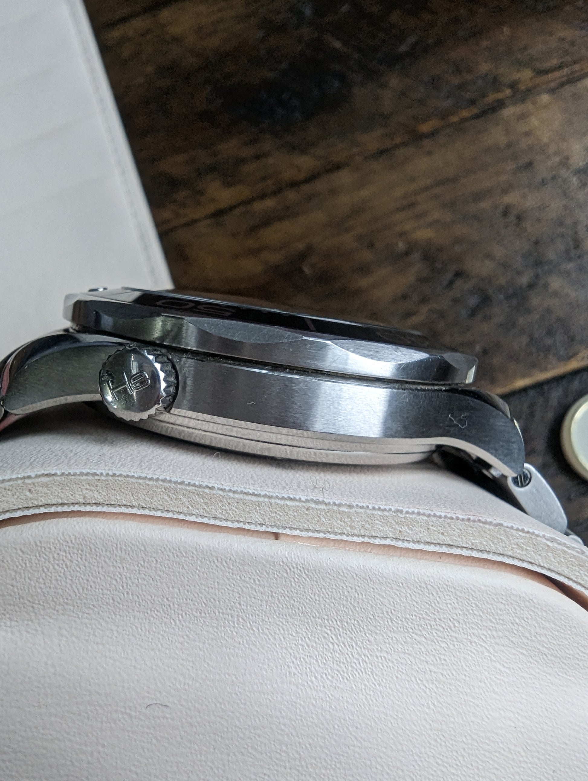 CASE: The case dimensions are as follows: diameter 41mm, lug to lug 47.4, thickness 13.1mm. 300m water resistance. The case is in good shape with light wear from use. Saphire crystal.