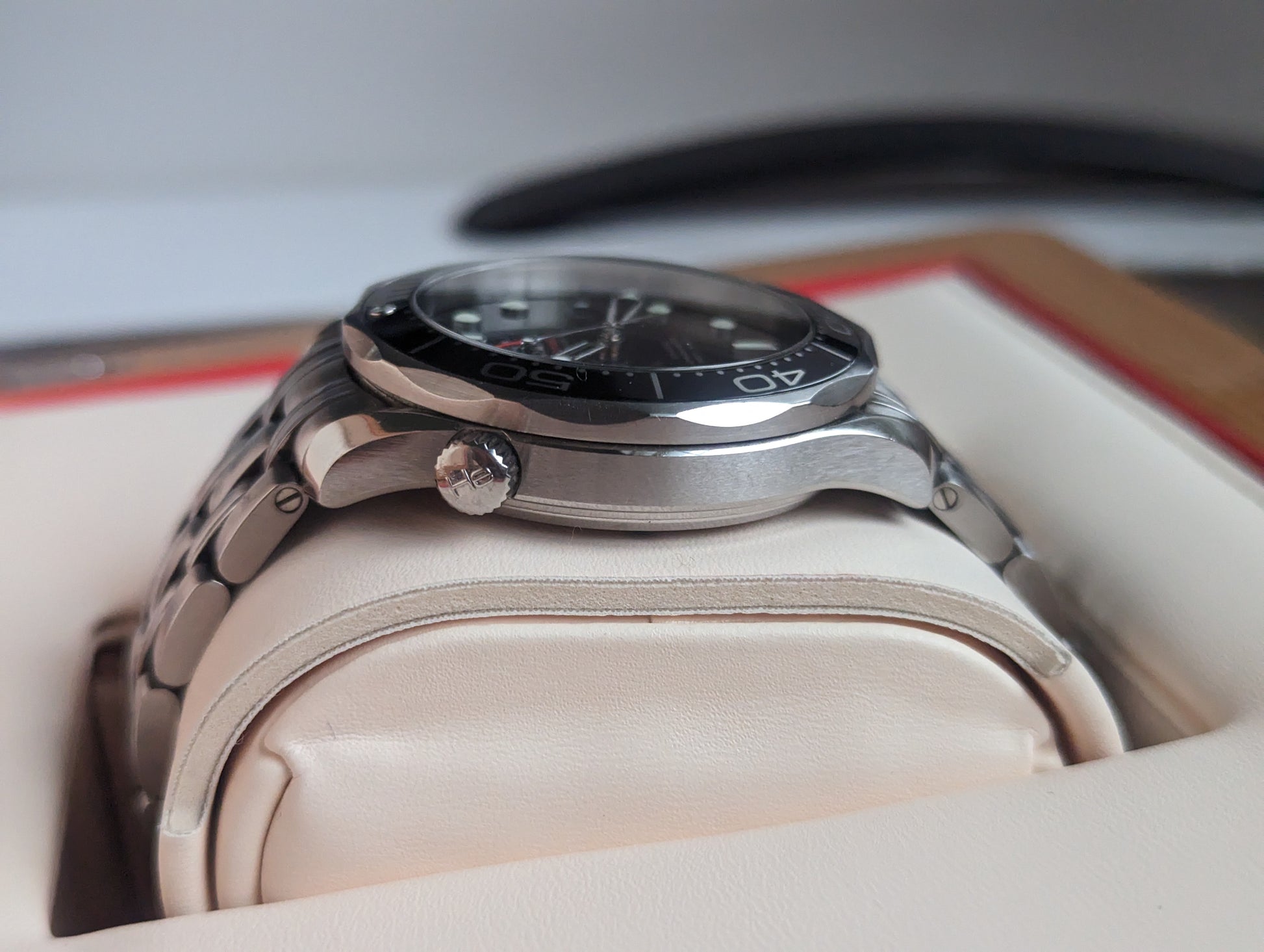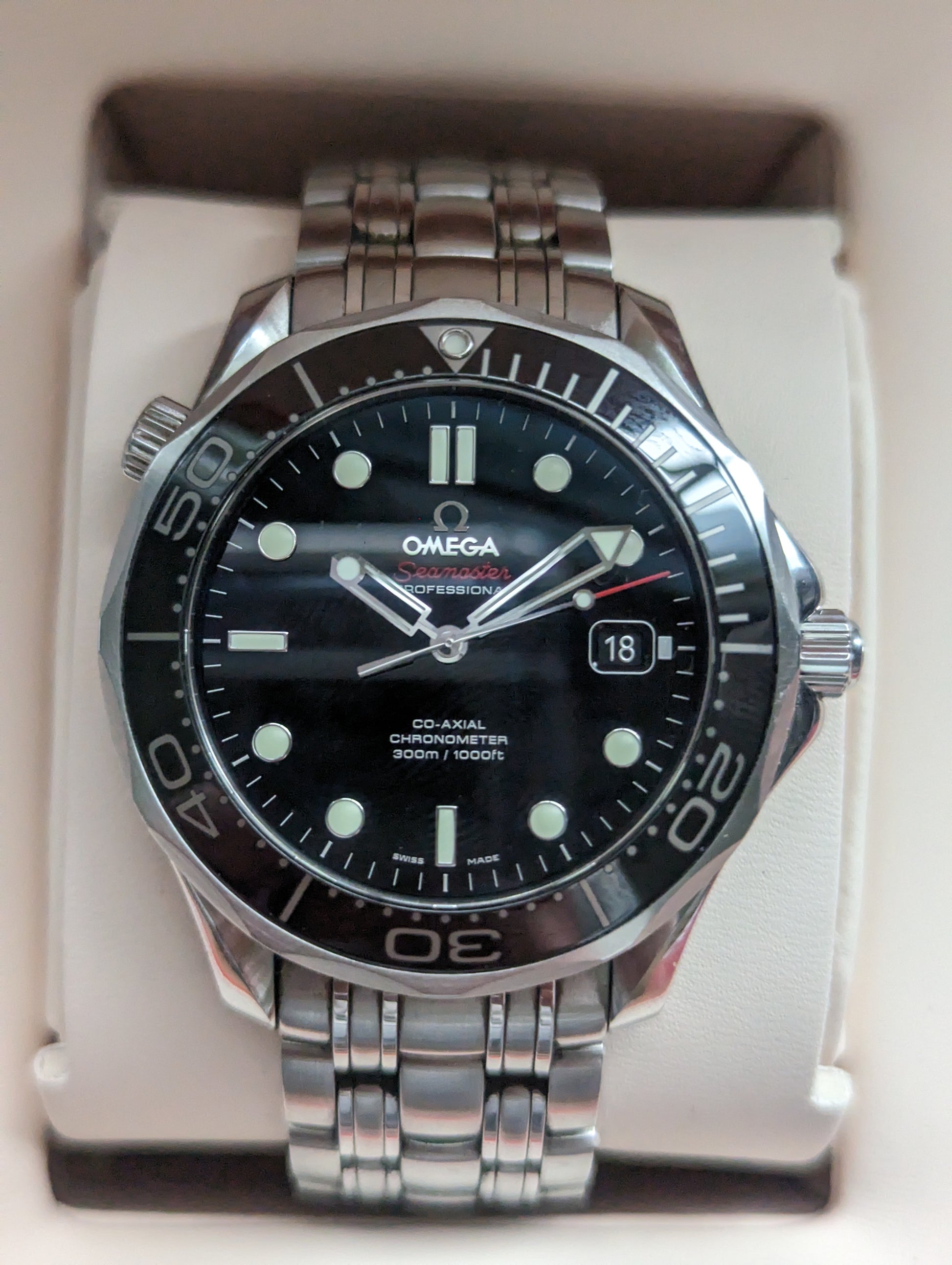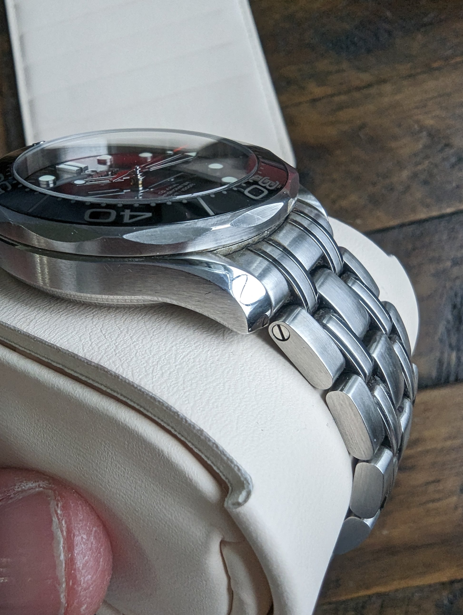 CASE: The case dimensions are as follows: diameter 41mm, lug to lug 47.4, thickness 13.1mm. 300m water resistance. The case is in good shape with light wear from use. Saphire crystal.