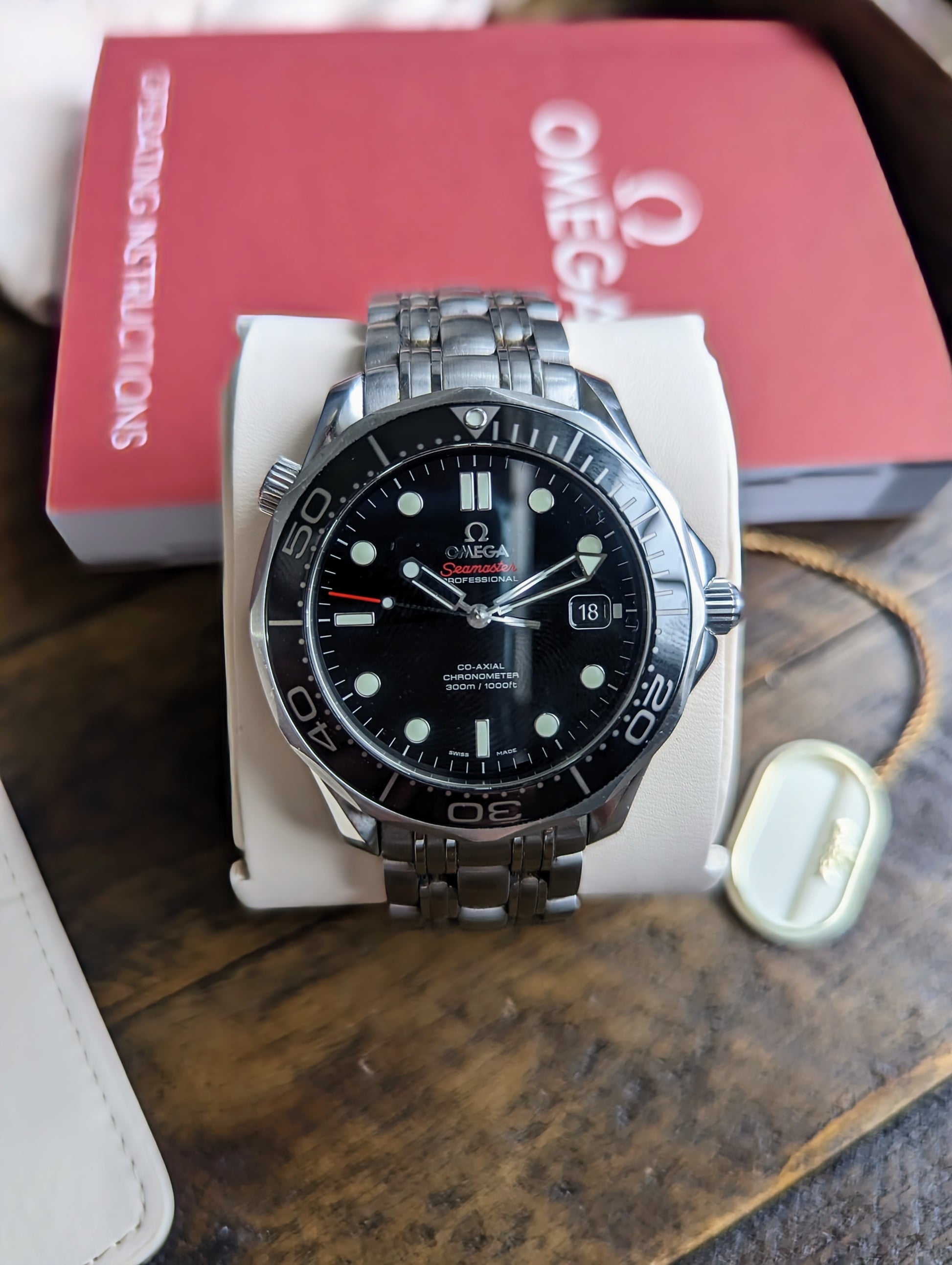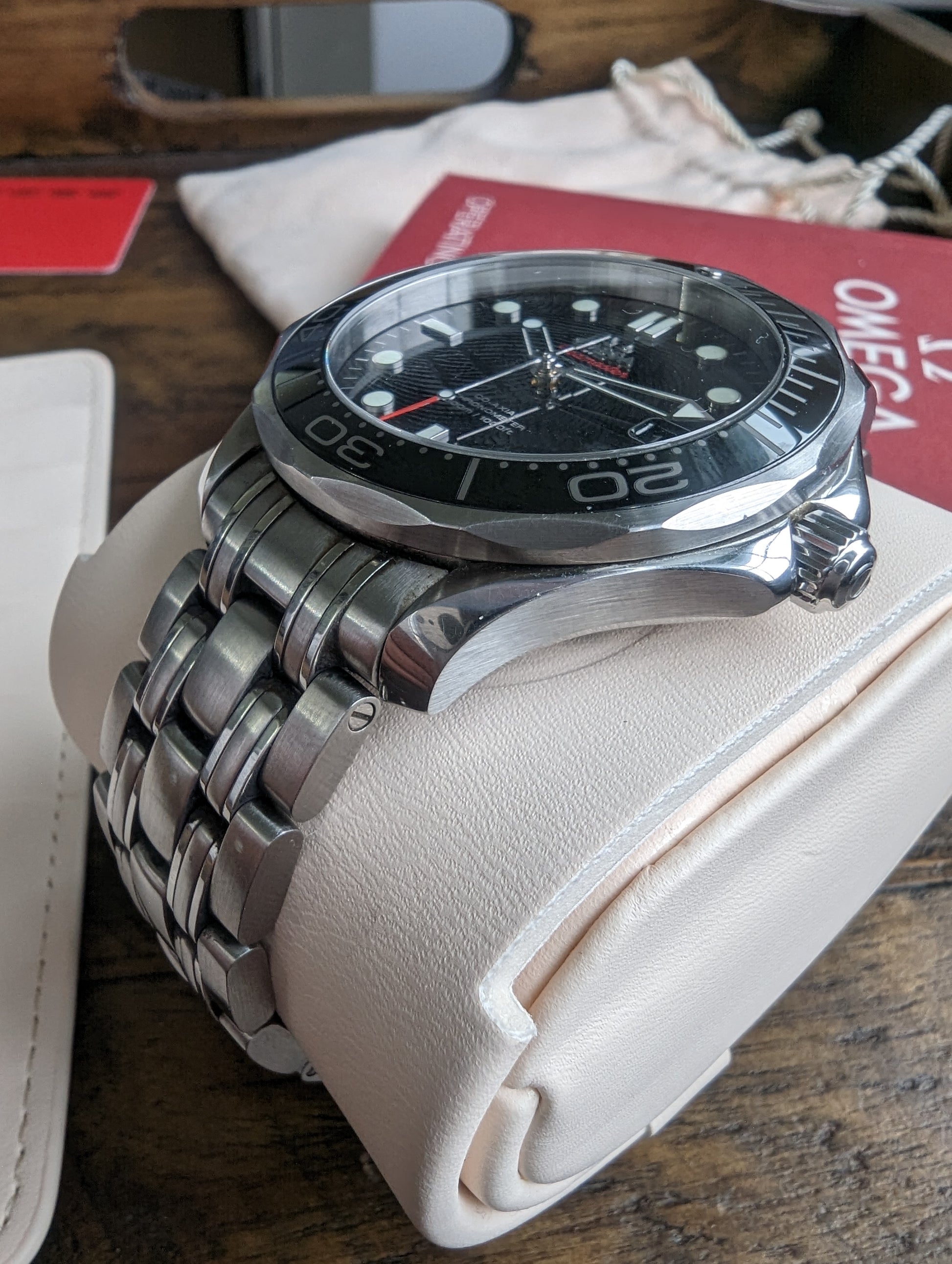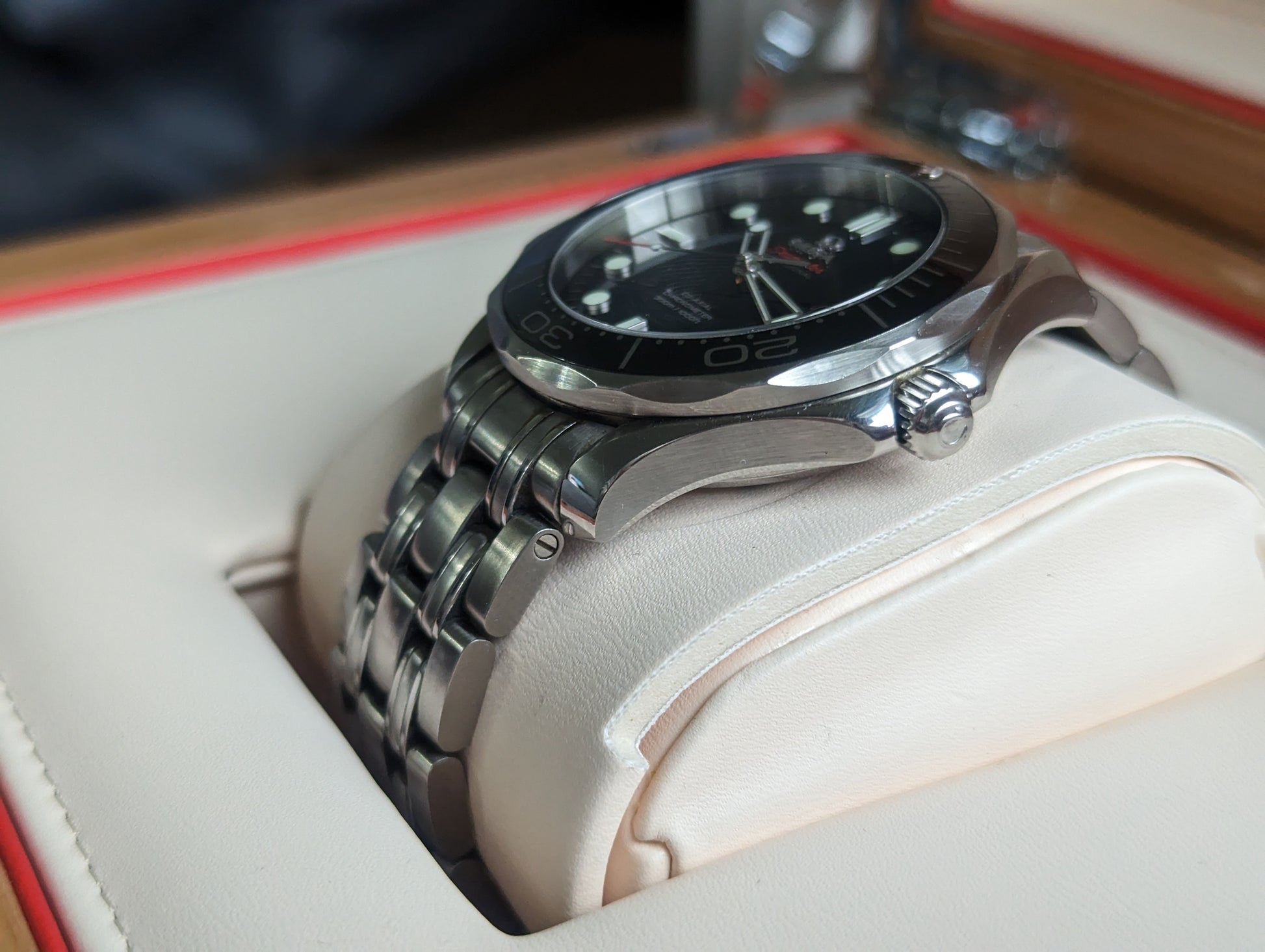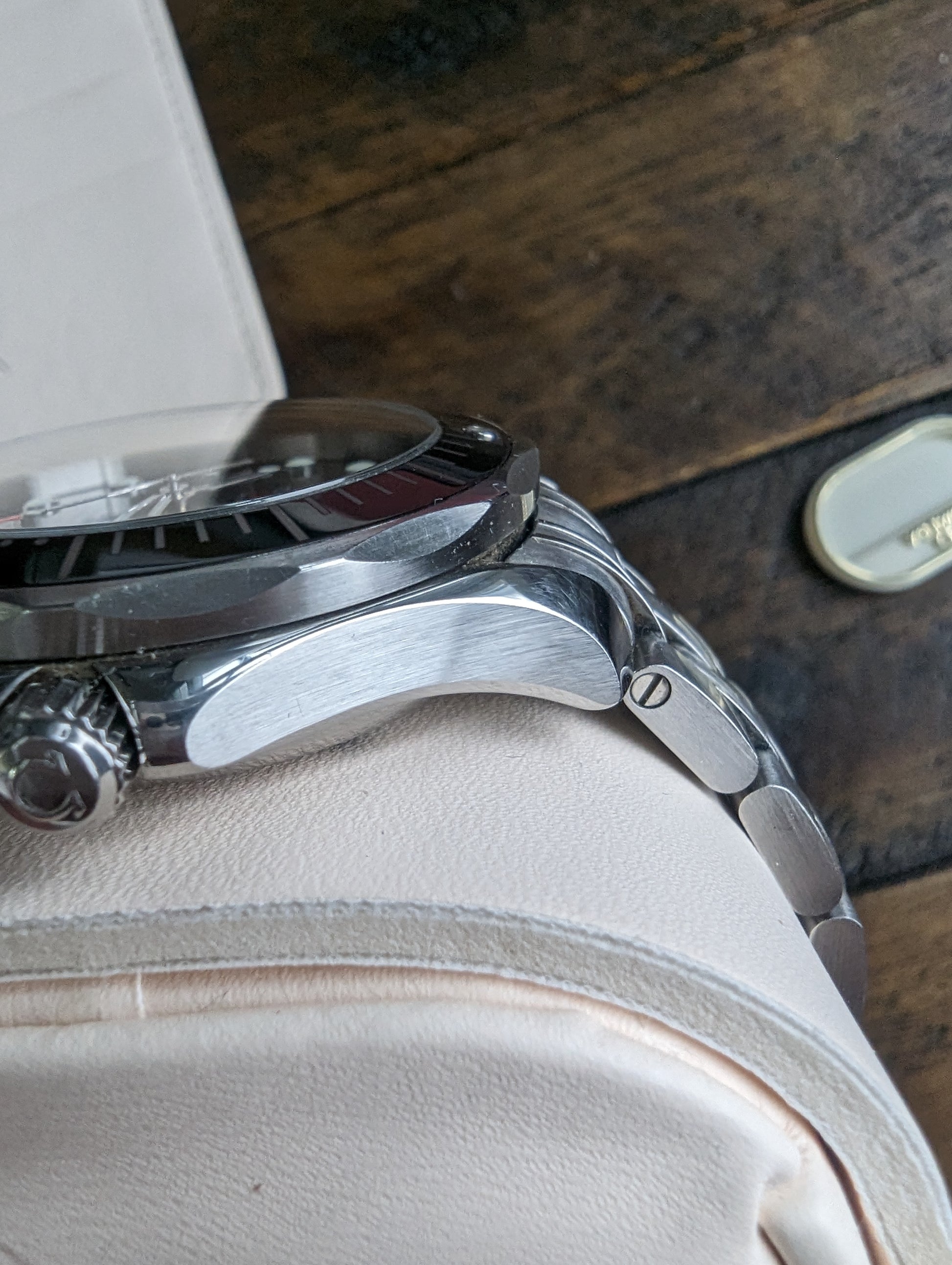CASE: The case dimensions are as follows: diameter 41mm, lug to lug 47.4, thickness 13.1mm. 300m water resistance. The case is in good shape with light wear from use. Saphire crystal.