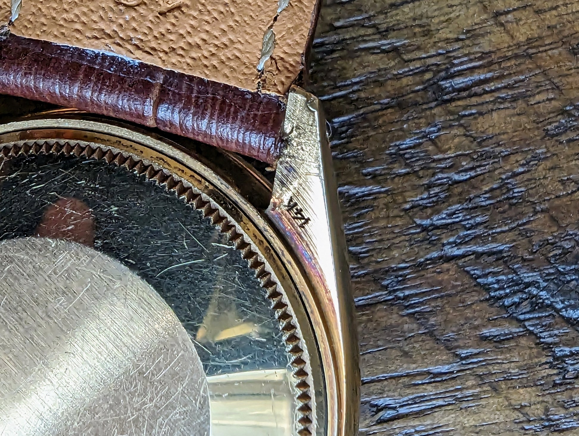 CASE: The solid 14kt yellow gold 34mm case is in good shape for its age. Its been polished in the past. All four lugs illustrate the brushed polished finish on their anterior most portion. The case presents with wear commensurate for its age. It demonstrates a dark burgundy tarnishing in various spots of the case and lugs that can develop from years of sitting.
