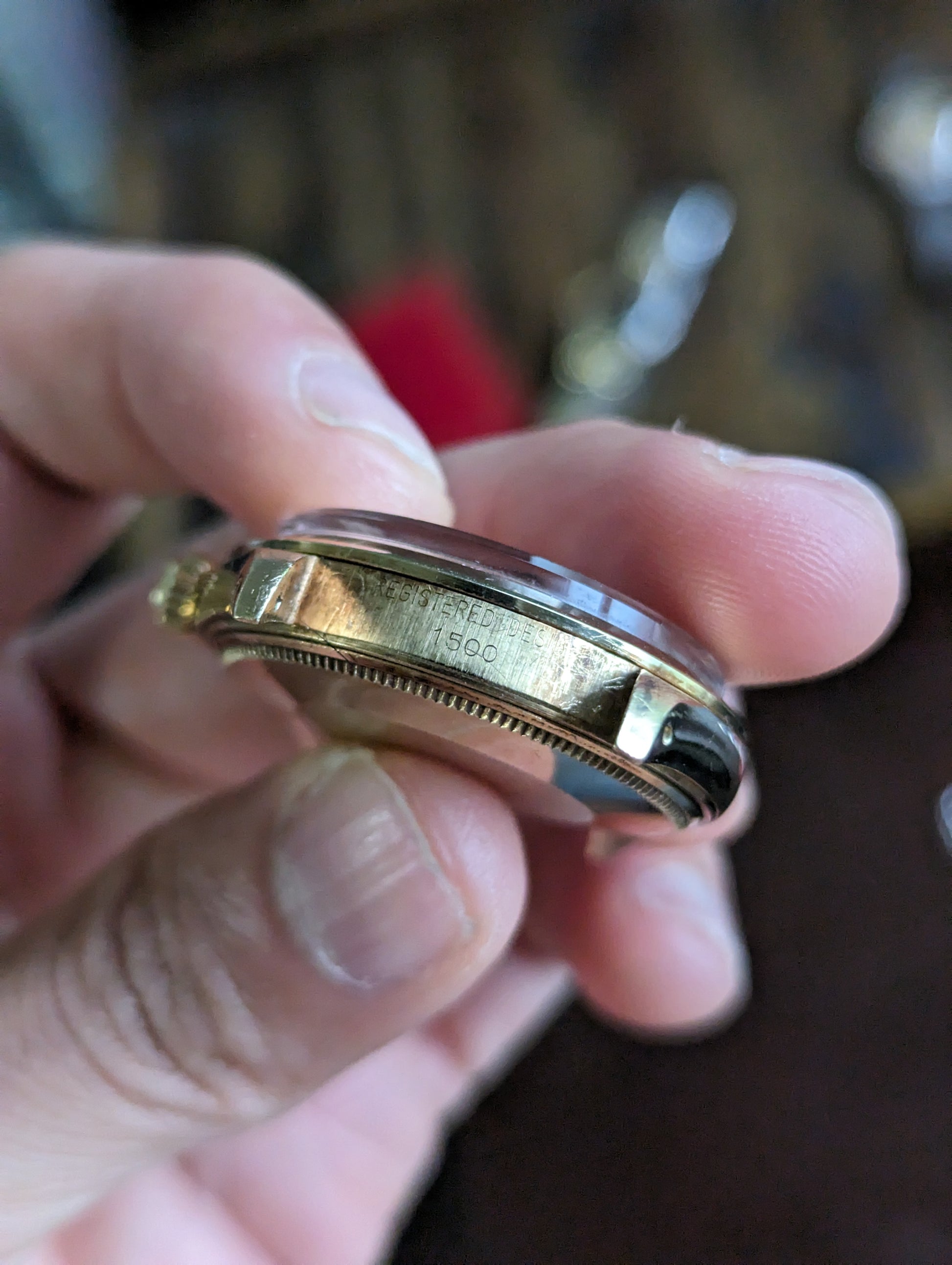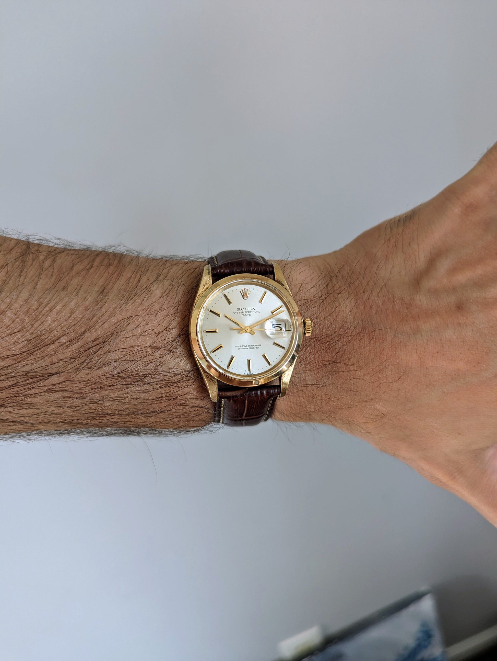 MOVEMENT: Rolex automatic self winding caliber 1575. The watch winds, sets, runs and keeps good time. Service history is unknown. The watch was placed on a timegrapher which illustrated the watch is gaining 1 seconds per day with an amplitude of 236. The watch can be serviced in house for approximately $300 + parts (if needed). If serviced the movement will have a one year warranty.