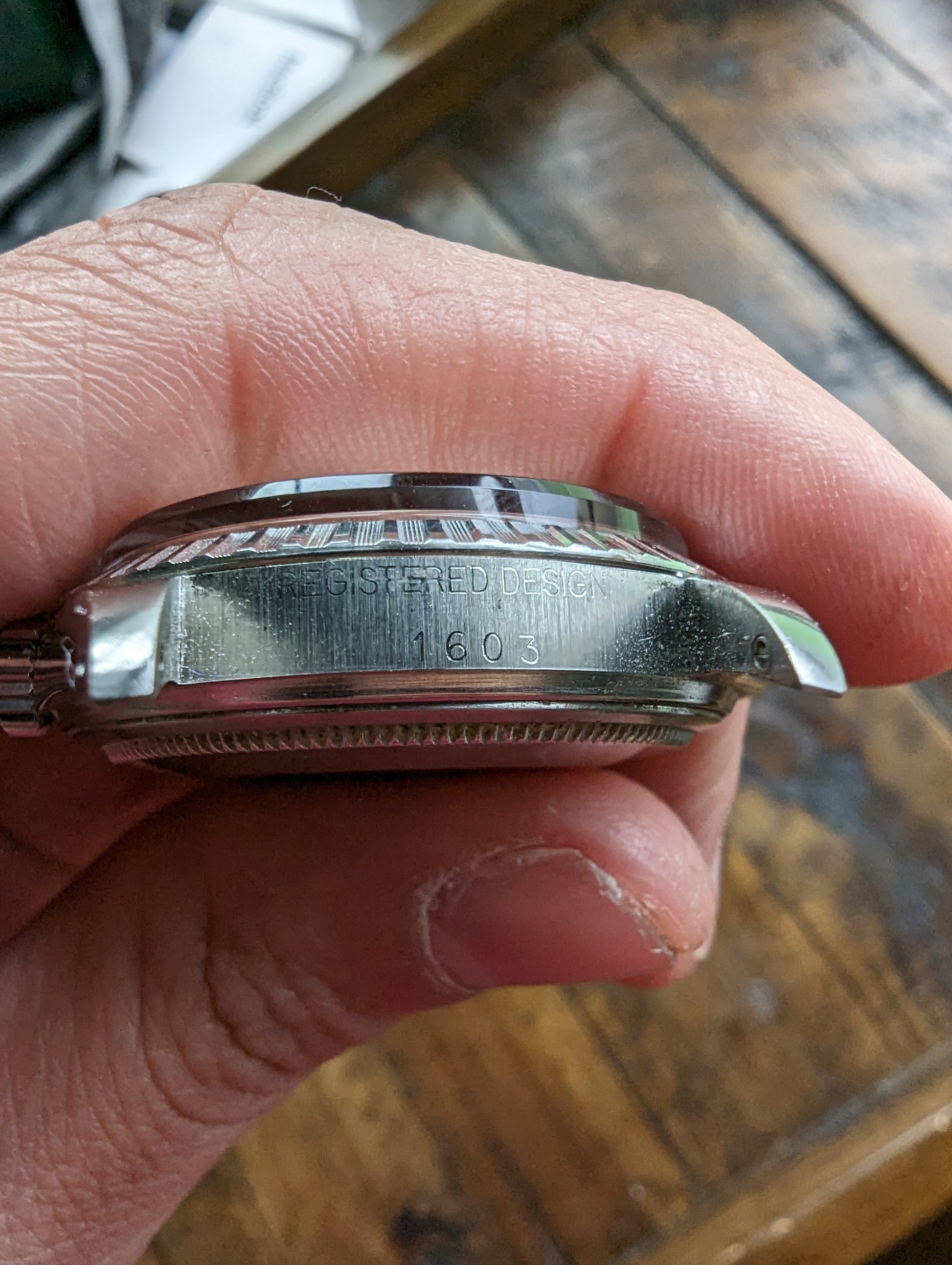 DIAL: This 1603 example sports an original, Rolex, non-luminous, sigma dial. Sigma dials are more rare than your run of the mill silver sunburst dials and denote the utilization of gold indices and hands. Rolex utilized this marking on the dial for specified period of time. This sigma dial is in wonderful condition and free from any noticeable blemishes, staining, patina or otherwise imperfections. It features its original, matching, non-luminous baton hands.