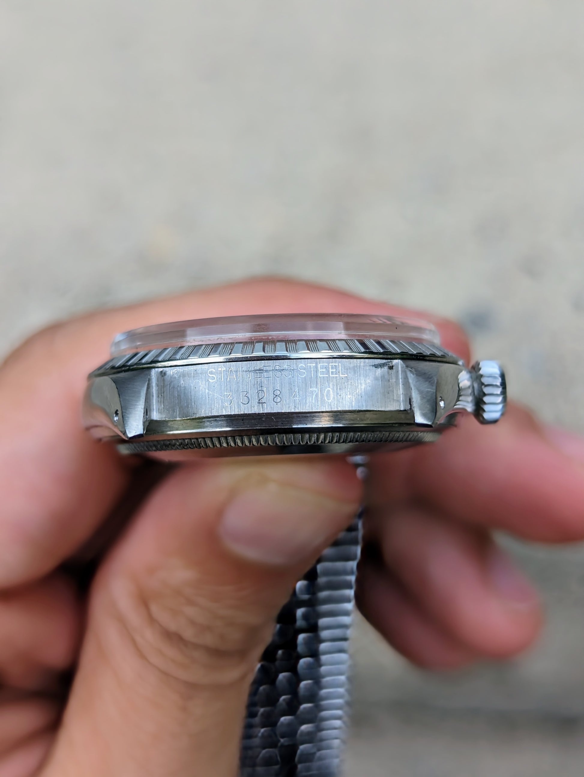 DIAL: The original silver sunburst dial is in great condition. The dial appears to be free of any staining, blemishes, scratches or otherwise imperfections. It sports baton style hour markers and hands.. The lume on the hands have aged to a dark custard and match the dial perfectly.