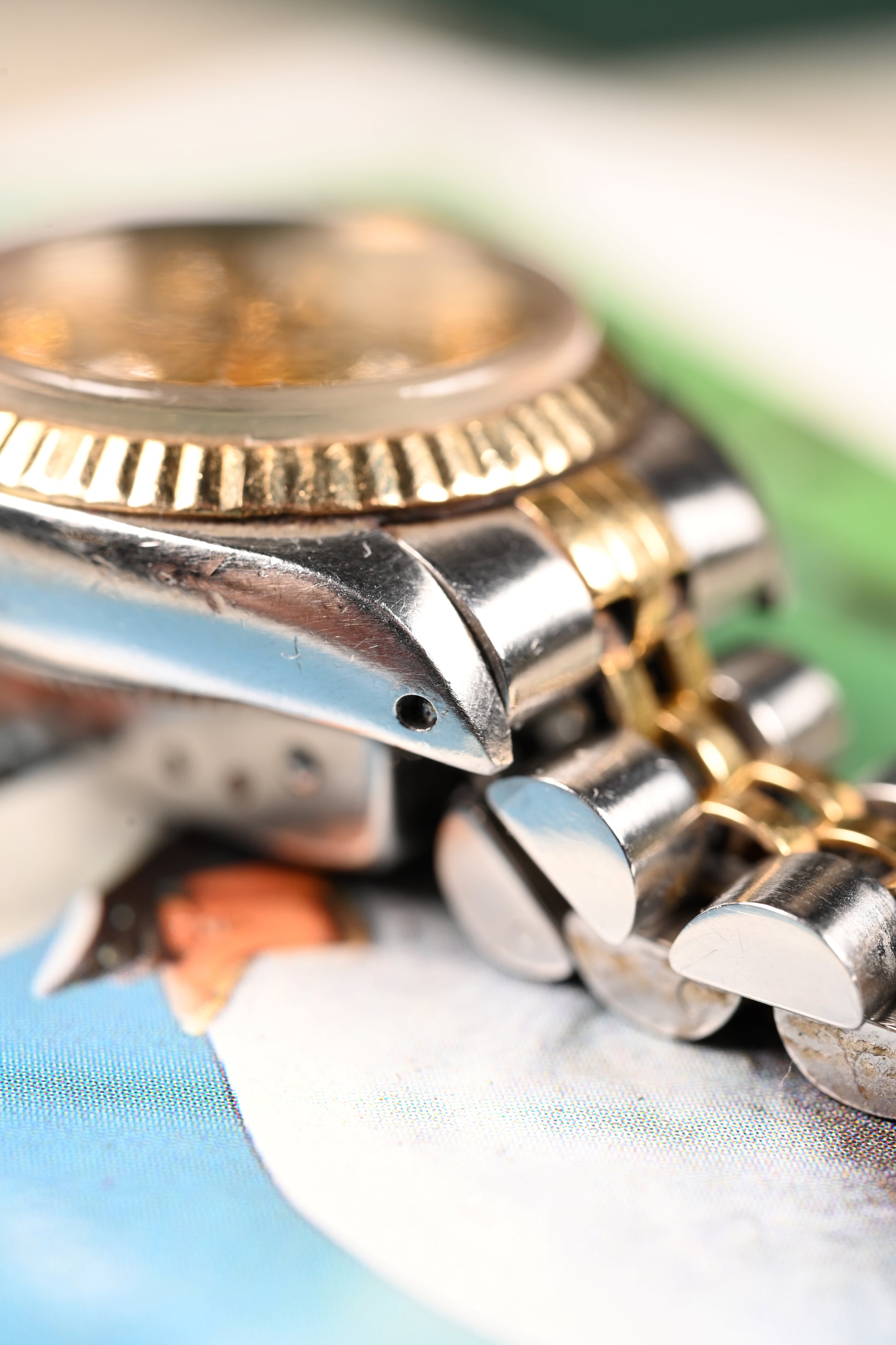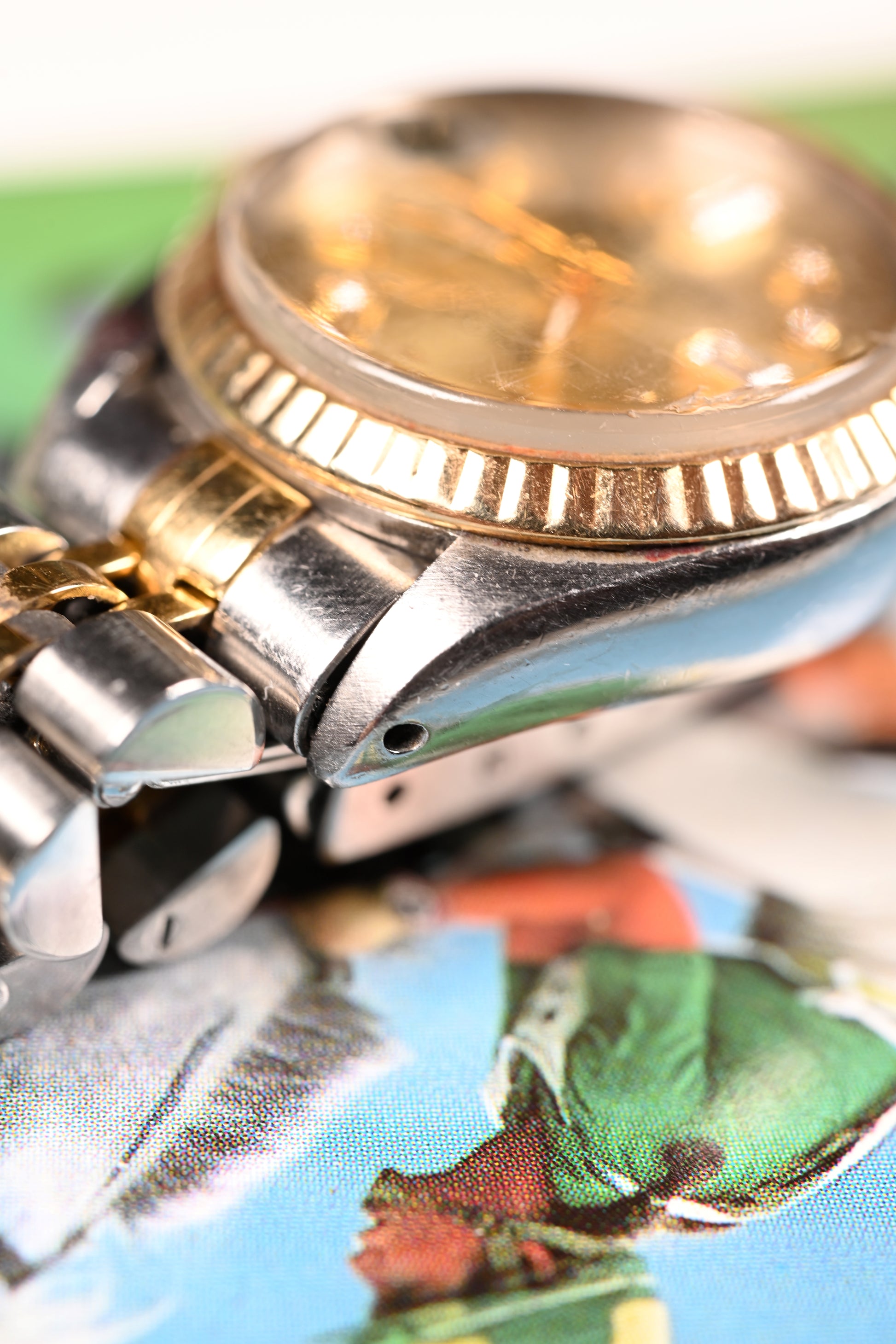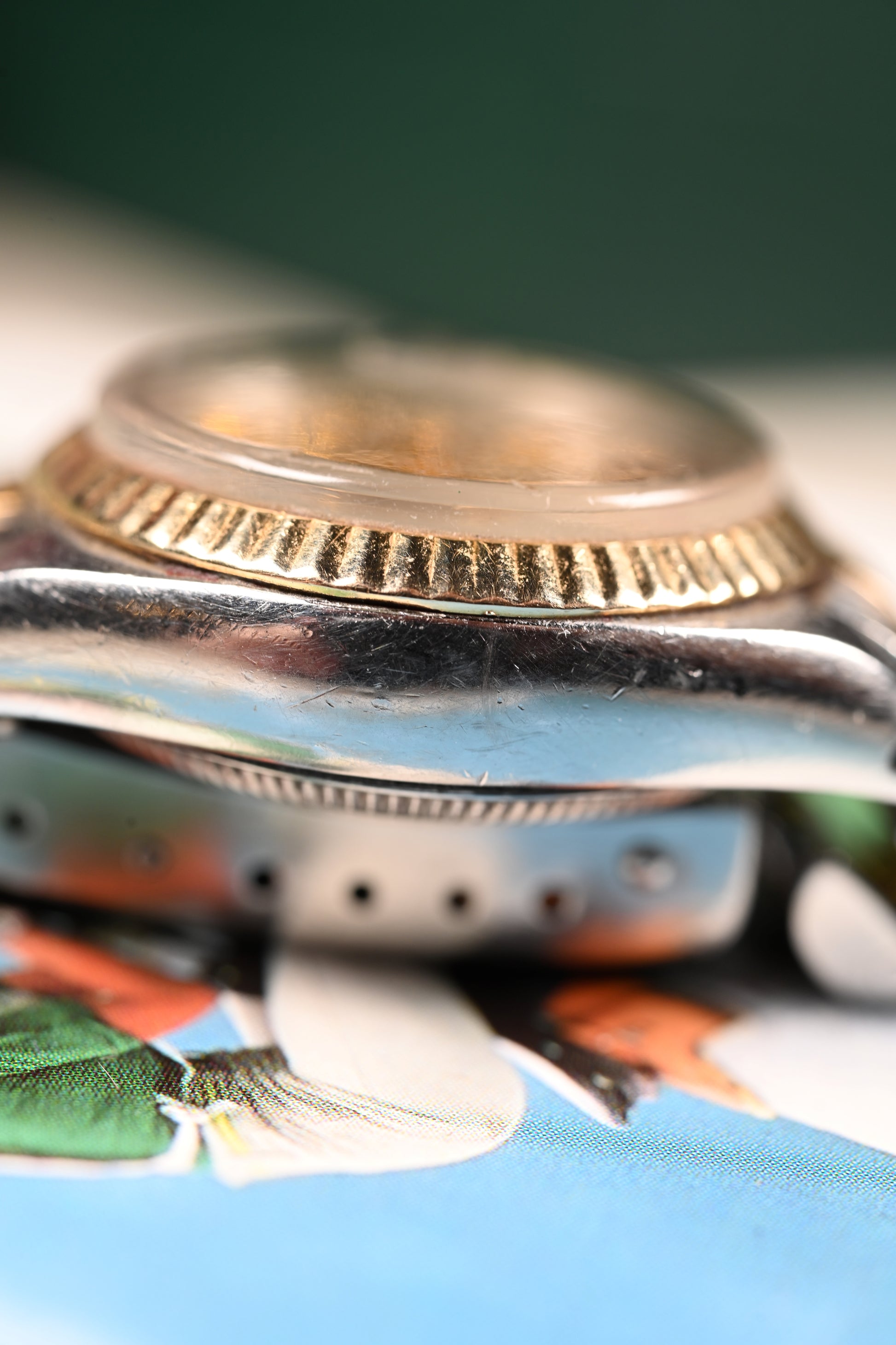 CASE: The two tone stainless steel and yellow gold case measures 26mm in diameter. It presents with light to moderate wear throughout. The cystal will be replaced prior to sale. It is completed by the watches original crown.