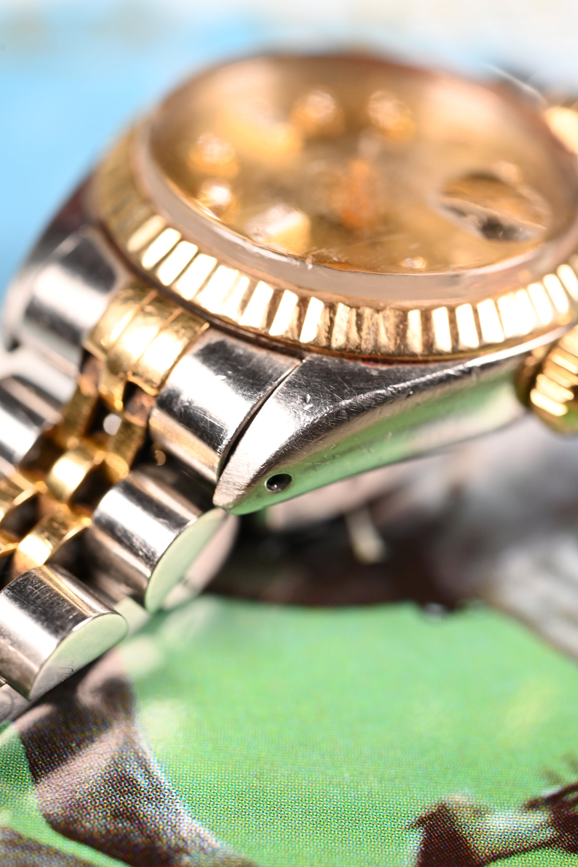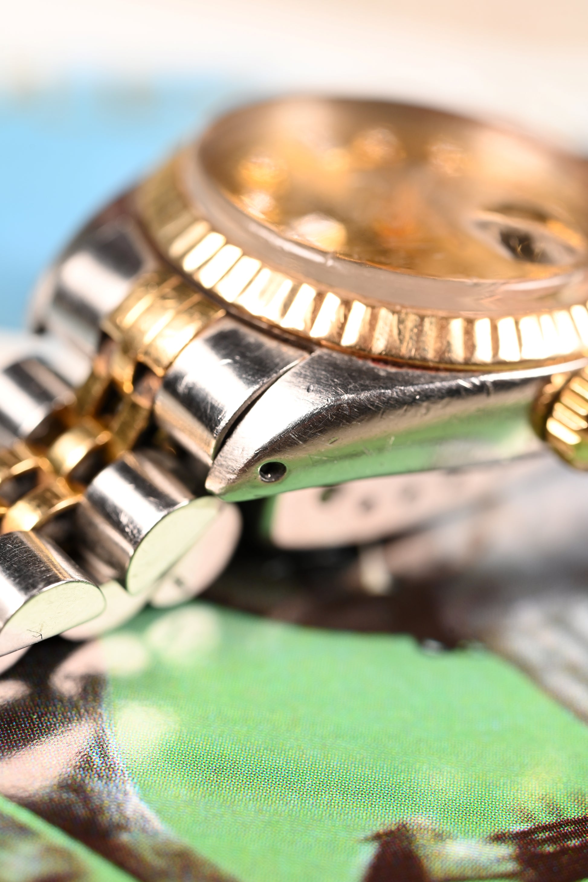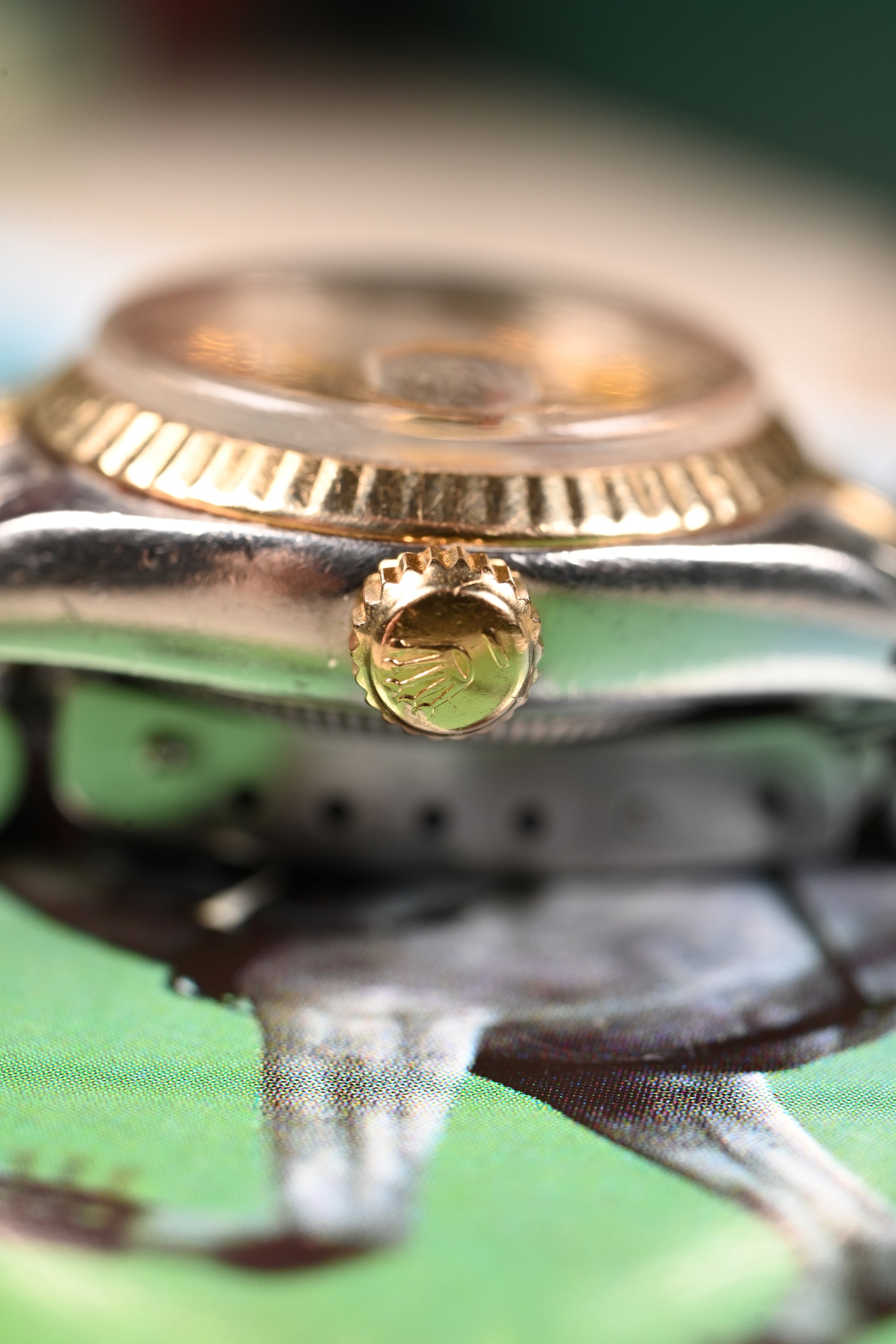 CASE: The two tone stainless steel and yellow gold case measures 26mm in diameter. It presents with light to moderate wear throughout. The cystal will be replaced prior to sale. It is completed by the watches original crown.