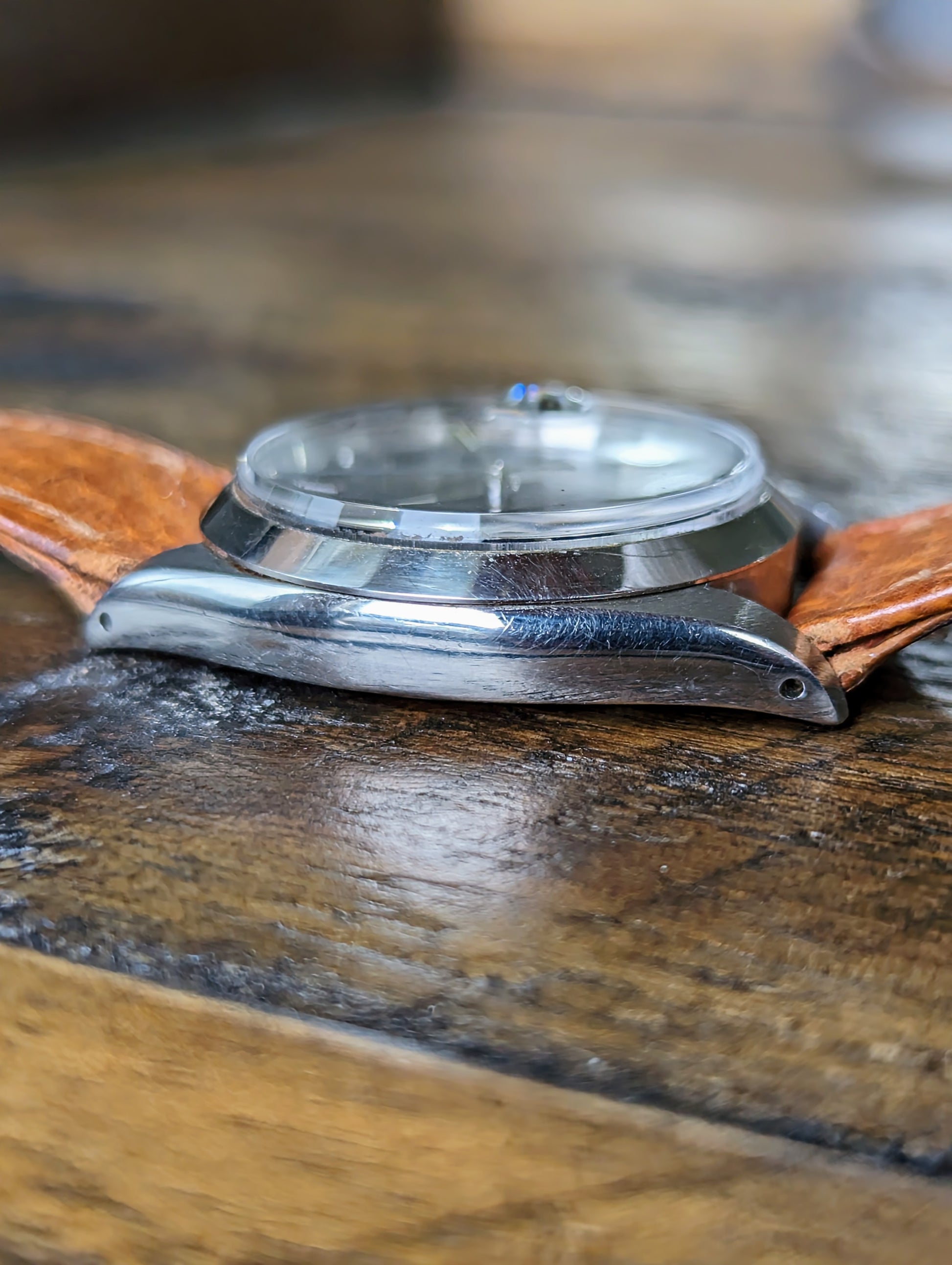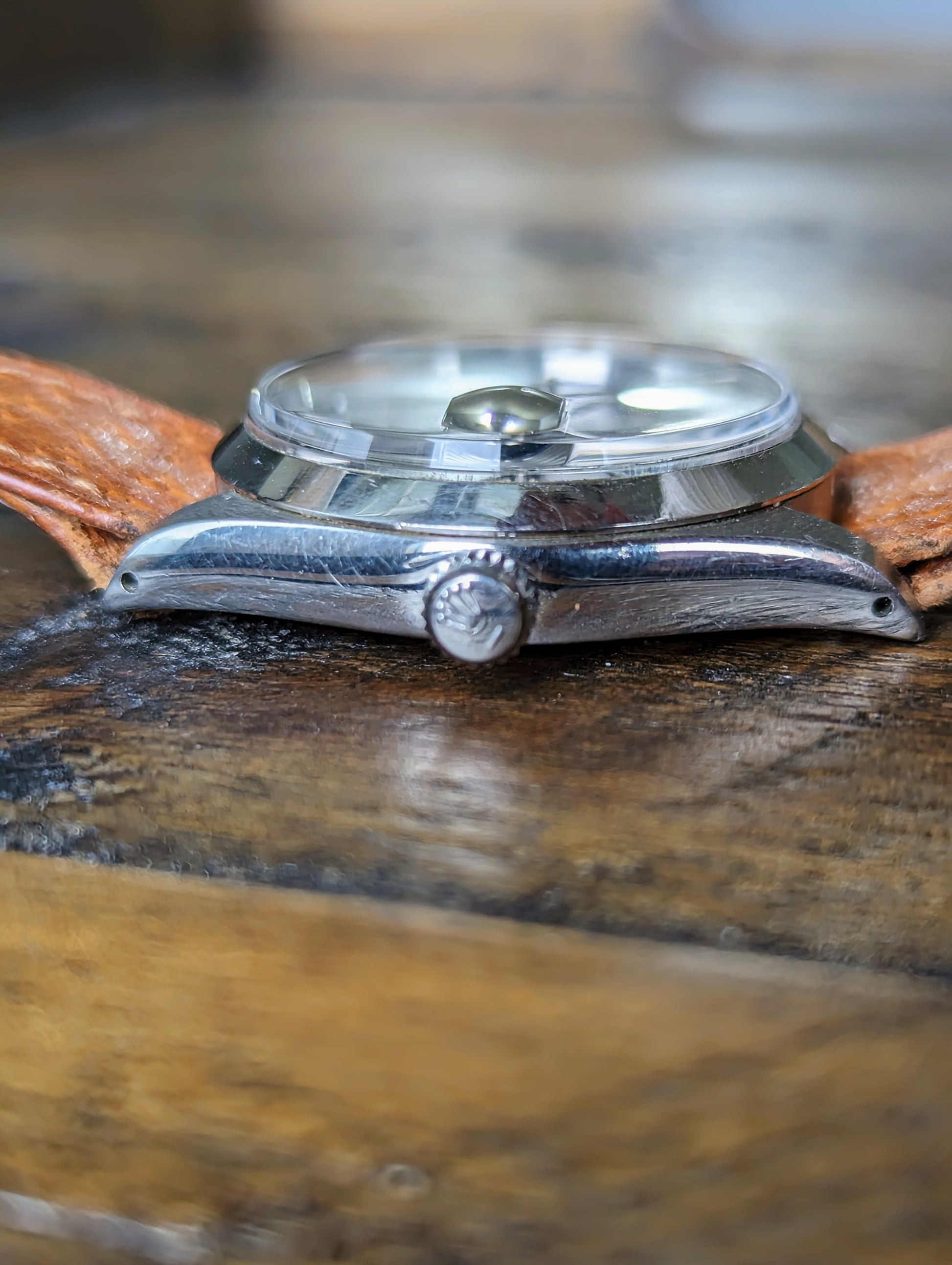DIAL:Â A beautiful blue sunburst dial. The issue with most vintage Rolex blue dials is they illustrate some sort of decay either around the hour markers or the lume. This one is nice and clean. A rare find. The hands have been relumed in the past. The dial is completed by baton style hour markers and hands.Â