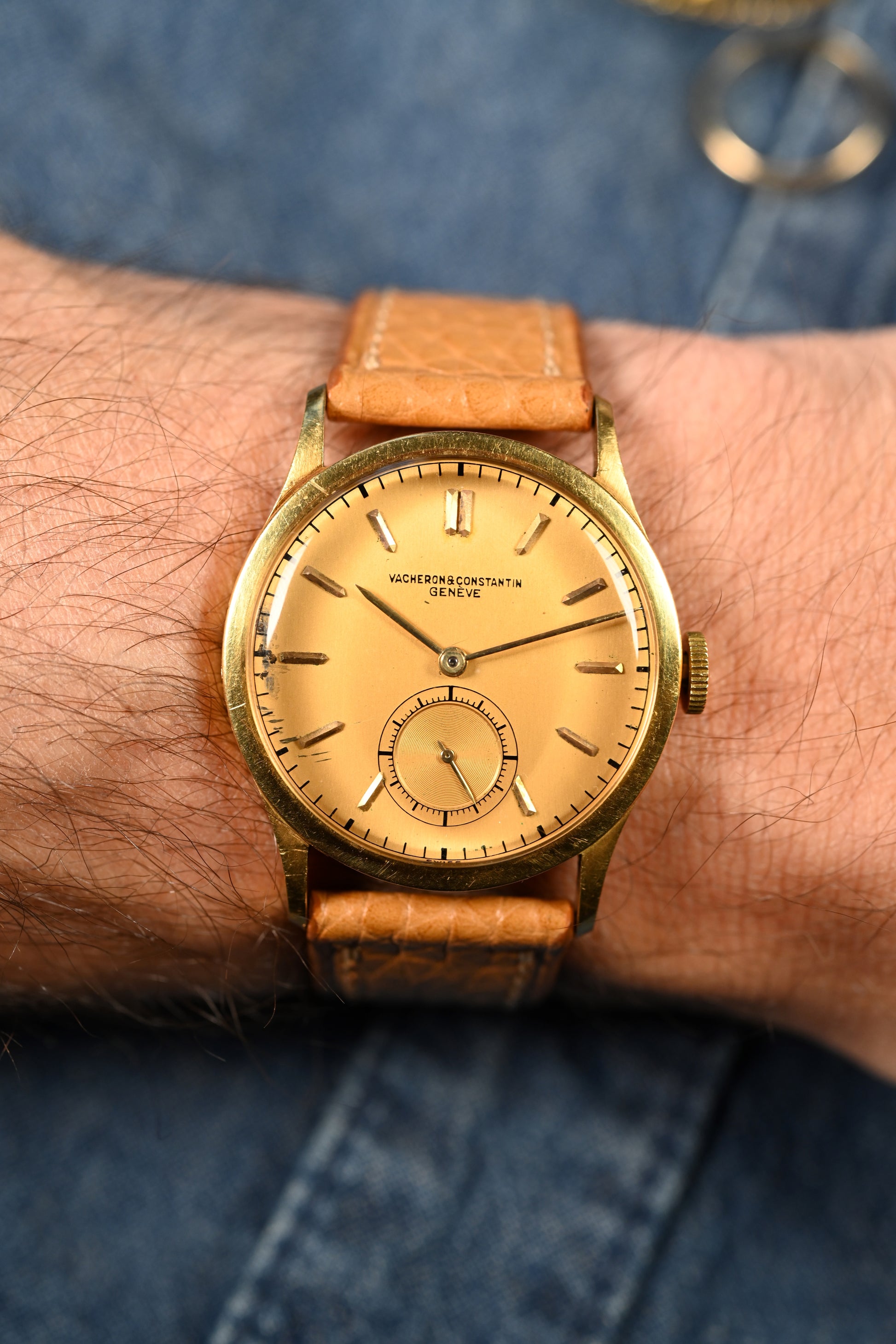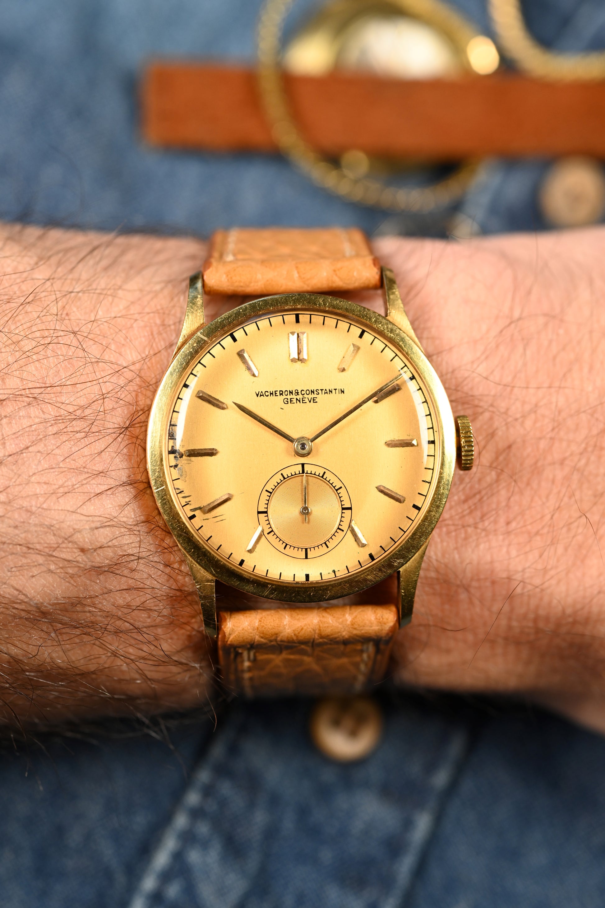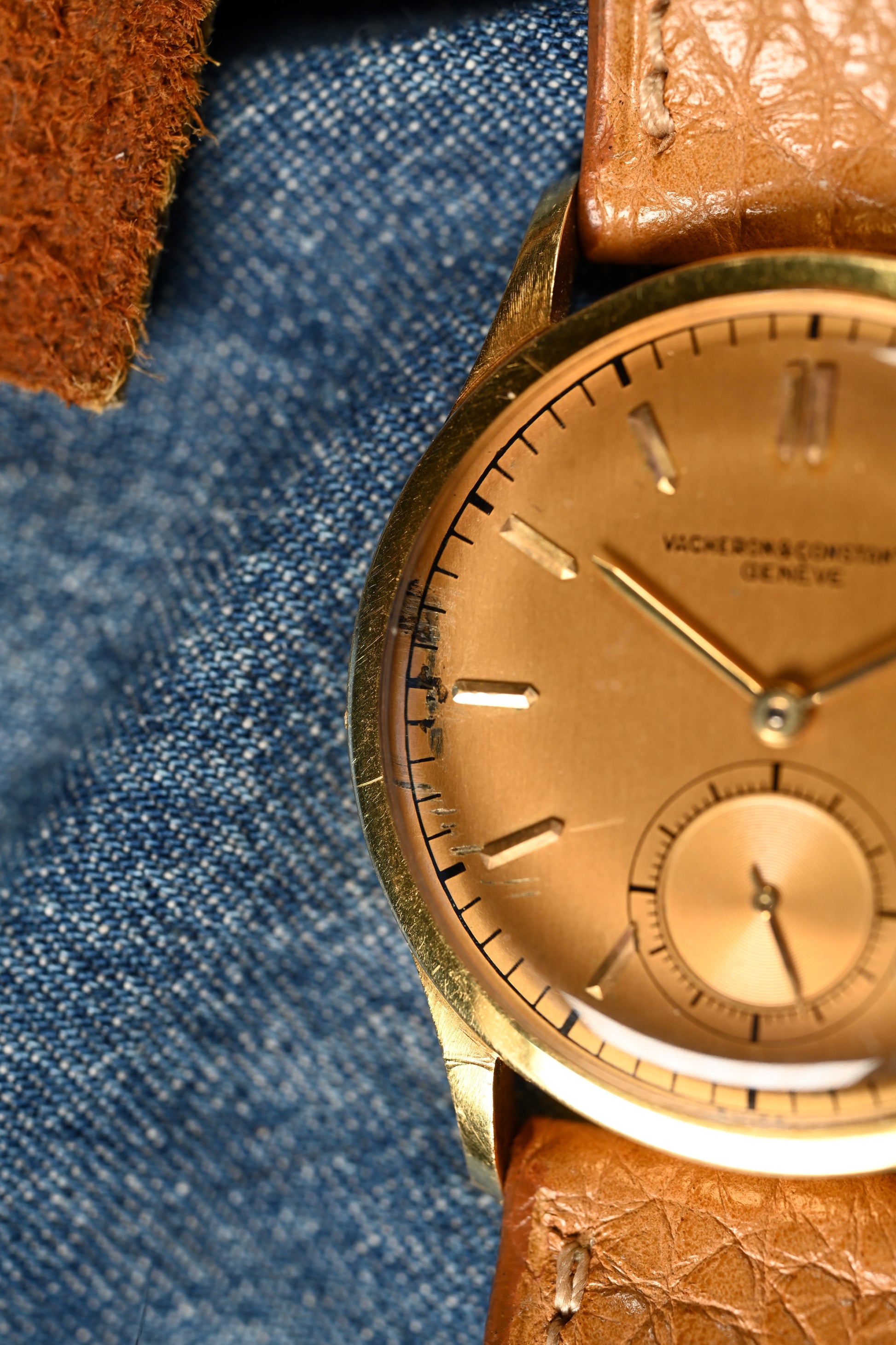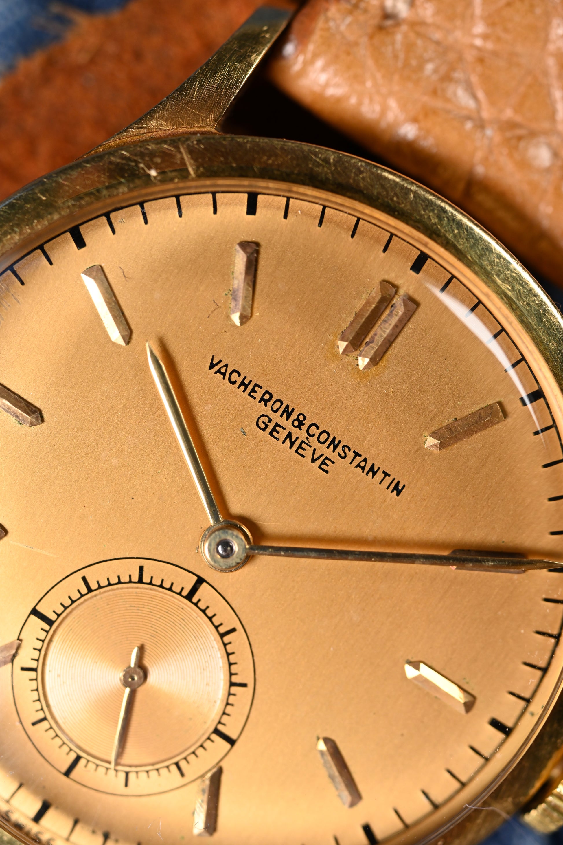 DIAL: An original, gold, engraved, enamel dial. The maisons signature "Vacheron & Constantin Geneve", the subsidiary seconds markers and outer minute track were done in engraved enamel. The dial exhibits no signs of cleaning. Noted between the 8 and 10 o'clock hour markers we can observe scratches on the dial that are exhibited in our detailed photographs. There is also one other small scratch visible next to the "G" in "Geneve" signature. Please note these marks are illustrated through 50mm macro lens and are much less noticeable on the wrist at normal wearing distances.