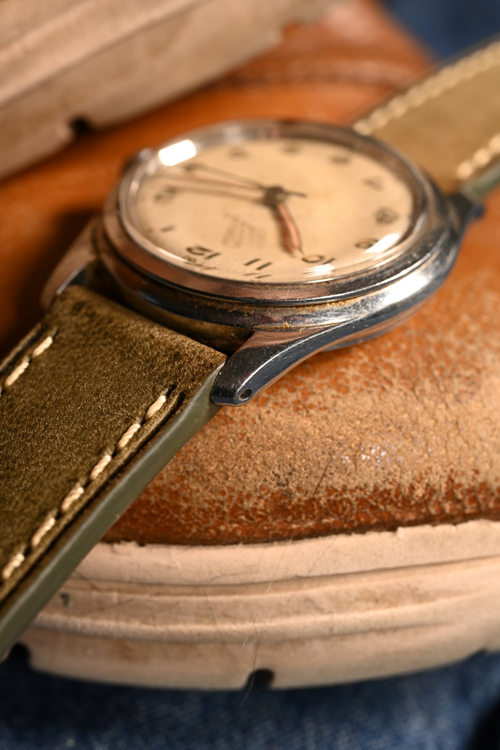 DIAL: The original silver dial has aged over time to an off white patina. It presents with rather even spotting throughout. It features printed Arabic numeral style hour markers and syringe hands. The radium lume on the dial has washed off in some places while the lume that the dial has retained has aged to a camo green. The lume in the syringe hands has patinated to a beautiful pastel orange.