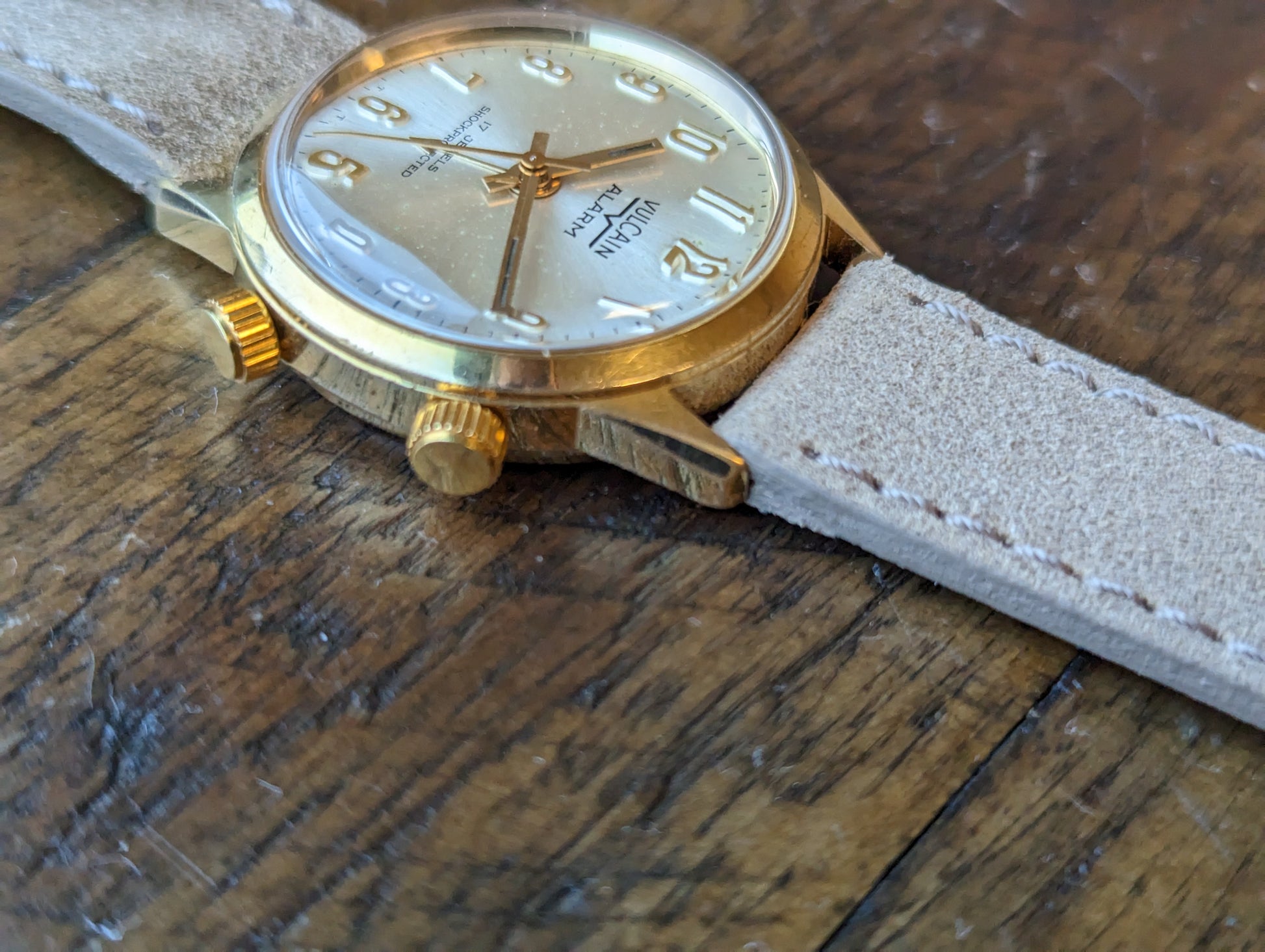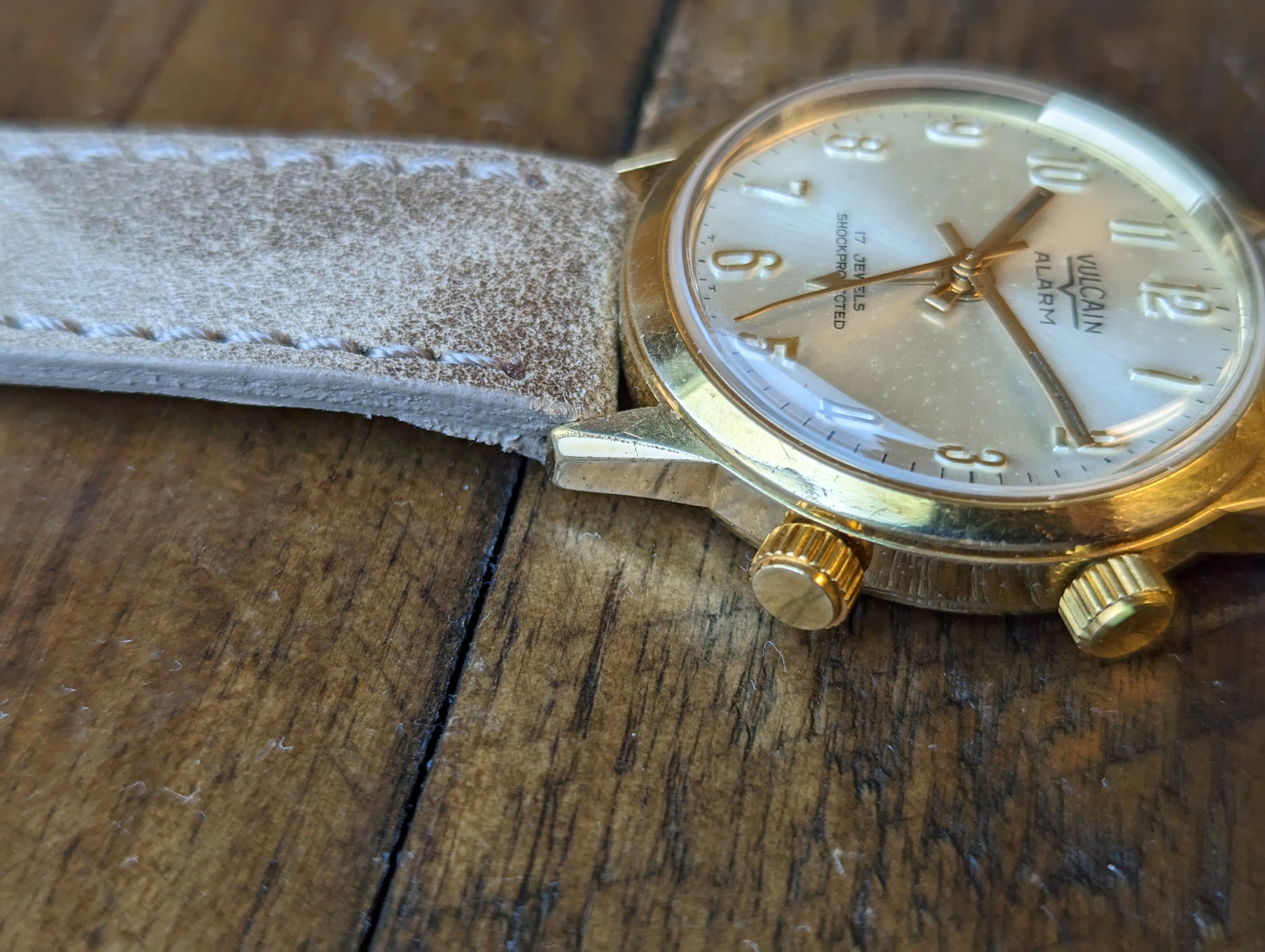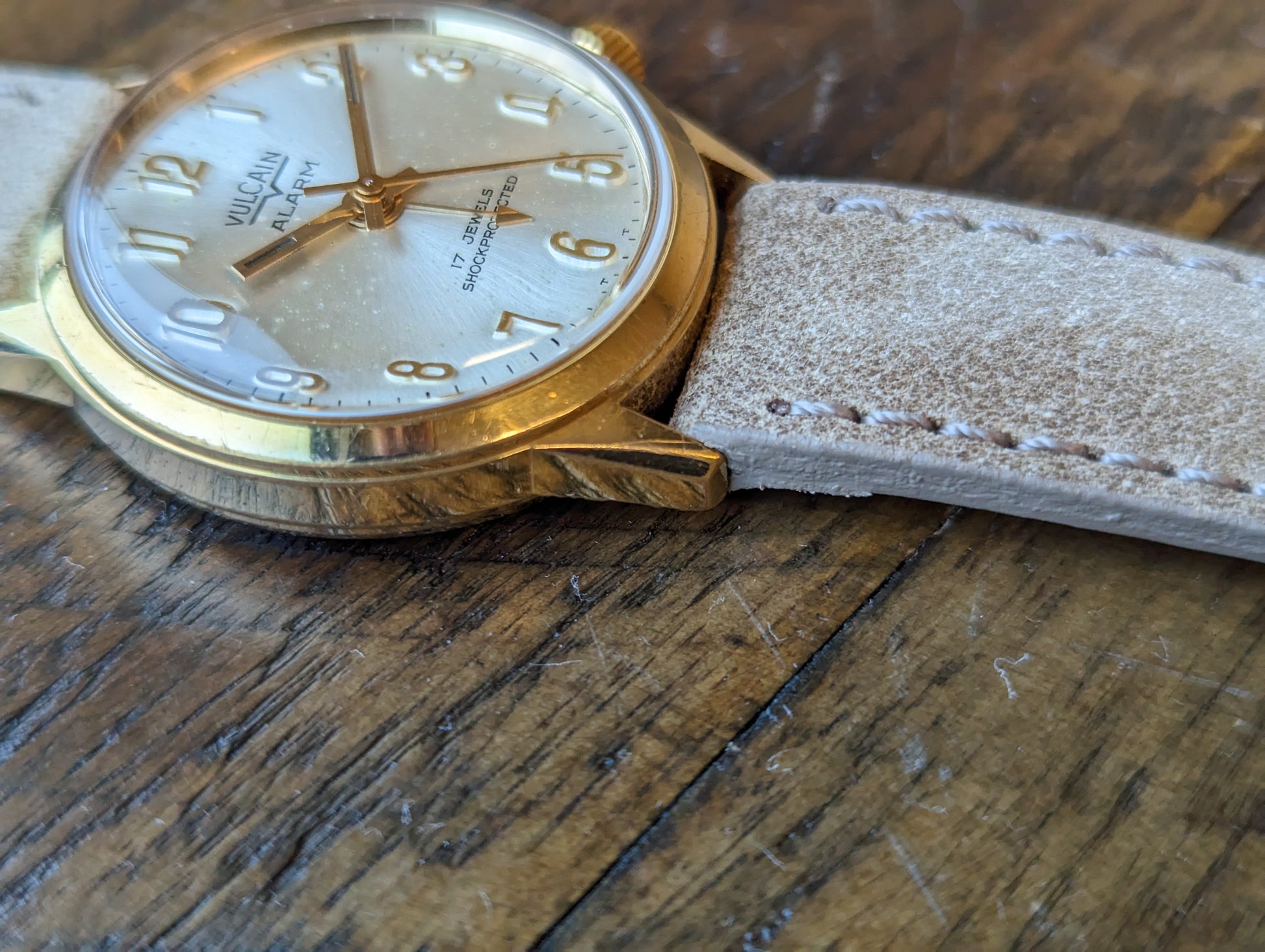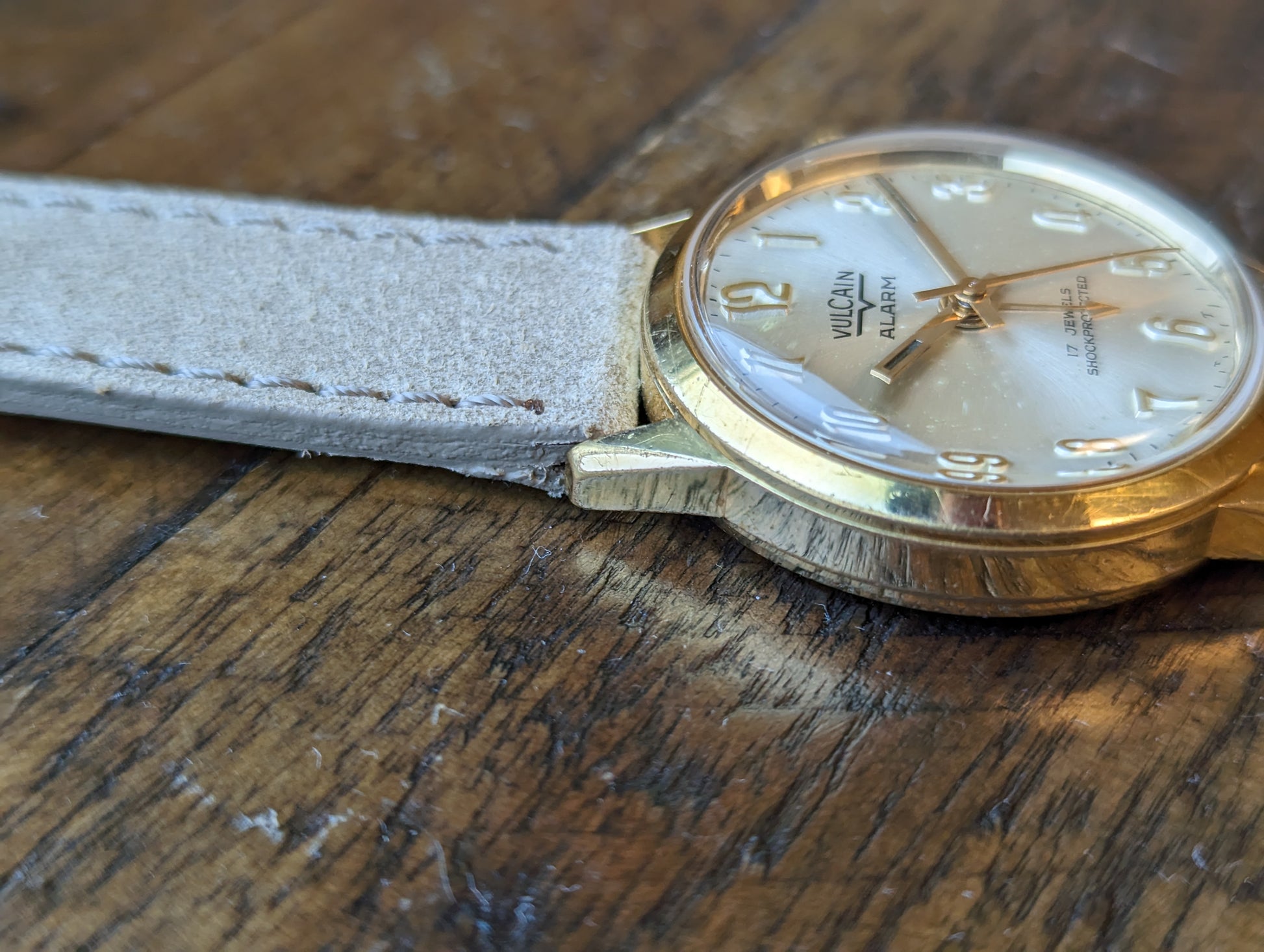MOVEMENT: Movement stamped "Vulcain Watch Co.- Unadjusted - Seventeen 17 jewels." The movement was last serviced in January of 2023. It currently winds, sets and runs. It is keeping good time. The alarm functions correctly.