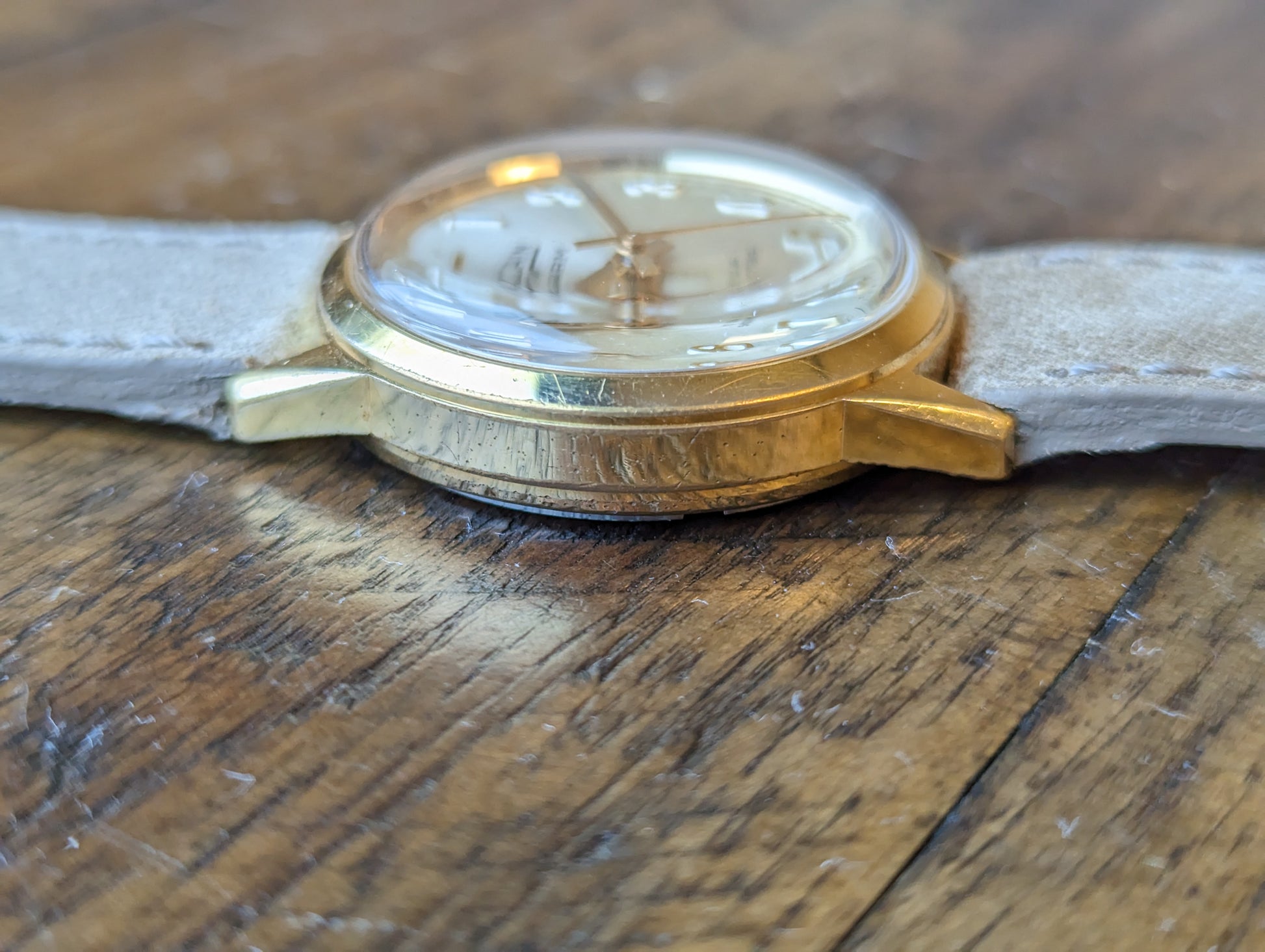 CASE: The 34mm base metal over stainless steel back is in good shape. The case shows wear throughout commensurate with its age. The bevels on all four lugs can still be appreciated. It features screw down case back and is 40mm lug to lug x 11mm thick.
